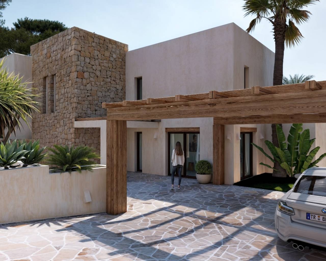 Lujosa villa de estilo ibicenco en construcción. Fecha de finalización: enero de 2027 Lujosa villa de estilo ibicenco. La propiedad cuenta con 437 m², incluyendo una terraza, en una parcela de 840 m², distribuida en dos plantas. La primera planta cuenta con un amplio salón con porche, una gran cocina abierta con isla central para mayor amplitud, un amplio dormitorio con vestidor, un baño en suite con bañera y ducha separada, y un aseo de invitados. El acceso directo desde la cocina y el salón-comedor conduce a la terraza, equipada con una gran pérgola, zona de barbacoa y vistas a la piscina infinita principal. La planta baja cuenta con cuatro dormitorios, cada uno con su propio baño en suite con ducha, una sala de estar, un lavadero, un gimnasio y una sala de cine. Tres de los dormitorios tienen acceso directo a su propia terraza privada, equipada con una pérgola que proporciona sombra y comodidad. Frente a este espacio se encuentra la segunda piscina, de forma asimétrica, perfectamente integrada en el diseño general. Finalmente, en la parte superior de la casa, se ha aprovechado el espacio para crear un solárium/terraza con un banco de obra y barbacoa. Toda la propiedad cuenta con aire acondicionado y calefacción por suelo radiante.
