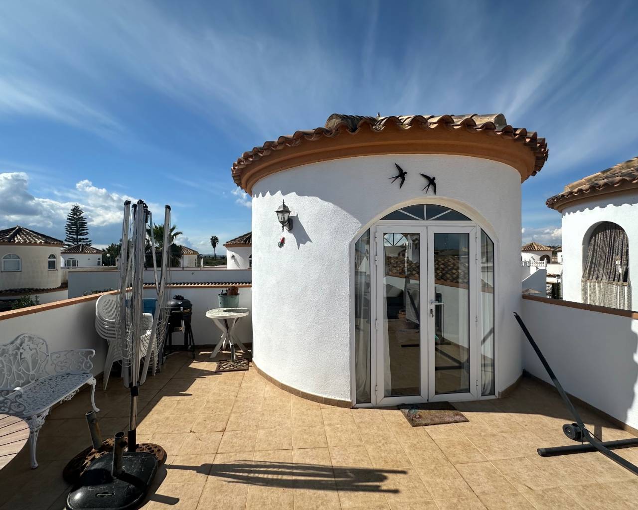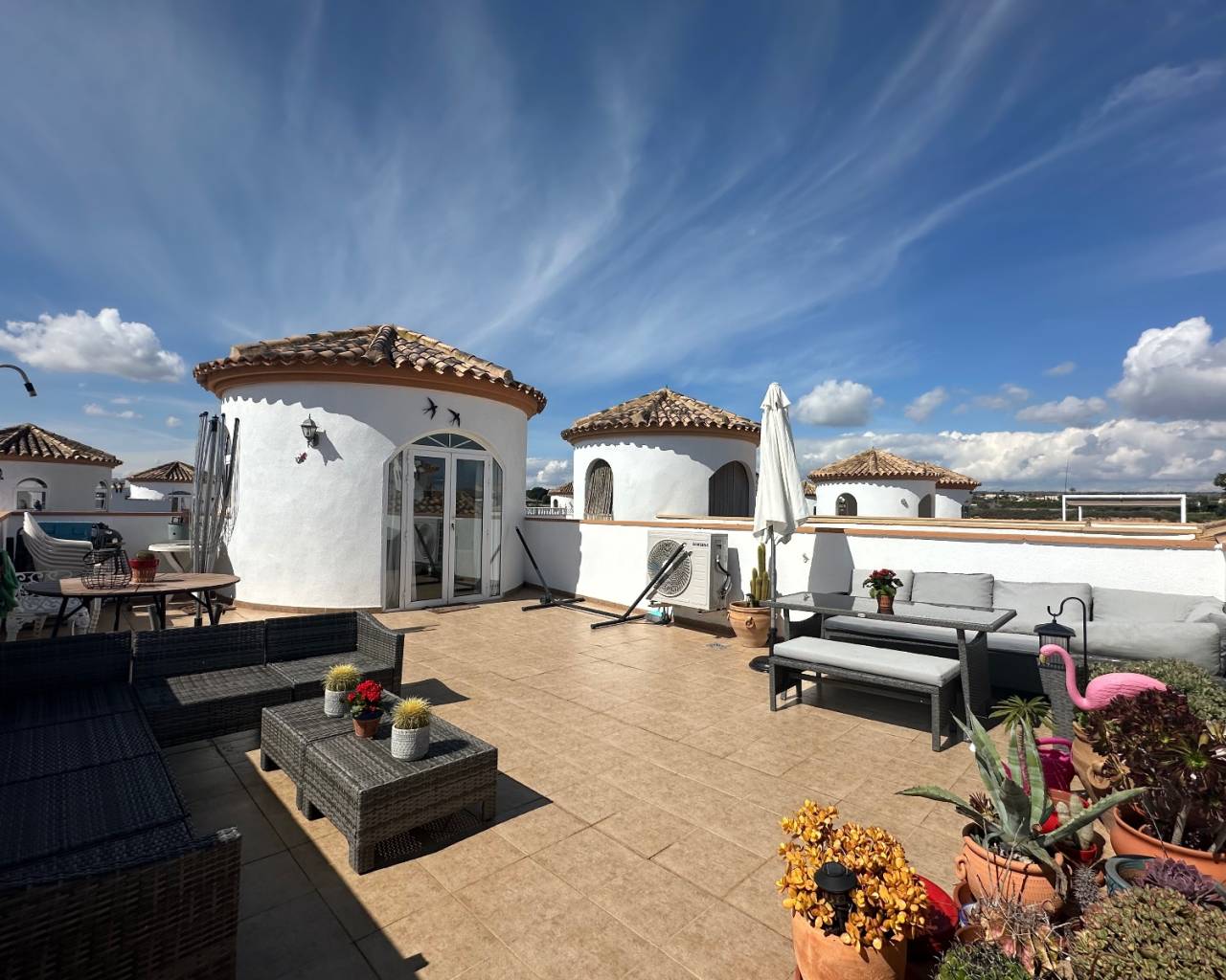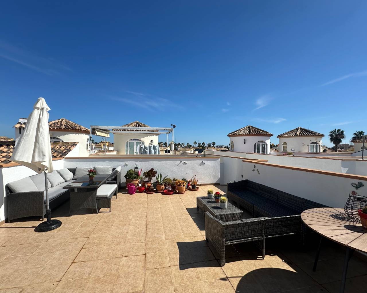 Unas escaleras exteriores conducen al solárium privado en la azotea , donde podrá disfrutar de hermosas vistas abiertas a las famosas salinas de Torrevieja . Esta terraza elevada ofrece un entorno ideal para tomar el sol, recibir invitados o simplemente relajarse mientras disfruta de la tranquilidad del entorno.