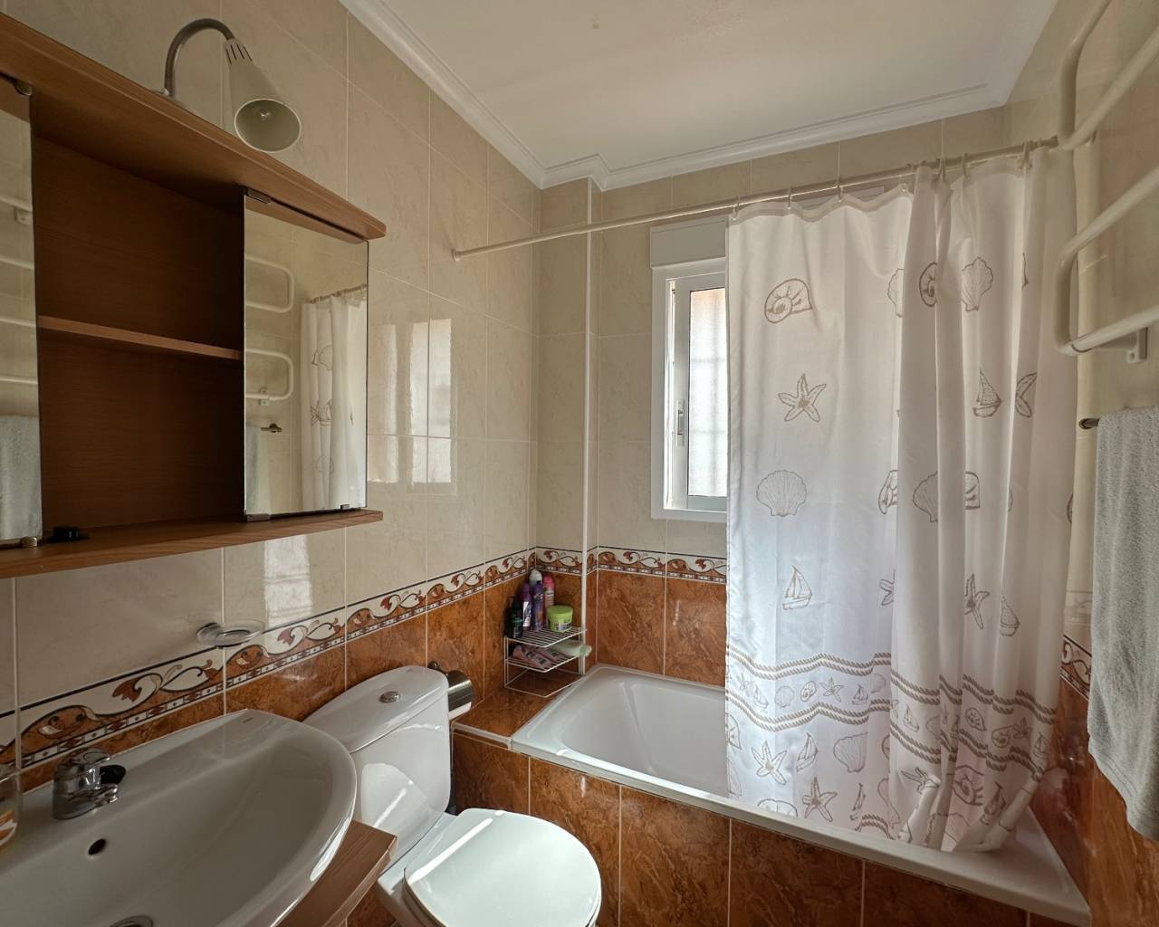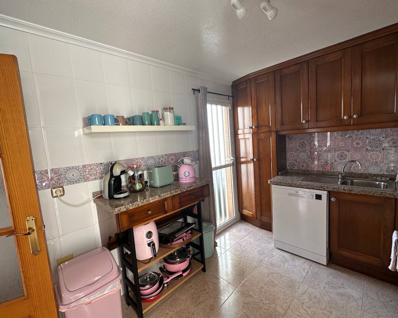La cocina, totalmente equipada, se conecta cómodamente a un lavadero cubierto, donde se encuentran la caldera y espacio de almacenamiento adicional. La distribución interior es práctica y cómoda, ideal para el día a día o para largas vacaciones en la Costa Blanca.