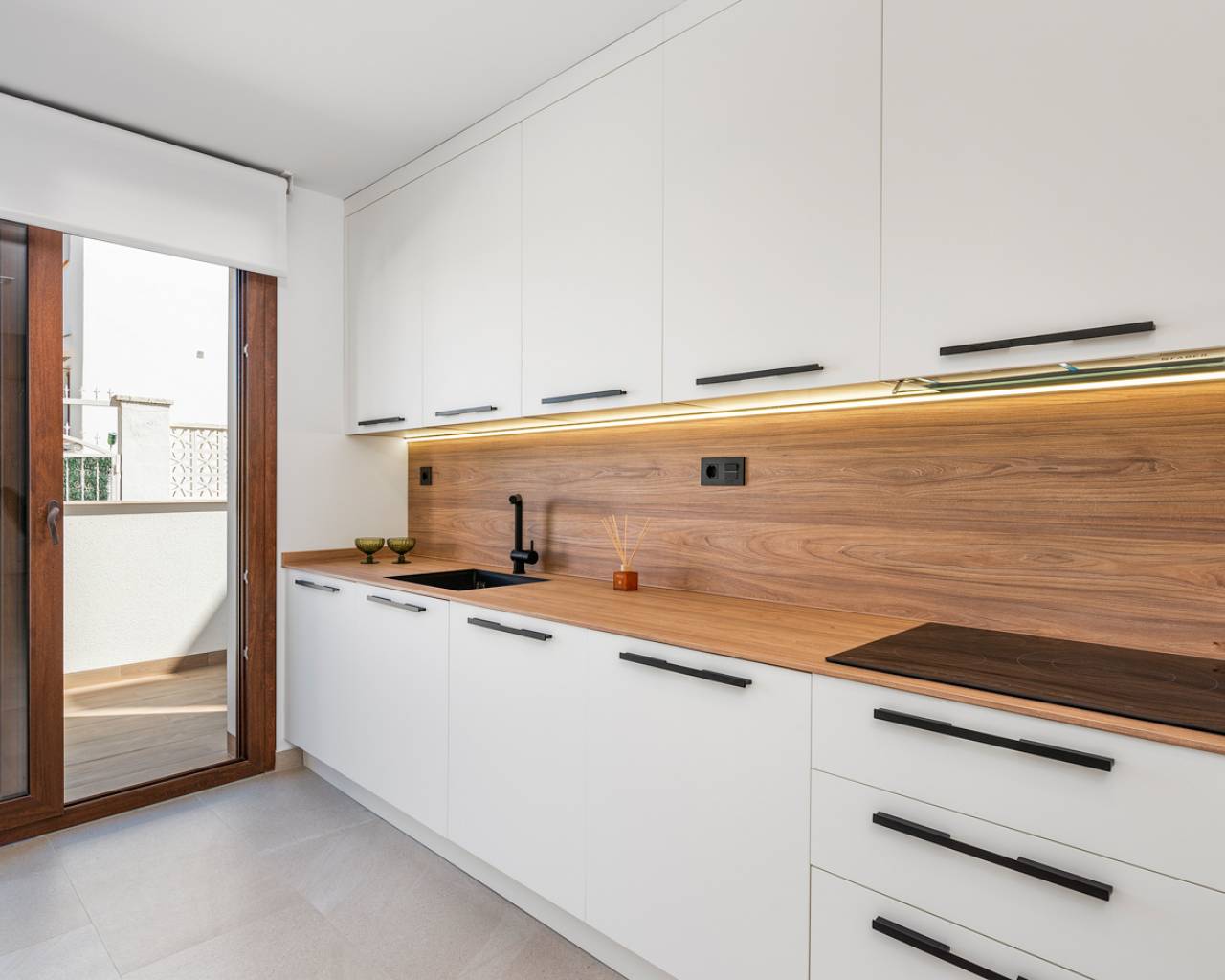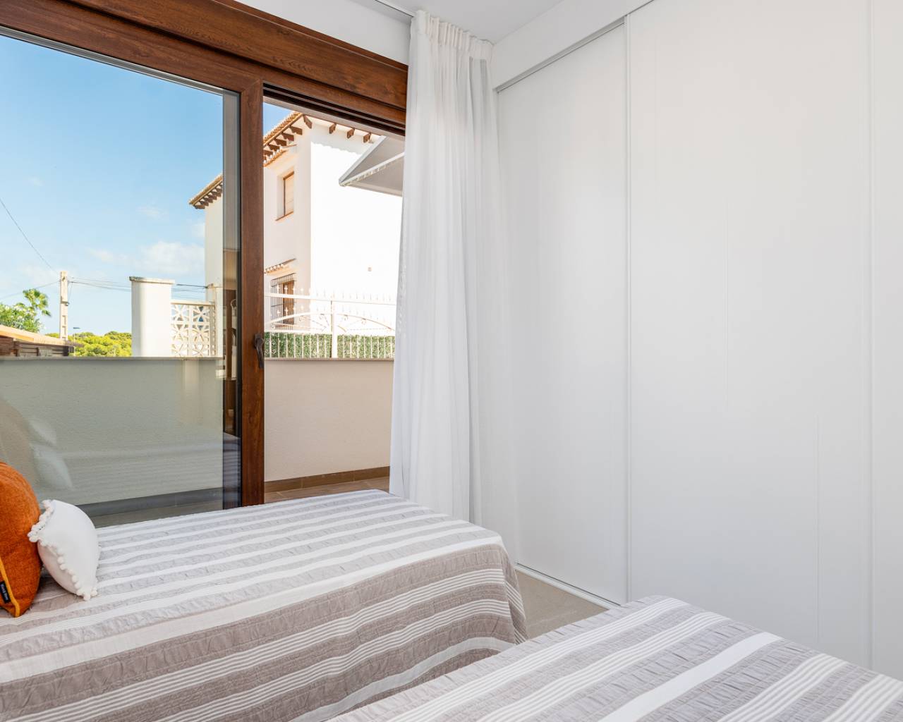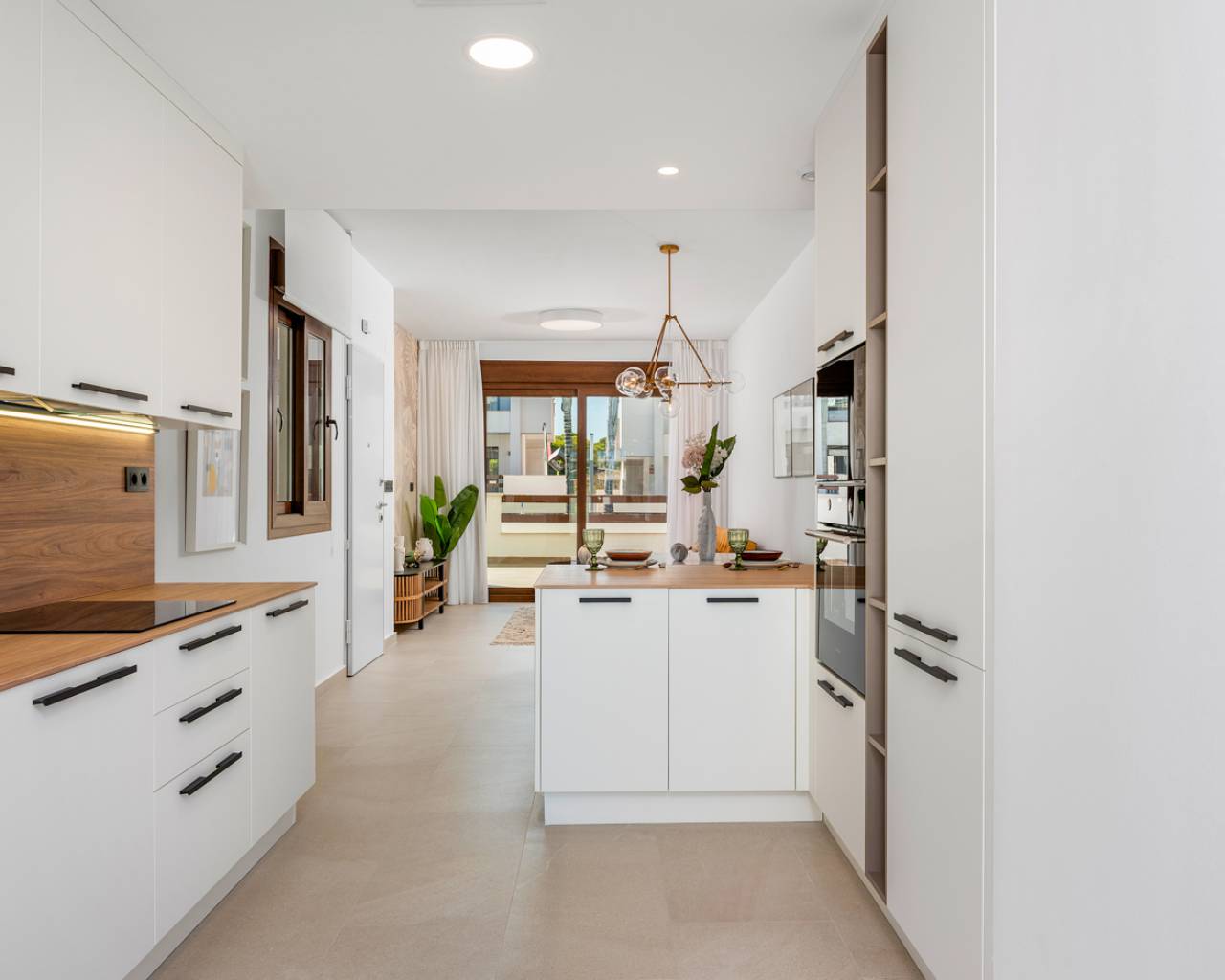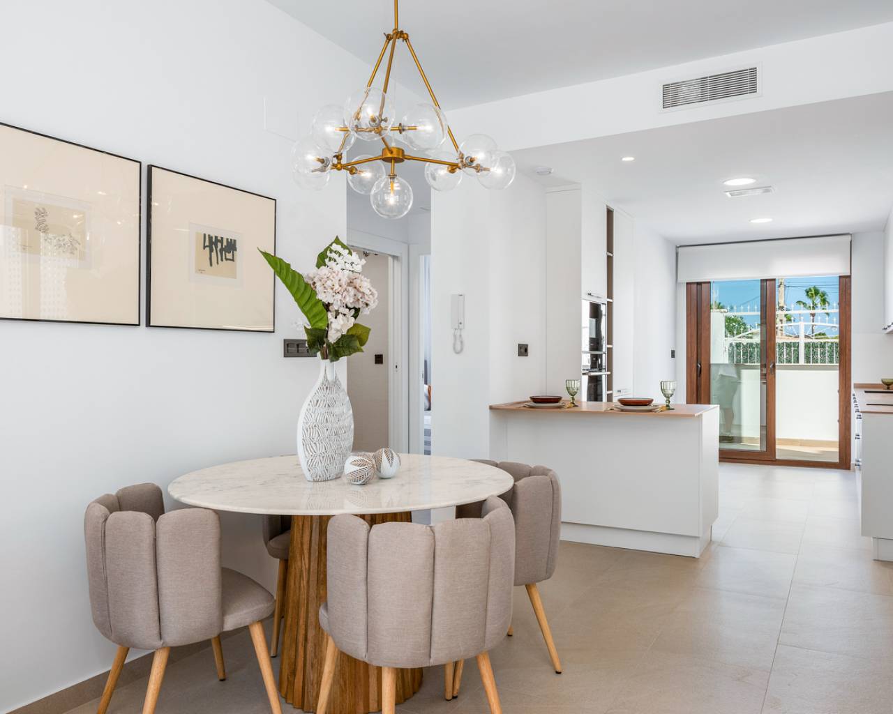 Los exteriores de estas propiedades están pensados para maximizar el disfrute del clima mediterráneo. Cada vivienda cuenta con una terraza privada, ideal para relajarse al aire libre. Además, los bungalows disponen de un solárium, perfecto para tomar el sol en la privacidad de tu hogar. La presencia de una pérgola añade un toque de elegancia y funcionalidad, proporcionando sombra y estilo. Las zonas comunes incluyen jardines bien cuidados, que ofrecen un entorno verde y tranquilo para pasear o descansar.