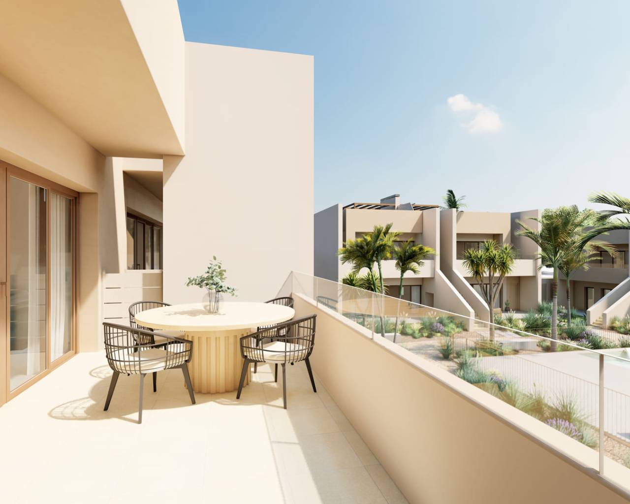 Los exteriores de este residencial en San Javier están diseñados para maximizar el disfrute del clima mediterráneo. Cada bungalow cuenta con un jardín privado, ideal para relajarse o disfrutar de actividades al aire libre. Las terrazas amplias ofrecen un espacio adicional para el ocio, permitiendo disfrutar de las vistas y del entorno. Además, los solariums proporcionan un lugar perfecto para tomar el sol en la privacidad de tu hogar. La cercanía al mar, a solo 5 km, añade un atractivo adicional para quienes disfrutan de la brisa marina y las actividades acuáticas.