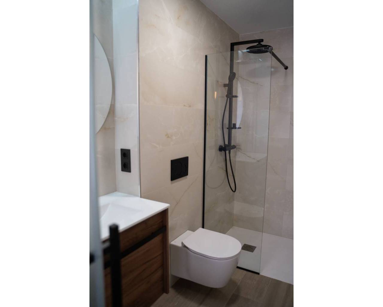 El interior de estas viviendas combina funcionalidad y estilo. Los suelos de gres porcelánico aportan un toque moderno y son fáciles de mantener. Las persianas eléctricas y los armarios empotrados son características estándar que añaden comodidad y espacio de almacenamiento. La preinstalación de aire acondicionado asegura que las viviendas estén preparadas para la instalación de sistemas de climatización, adaptándose a las necesidades de confort de cada propietario. La distribución de las viviendas está pensada para ofrecer espacios amplios y luminosos, con una clara separación entre las áreas de día y de noche.
