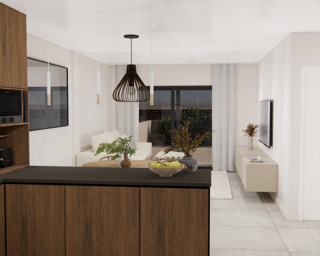 El interior de los bungalows está diseñado para ofrecer funcionalidad y comodidad. Con dos dormitorios y dos baños, cada espacio está optimizado para el confort diario. Las persianas eléctricas y los electrodomésticos incluidos facilitan la vida moderna, mientras que los armarios empotrados proporcionan un almacenamiento eficiente. La preinstalación de aire acondicionado asegura que el hogar esté preparado para mantener una temperatura agradable durante todo el año. Además, la presencia de un garaje ofrece comodidad y seguridad para el estacionamiento del vehículo.