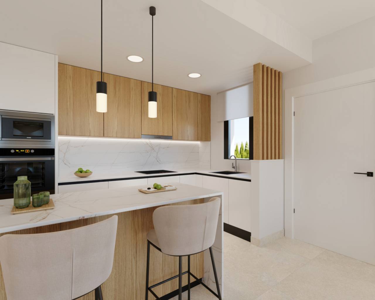 Las viviendas están equipadas con suelos de gres porcelánico, que combinan durabilidad y estética moderna. Los armarios empotrados en los dormitorios ofrecen soluciones de almacenamiento prácticas y elegantes. La preinstalación de aire acondicionado asegura que el confort climático esté garantizado durante todo el año. Además, el sistema de videoportero proporciona un nivel adicional de seguridad y comodidad. Con configuraciones de 2 o 3 dormitorios y 2 baños, estas viviendas están diseñadas para ofrecer un espacio funcional y acogedor, adaptándose a las necesidades de diferentes tipos de familias.
