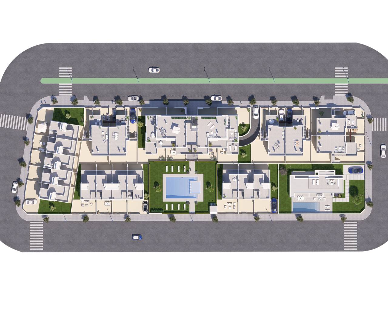 El interior de las viviendas está diseñado con un enfoque en la comodidad y la funcionalidad. Los suelos de gres porcelánico aportan un acabado elegante y duradero. Las viviendas están equipadas con aire acondicionado, garantizando un ambiente agradable durante todo el año. Las persianas eléctricas y los electrodomésticos incluidos facilitan el día a día, mientras que los armarios empotrados ofrecen un espacio de almacenamiento eficiente. La distribución de las propiedades incluye opciones de 2 y 3 dormitorios, todos con 2 baños, adaptándose a diferentes necesidades familiares.