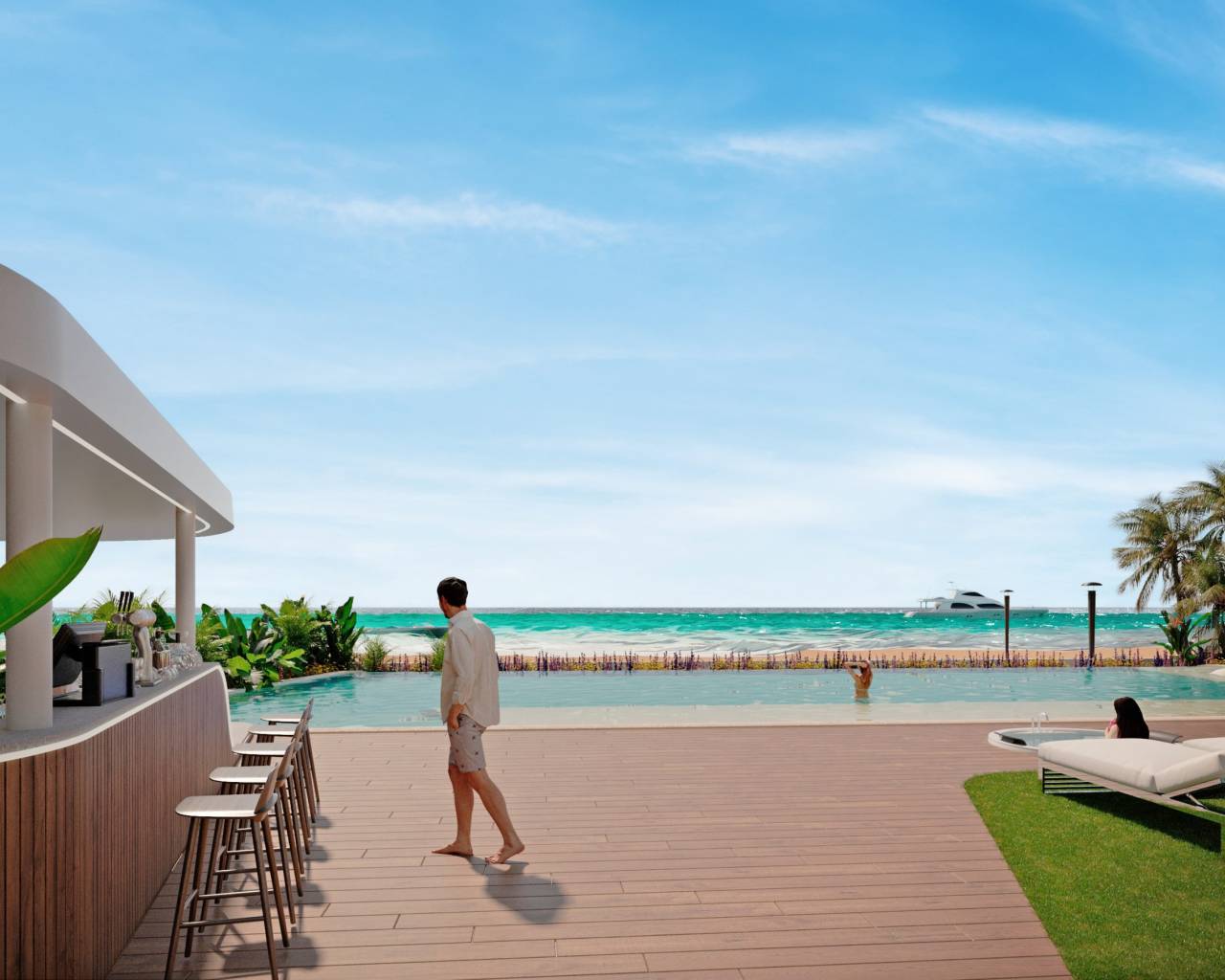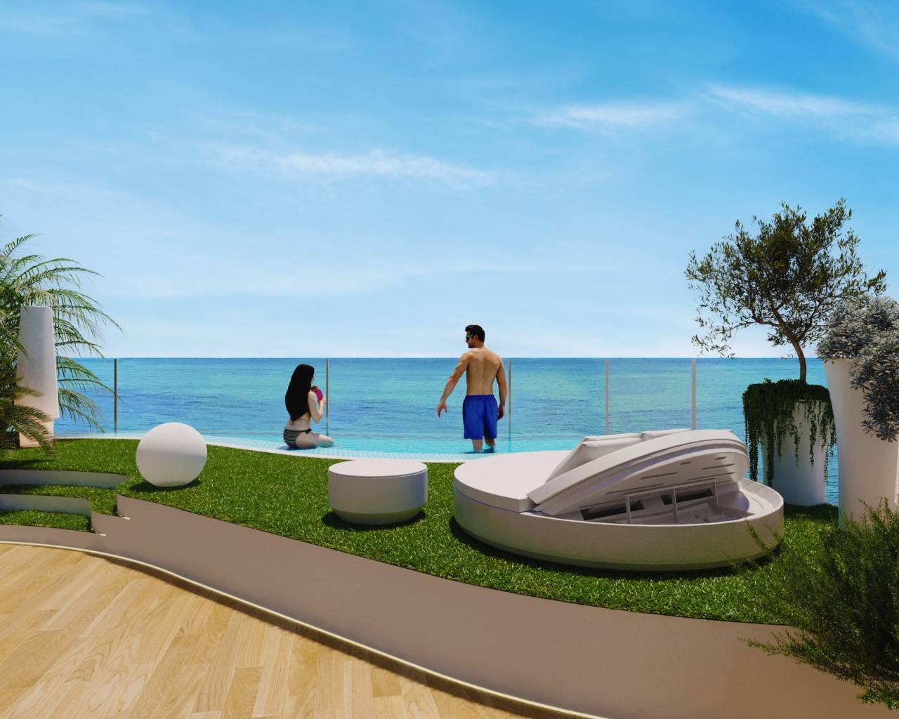 Los exteriores de este residencial están diseñados para maximizar el disfrute del entorno natural. Cada propiedad cuenta con un jardín privado, ideal para relajarse al aire libre. Las terrazas amplias ofrecen un espacio adicional para disfrutar de las vistas al mar y del clima mediterráneo. Además, algunas tipologías incluyen un solárium, proporcionando un espacio exclusivo para tomar el sol o disfrutar de momentos de tranquilidad. La ubicación en primera línea de playa asegura que los residentes puedan disfrutar de la brisa marina y de vistas ininterrumpidas al horizonte.