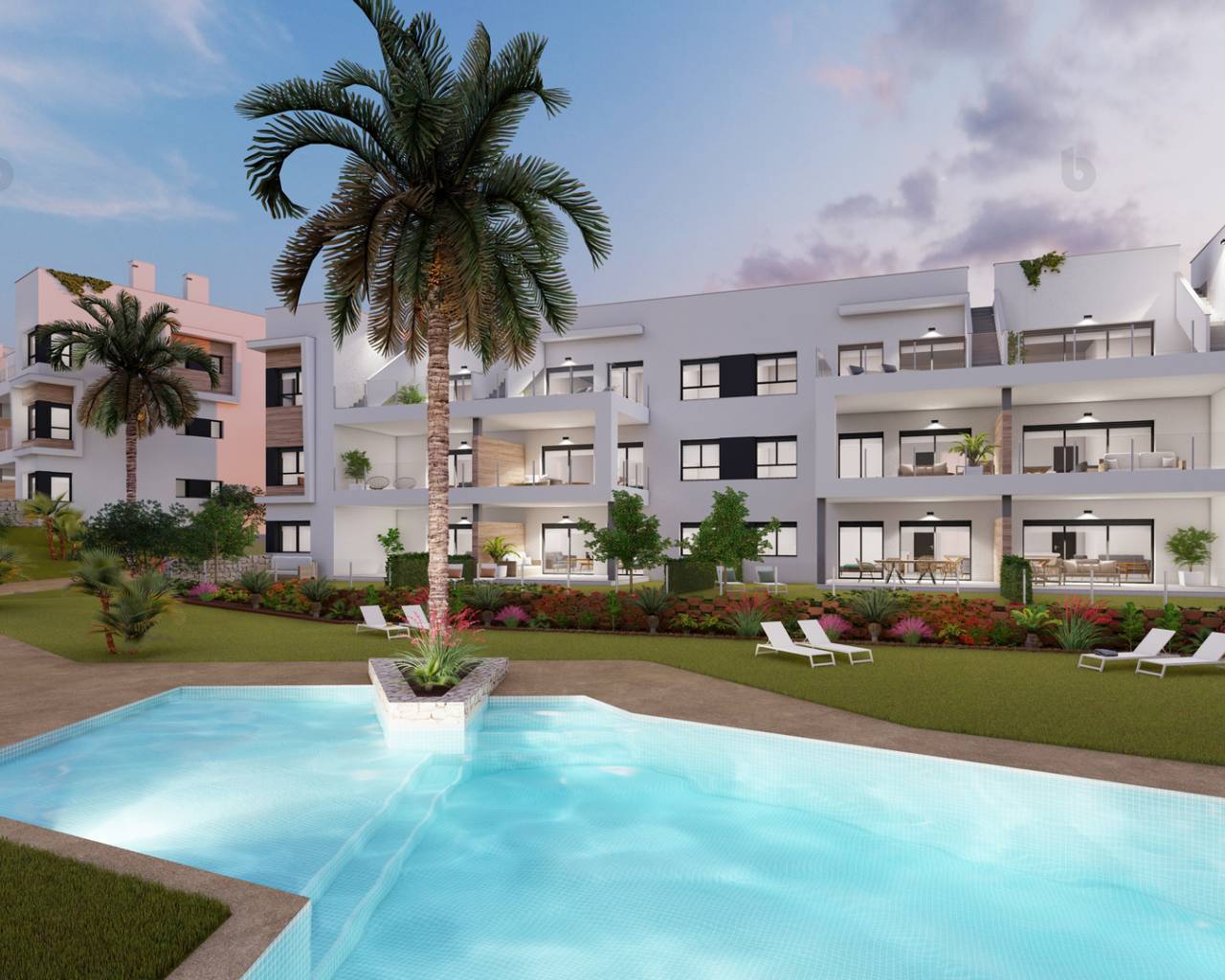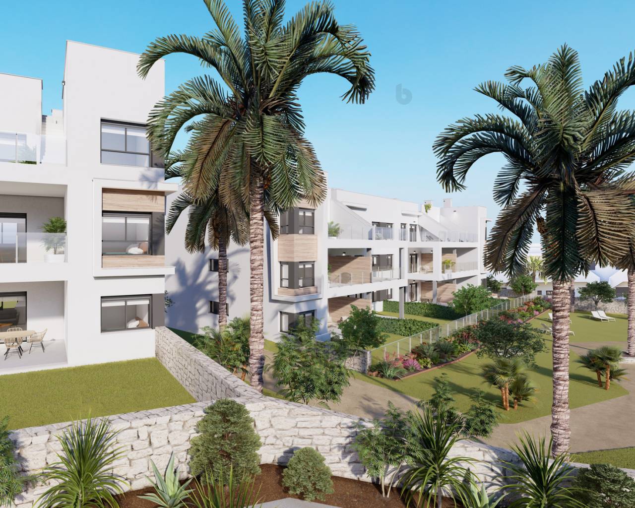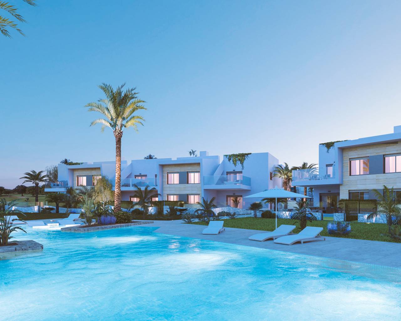 Los exteriores de estas propiedades en Pinar de Campoverde están pensados para maximizar el disfrute del clima mediterráneo. Cada vivienda cuenta con una terraza, ideal para relajarse al aire libre o disfrutar de comidas al fresco. Además, algunas tipologías incluyen un solárium, proporcionando un espacio adicional para tomar el sol o crear un área de ocio personalizada. La presencia de jardines en las propiedades bajos ofrece un espacio verde privado, perfecto para los amantes de la naturaleza o para quienes desean un área segura para que jueguen los niños.
