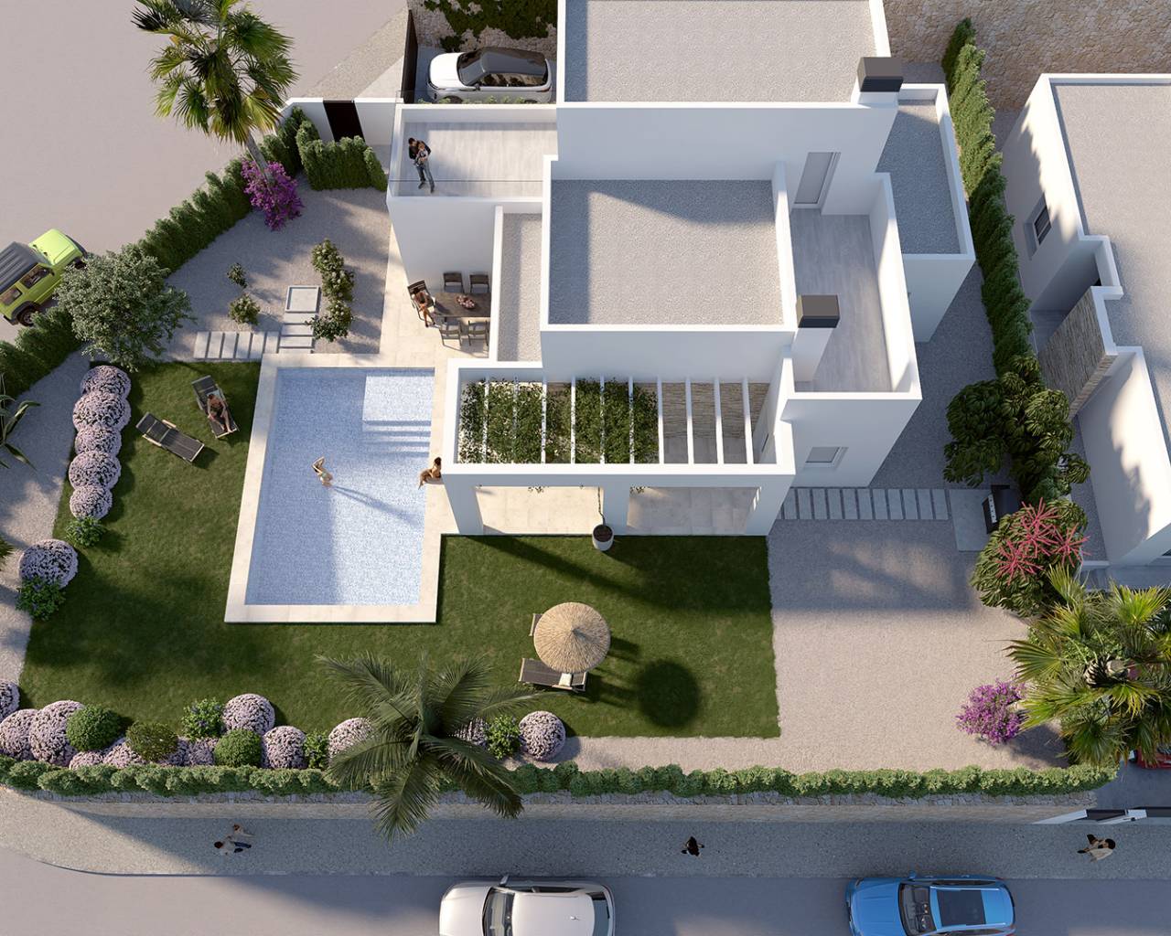 El diseño exterior de estas villas en La Finca Golf es simplemente espectacular. Cada villa cuenta con un jardín privado, perfecto para disfrutar del clima mediterráneo. La presencia de una piscina privada añade un toque de lujo, ofreciendo un espacio ideal para relajarse y disfrutar del sol. Además, las villas están equipadas con una pérgola, proporcionando un área sombreada para disfrutar de comidas al aire libre o simplemente relajarse con un buen libro. La terraza es otro de los atractivos exteriores, ofreciendo vistas al entorno natural y un espacio adicional para el entretenimiento al aire libre.