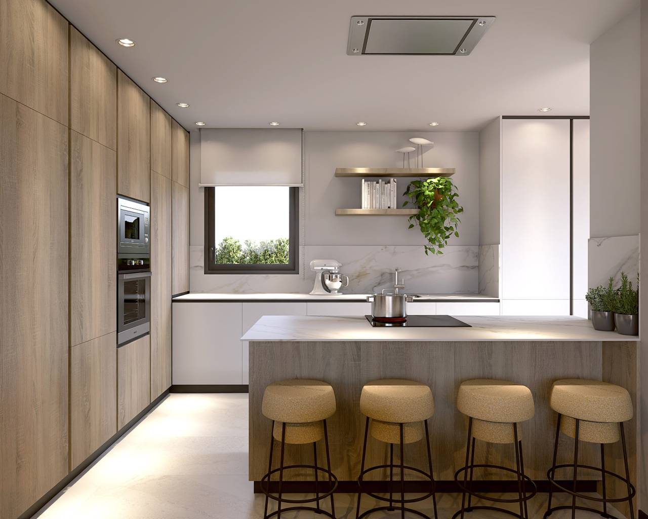 El interior de estas villas en La Finca Golf está diseñado para ofrecer el máximo confort y funcionalidad. Cada villa dispone de aire acondicionado, asegurando un ambiente agradable durante todo el año. Las persianas eléctricas añaden un nivel adicional de comodidad y seguridad. Los armarios empotrados en los dormitorios proporcionan un amplio espacio de almacenamiento, manteniendo el diseño limpio y ordenado. La distribución incluye un garaje privado, lo que garantiza un espacio seguro para el estacionamiento. Además, el solárium ofrece un espacio adicional para disfrutar del sol y las vistas panorámicas del entorno.