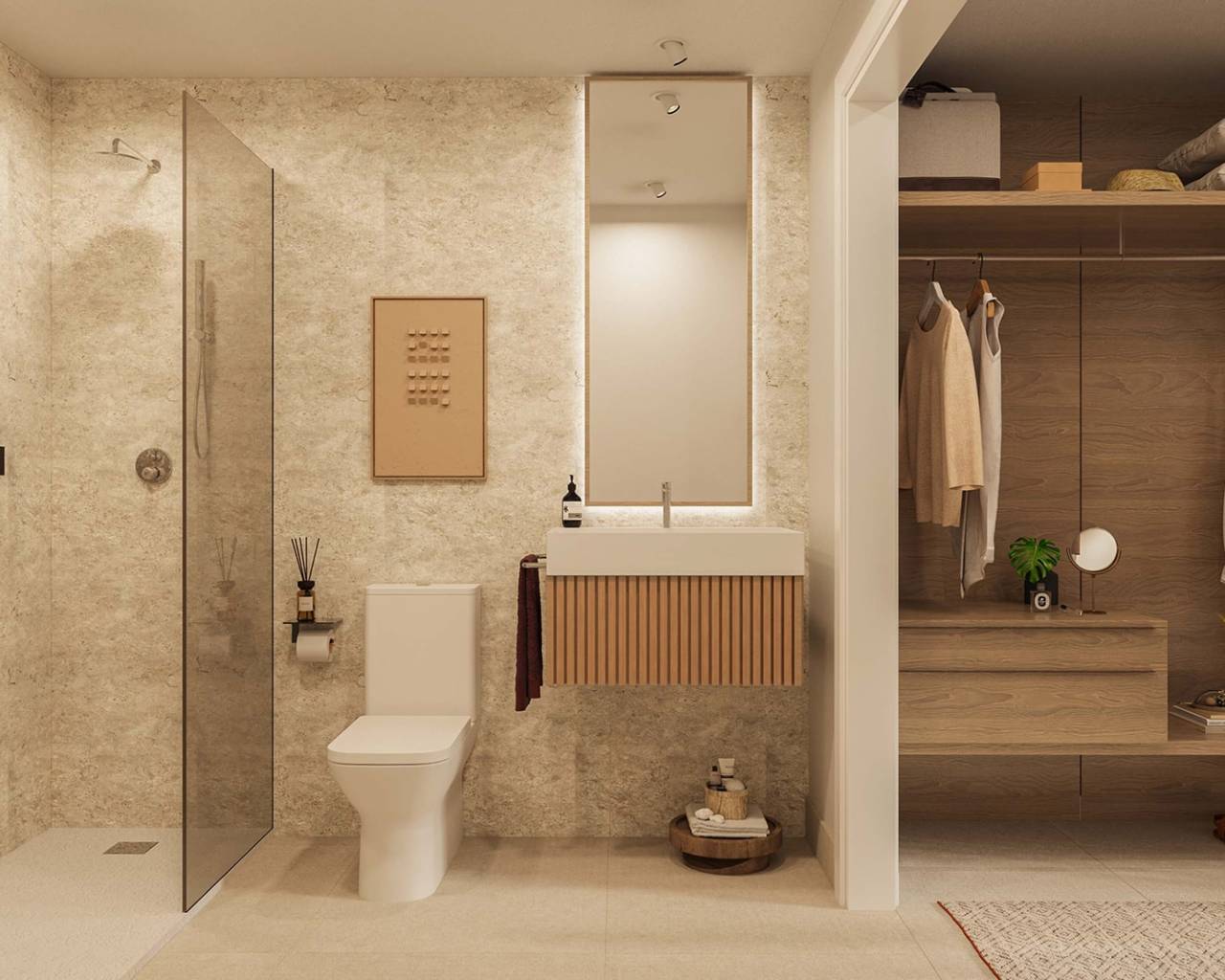 El interior de las viviendas está diseñado para maximizar el confort y la funcionalidad. Las opciones de distribución incluyen apartamentos de 1, 2 y 3 dormitorios, con 1 o 2 baños, adaptándose a diferentes estilos de vida. La integración de sistemas de domótica permite un control eficiente de las instalaciones, mientras que el aire acondicionado asegura un ambiente agradable durante todo el año. Los armarios empotrados optimizan el espacio de almacenamiento, y los suelos de cerámica aportan un toque moderno y fácil de mantener.