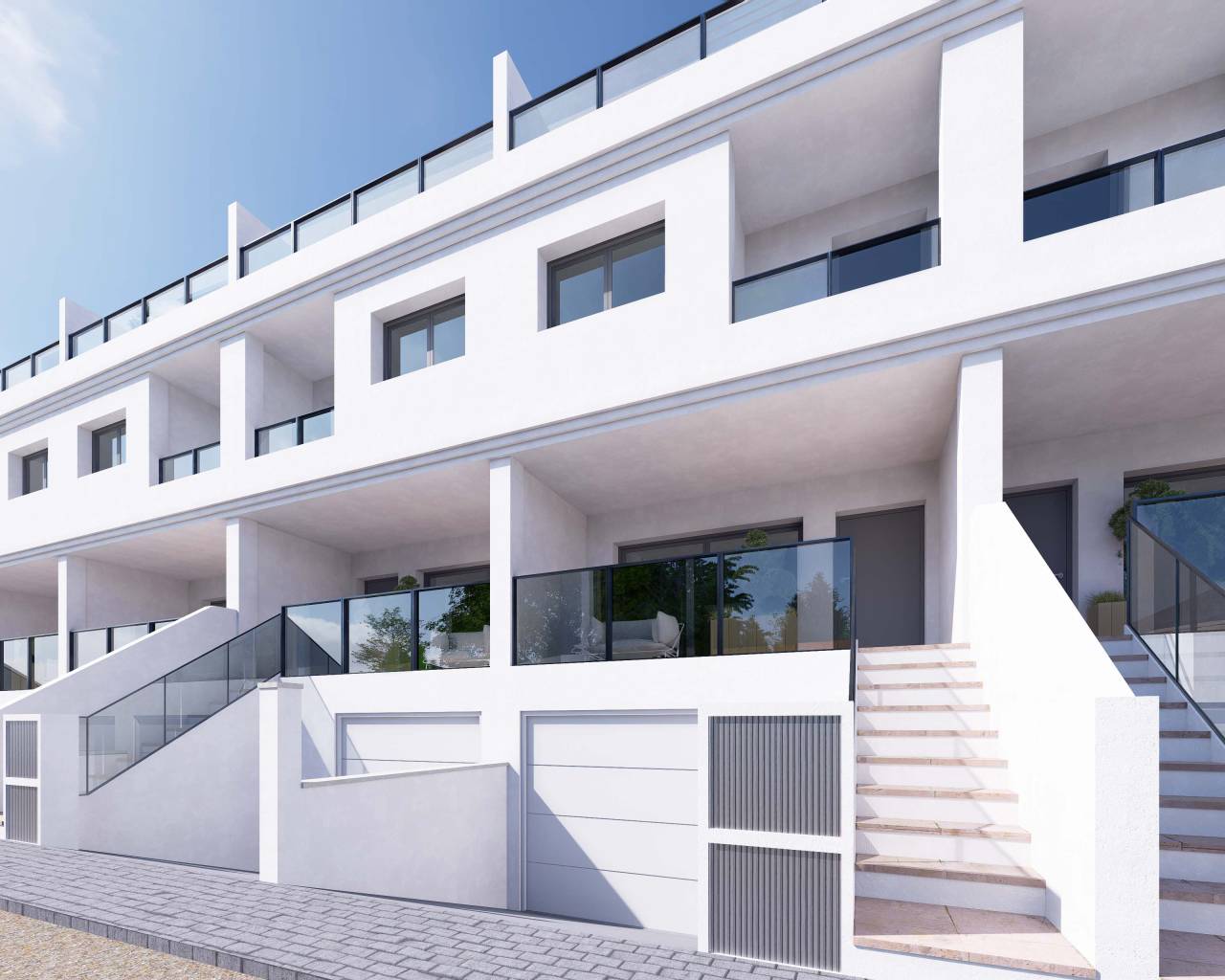 Los exteriores de estas viviendas adosadas en Rafal han sido diseñados para ofrecer un espacio de vida al aire libre que complementa el interior de las casas. Cada propiedad cuenta con una terraza privada, ideal para disfrutar de momentos de relax o para organizar reuniones familiares al aire libre. Además, las viviendas disponen de un garaje, proporcionando comodidad y seguridad para el estacionamiento de vehículos. El diseño exterior se integra armoniosamente con el entorno, ofreciendo un espacio atractivo y funcional que invita a disfrutar del clima mediterráneo durante todo el año. Las áreas ajardinadas comunitarias añaden un toque de verdor y frescura al conjunto, creando un ambiente sereno y agradable para todos los residentes.