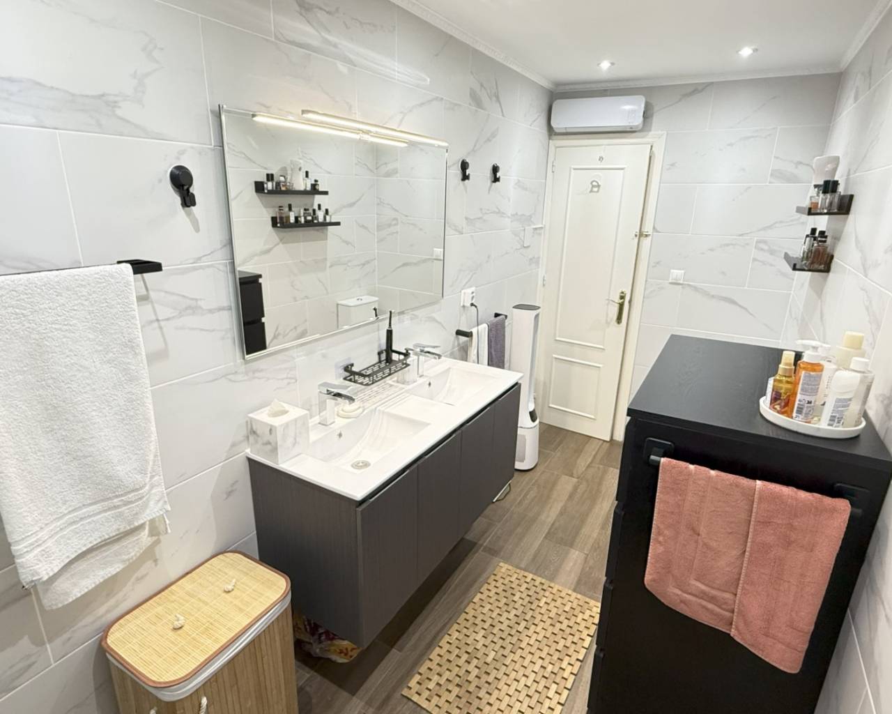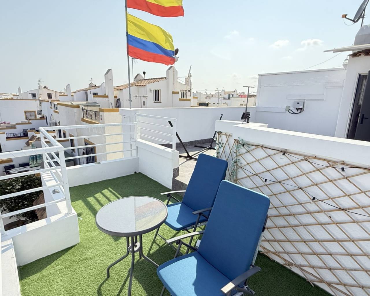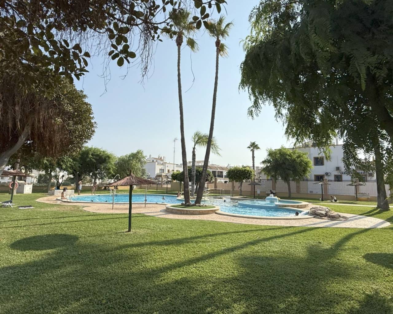 Op slechts enkele minuten wandelen van het La Zenia Boulevard shoppingcenter en de kust, bevindt zich deze schitterende quad-woning die in 2024 volledig gerenoveerd werd. Op het gelijkvloers is er een gezellige en ruime woonkamer, een nieuwe keuken uitgerust met alle toestellen en veel kastruimte, en een gastenbadkamer met toilet. Op de eerste verdieping vinden we één slaapkamer met ingebouwde kasten en een ruime hoofdslaapkamer met aansluitende dressing en bureau. De badkamer beschikt over een dubbele lavabo, toilet en een moderne inloopdouche. Het solarium biedt prachtig zeezicht en is uitgerust met zonnepanelen. Buiten is er een privéparkeerplaats op het eigen domein binnen de omheining, een zeer ruim terras met ingebouwde barbecue en een berging. De urbanisatie is uitstekend onderhouden en biedt bewoners een ruim gemeenschappelijk zwembad en een tennisveld, waardoor dit een ideale woonomgeving is.