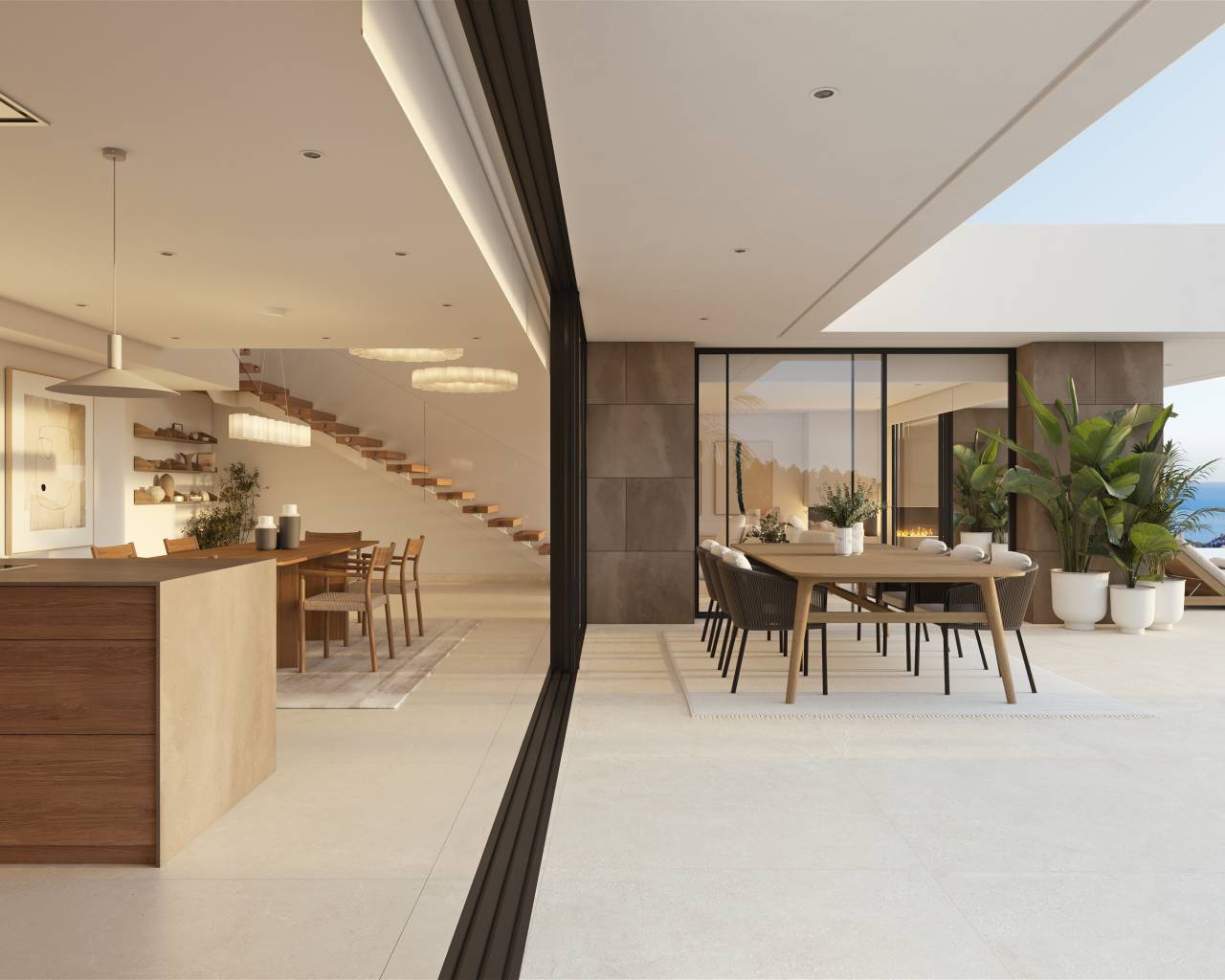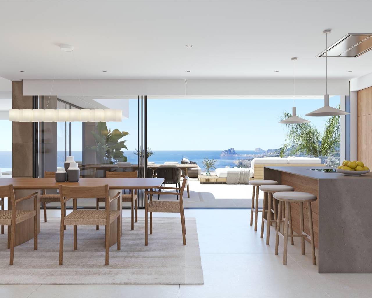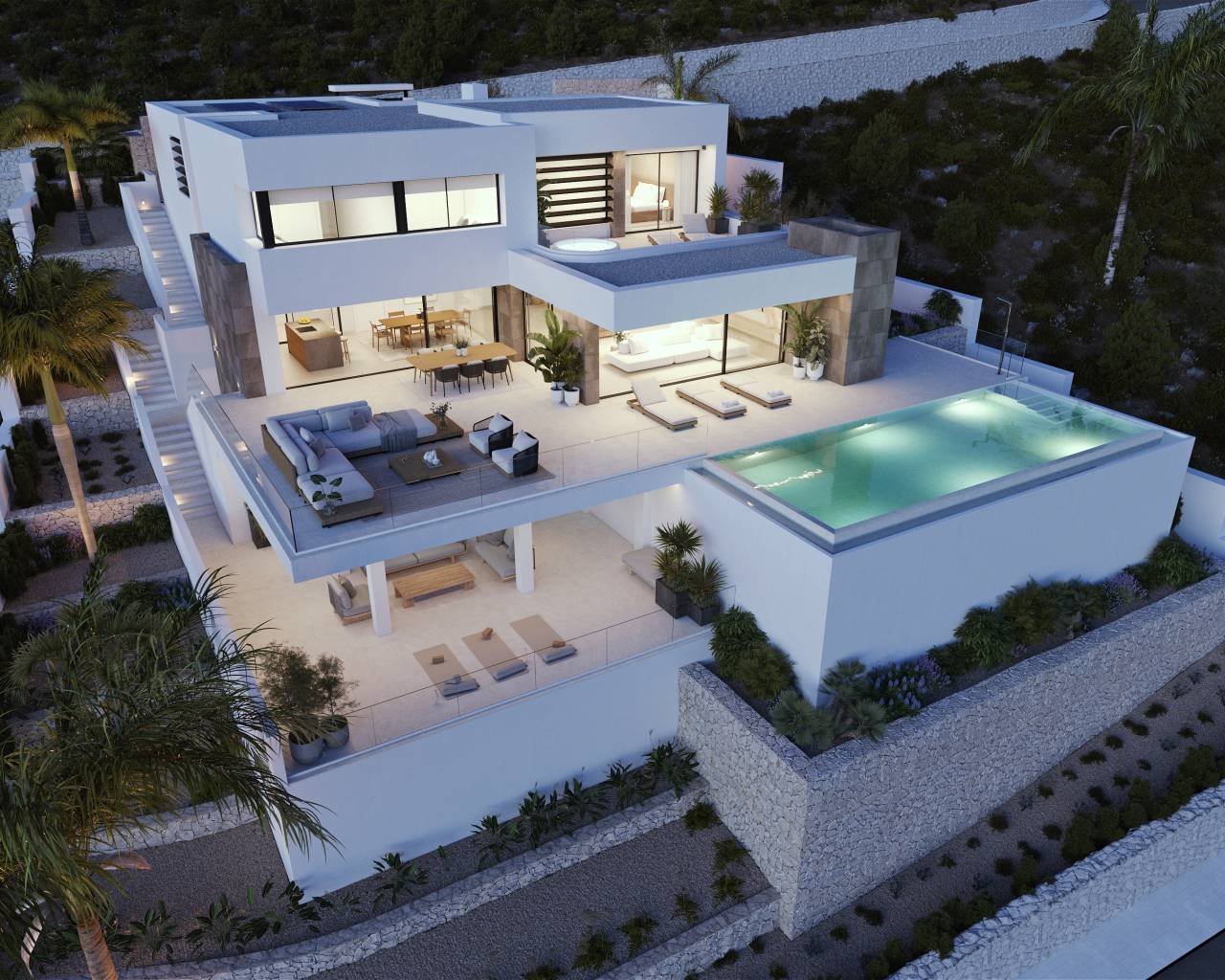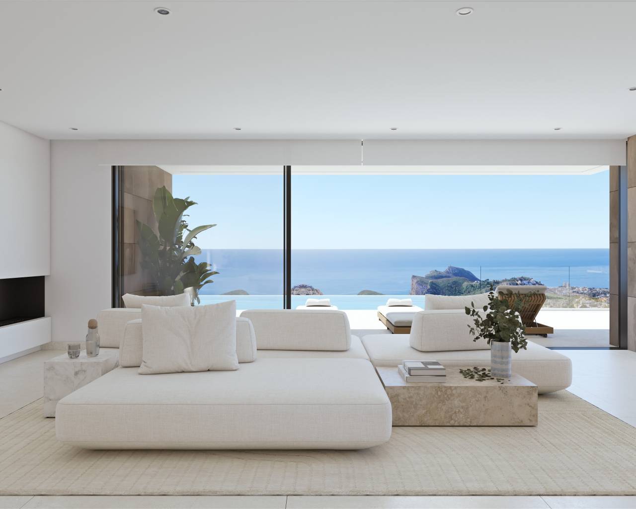 Villa Lavanda is gebouwd op het exclusieve perceel 93 van het residentiële domein Jazmines (Cumbre del Sol). Het is een perfecte combinatie van eigentijds design, comfort en een bevoorrechte ligging aan zee. Dit is een luxe woning voor wie op zoek is naar het allerbeste in het noorden van de Costa Blanca. Het project van Villa Lavanda is opvallend door het moderne ontwerp met rechte lijnen, horizontaal gerichte volumes, grote ramen en natuurlijke materialen waardoor het geheel perfect past bij het landschap. Alle vertrekken zijn zodanig georiënteerd dat het daglicht maximaal binnenvalt en om te kunnen genieten van een grenzeloos panoramisch uitzicht over de zee en de emblematische Peñón de Ifach. De woning heeft drie verdiepingen: De hoofdverdieping, waar de indrukwekkende leefruimte zich bevindt, is één open ruimte met salon, eetplaats en keuken met centraal kookeiland. Grote ramen geven toegang tot het terras, de eetplaats in open lucht en de infinity pool. De grootste slaapkamer, met dressing en en suite badkamer met vrijstaand bad en regendouche bevindt zich ook op dit niveau. De kamer heeft rechtstreeks toegang tot het terras. Bovenverdieping: hier zijn de andere slaapkamers, allemaal met privé badkamer en terrassen, vanwaar je kunt genieten van een adembenemend zeezicht. Kelderverdieping: één open ruimte met daglicht. Deze ruimte kan worden gebruikt voor verschillende doelen zoals fitness, vrije tijdruimte, cinema of een appartement voor bezoekers. Hier is ook een wasplaats en een bergruimte. Villa Lavanda heeft materialen en een afwerking van hoog niveau voor elegantie, functioneel gebruik en duurzaamheid. Er zijn keramische grootformaat tegels gebruikt voor de bevloering. De design keuken is bemeubeld met hoogwaardige installaties en ingebouwde elektrische apparatuur. Het aanrecht is in warme neutrale kleuren met indirecte LED verlichting. De badkamers hebben een eigentijds design: zwevend sanitair, ingebouwde kranen en spiegels met achtergrondverlichting. Er is vloerverwarming en airconditioning met zoneregeling. De verlichting, klimaatregeling en rolluiken worden via domotica bestuurd. Buiten de woning krijg je een totaal mediterrane ervaring. De infinity pool loopt visueel over in zee. Het terras is gemeubeld voor chill outruimte, eetplaats in openlucht en met ligstoelen. Hier zal je zeker kunnen genieten van elke avond. Op de bovenverdieping is ook een terras, een solarium met privé jacuzzi, waar je kunt ontspannen met een panoramisch uitzicht op de kust. Villa Lavanda staat in het residentiële domein Jazmines, een luxueuze zone op het grondgebied van Cumbre del Sol, in Benitachell, tussen Jávea en Moraira. Dit is één van de meest begeerde locaties aan de Middellandse Zee. Hier zijn privé veiligheid, exclusieve facilities, een internationale school, restaurants, sportterreinen en toegang tot de spectaculaire Cala del Moraig. Villa Lavanda is perfect voor wie een high level residentie zoekt, een vakantieverblijf om het hele jaar te genieten van het mediterrane klimaat of als investering in een exclusieve eigendom, gelegen in een geconsolideerd gebied met een hoge meerwaarde.