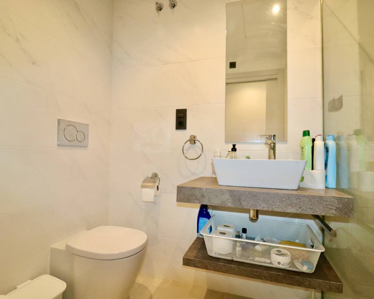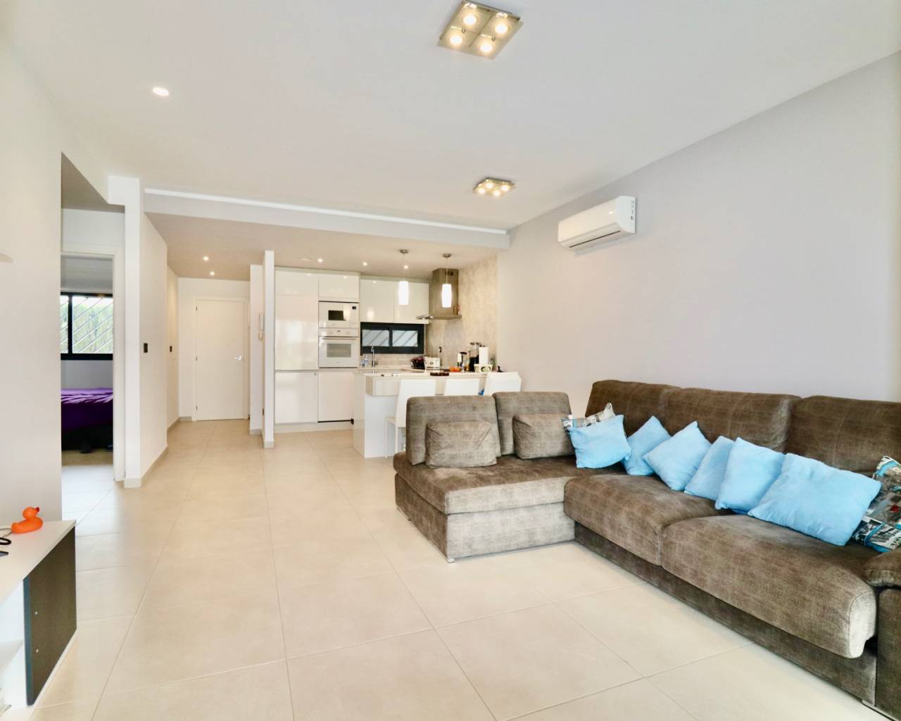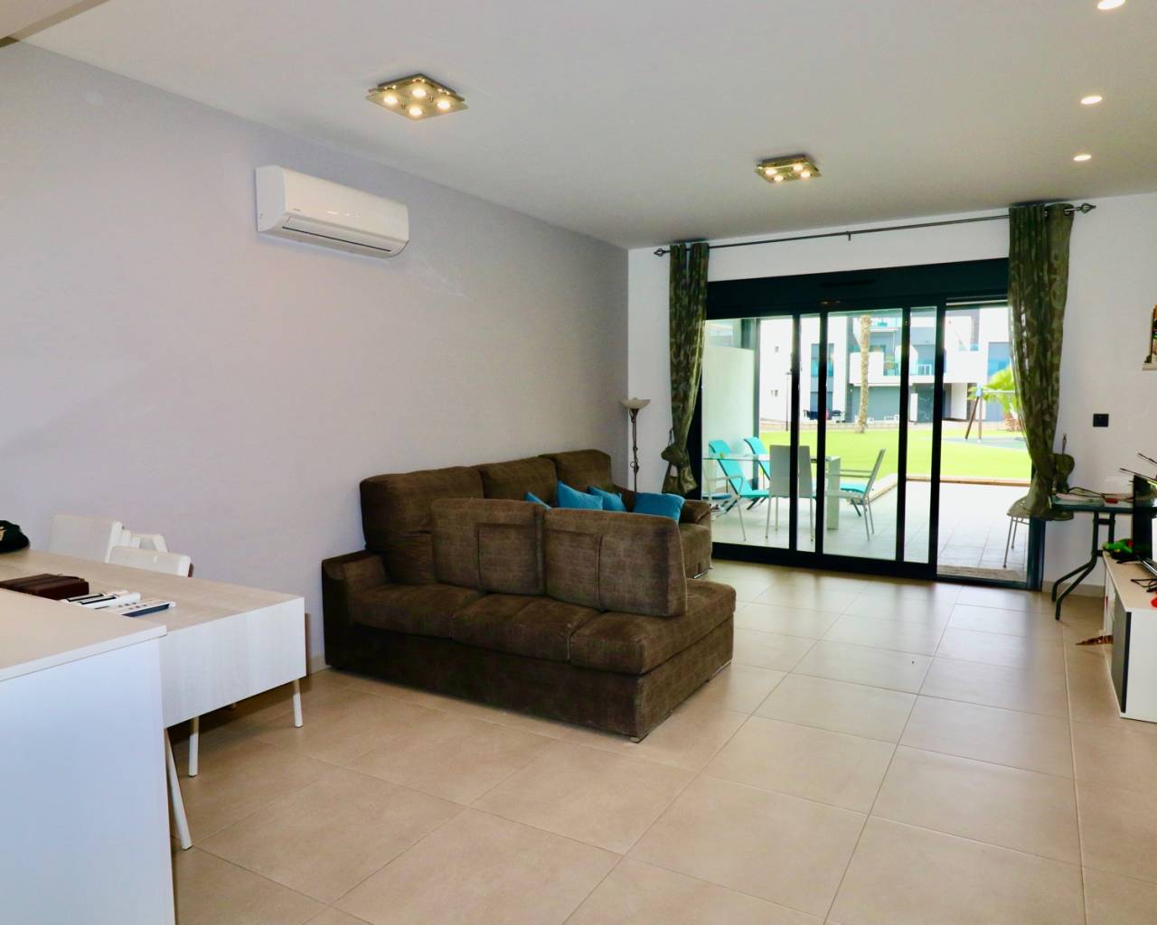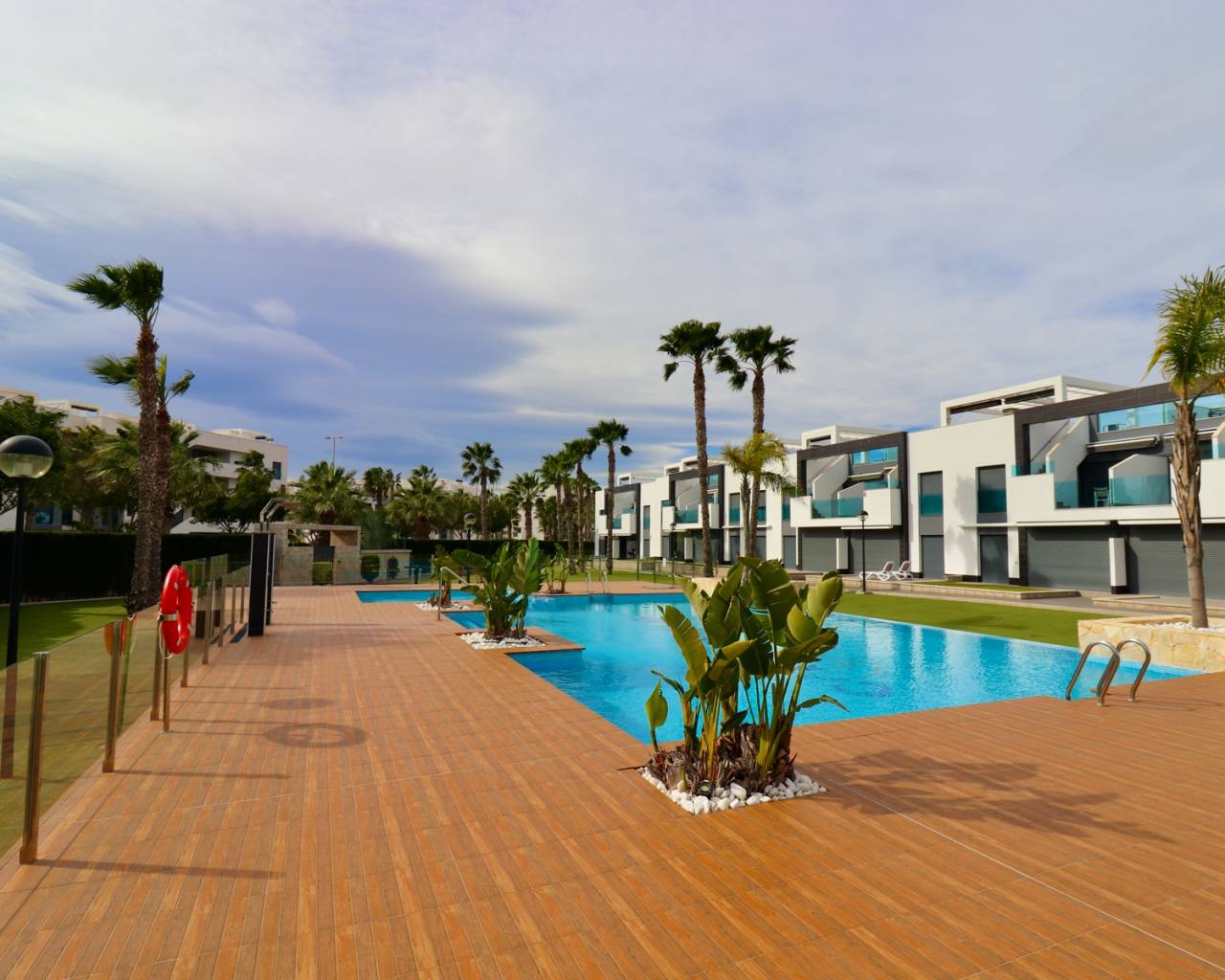 Dit moderne appartement is gelegen in een rustige, recent ontwikkelde woonwijk nabij Guardamar del Segura, een populaire badplaats aan de Costa Blanca. In de buurt vindt u allerlei voorzieningen zoals gezellige cafés, winkels, restaurants, boetieks en een prachtig natuurgebied met wandelpaden naar de charmante haven. Het brede zandstrand van Guardamar is gemakkelijk bereikbaar en ideaal om te ontspannen. De centrale ligging zorgt ervoor dat u snel andere mooie plekken kunt bereiken, en golfbanen en grote winkelcentra zijn ook gemakkelijk te bereiken. Dit maakt deze locatie perfect voor een heerlijke vakantie of om er permanent te wonen. Het appartementencomplex is recent gebouwd en biedt veel rust en comfort. Bewoners kunnen gebruikmaken van diverse luxe voorzieningen, waaronder een groot buitenzwembad met aangelegde tuinen en een wellnessruimte met een heerlijke jacuzzi. Er is tevens een eigen parkeerplaats bij het appartement. Het appartement zelf bevindt zich op de begane grond, heeft een oppervlakte van 105 m2 en is gemakkelijk bereikbaar. Er is ook een lift in het complex. U komt binnen in een lichte woonkamer met open keuken. Vanuit de woonkamer stapt u op het ruime terras met uitzicht op de fraai aangelegde gemeenschappelijke tuin en een van de twee grote zwembaden. De indeling bestaat verder uit een hoofdslaapkamer met eigen badkamer en toegang tot het terras, 2 slaapkamers, een aparte badkamer en een praktische berging/wasruimte. Extra's zijn onder andere airconditioning (warm/koud), elektrische rolluiken, video-intercom, elektrische zonwering, camerabewaking in het hele complex en volledige meubilering bij oplevering. Guardamar del Segura staat bekend om zijn uitgestrekte zandstranden en aangename boulevard. Het centrum biedt tal van voorzieningen en een ontspannen sfeer. De luchthaven van Alicante ligt op slechts 30 minuten rijden.