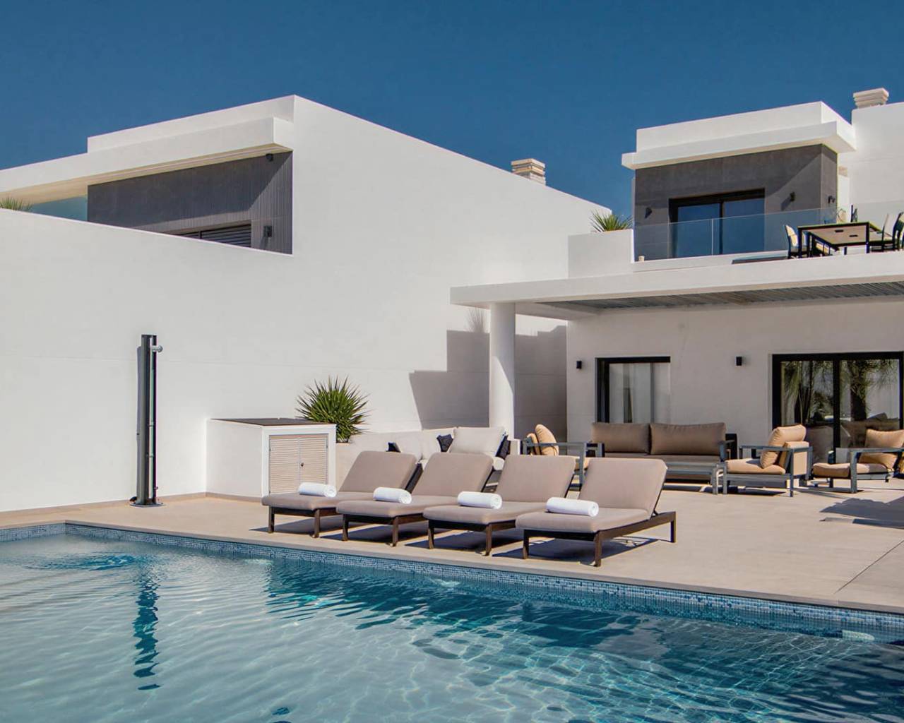Luxe hoekvilla in Ciudad Quesada – Hedendaags ontwerp met 3 verdiepingen Deze villa is een prestigieuze luxe hoekvilla in Ciudad Quesada die zich onderscheidt door haar architectonische uitstraling, intelligente indeling over drie verdiepingen en verhoogde privacy. Ontworpen om optimaal te profiteren van natuurlijk licht en een open uitzicht, biedt deze eigentijdse residentie een verfijnde levensstijl in een van de meest gewilde woonwijken van de Costa Blanca Zuid, op slechts een steenworp afstand van La Marquesa Golf en de ongerepte stranden van Guardamar del Segura. De villa is gelegen op een privéperceel van 300 m² met een bebouwde oppervlakte van 245 m² en combineert naadloos moderne elegantie met functionele verfijning. De begane grond beschikt over een lichte, open woonkamer en een verfijnde eetkamer die naadloos overgaan in ruime zonneterrassen en een opvallend privézwembad van 40 m², waardoor een perfecte binnen-buitenomgeving ontstaat, ideaal voor entertainment en ontspanning. De slaapkamers bevinden zich in de ruime kelderverdieping en hebben elk directe toegang tot een lichte binnenplaats. Daarnaast is er een gezellige tweede lounge – perfect voor gasten, gezinsleven, een privébioscoop of een wellnessruimte. De master suite beslaat de gehele derde verdieping en biedt een exclusief toevluchtsoord met een eigen terras en een ononderbroken panoramisch uitzicht op het omringende natuurlandschap, wat zorgt voor een zeldzaam gevoel van verhevenheid en rust. Elke woning wordt opgeleverd met een complete turnkey-specificatie, inclusief airconditioning, zonnepanelen, automatische zonwering, hoogwaardige verlichting, een ingerichte keuken met geïntegreerde apparatuur en een privégarage met berging, voor direct comfort en efficiëntie op de lange termijn. Belangrijkste kenmerken Elegante luxe hoekvilla met 3 verdiepingen en open uitzicht op de natuur 4 slaapkamers | 4 badkamers | 245 m² bebouwd | Perceel van 300 m² Privézwembad van 40 m² en ruime terrassen Hoofdslaapkamer met privéterras op de bovenste verdieping Slaapkamers onder het huis met toegang tot een lichte binnenplaats Airconditioning en zonnepanelen Volledig ingerichte designkeuken inclusief apparatuur Automatische zonwering en luxe verlichting Privégarage en aparte berging Optioneel volledig gemeubileerd en uitgerust beschikbaar Villa Baiae is perfect gelegen nabij een kampioenschapsgolfbaan, internationale voorzieningen, restaurants van topkwaliteit en de Middellandse Zeekust. Het is een aantrekkelijke kans als permanente woning, luxe vakantiehuis of investeringsobject met een hoog rendement in Spanje.