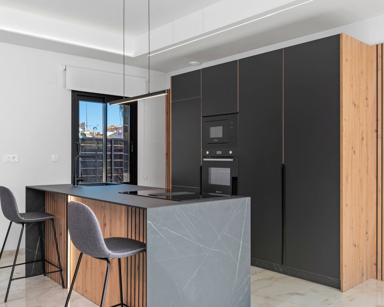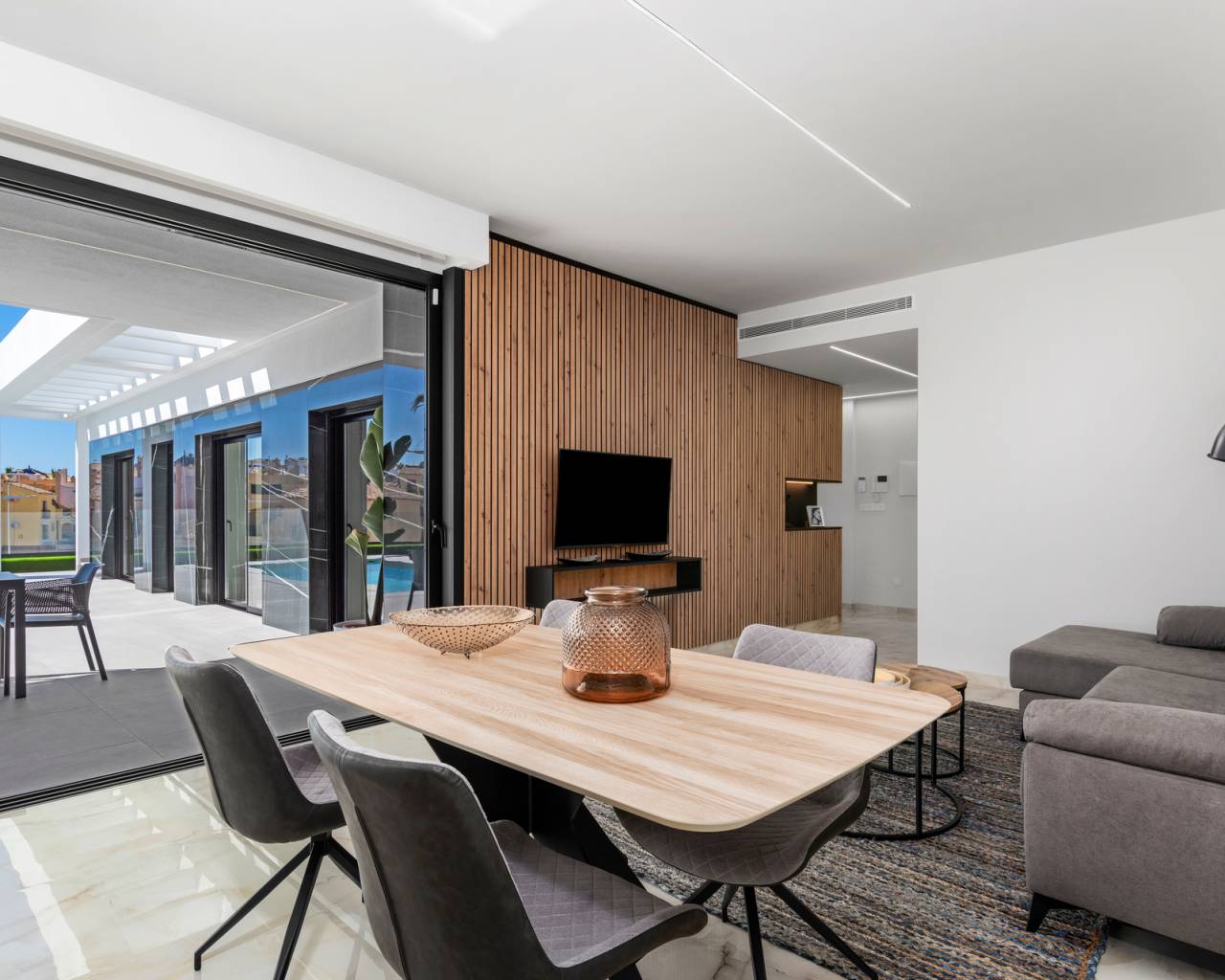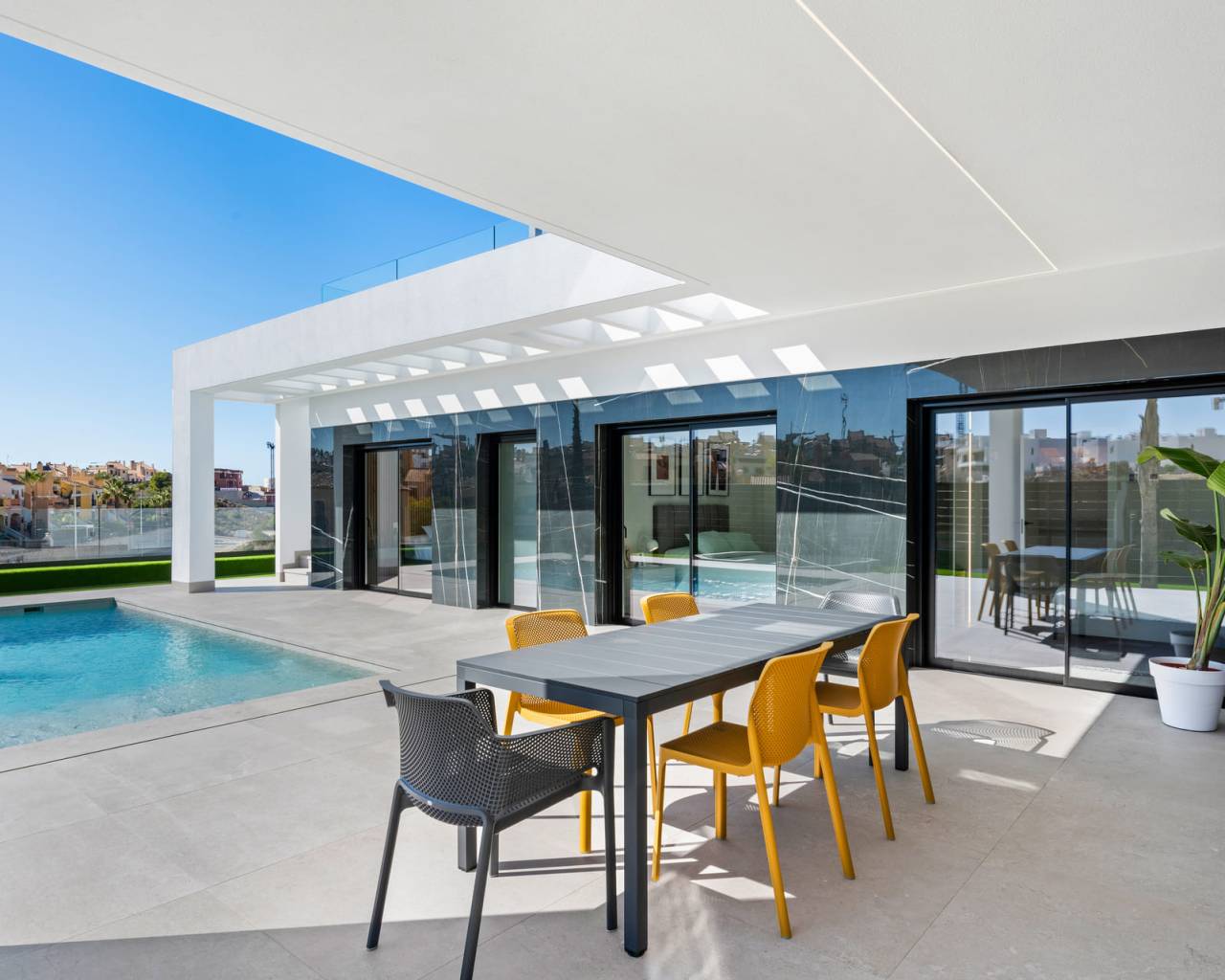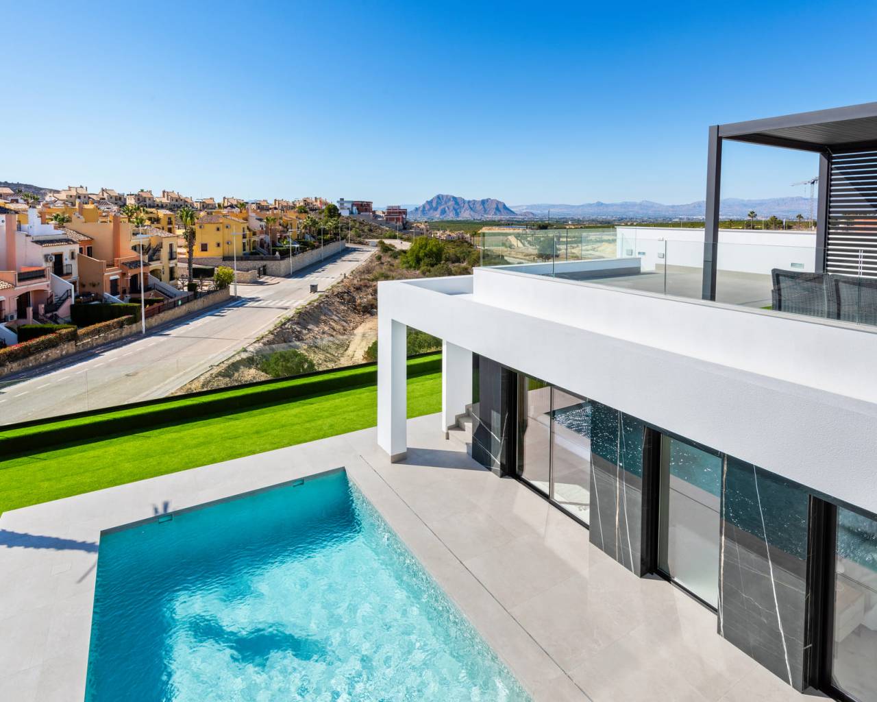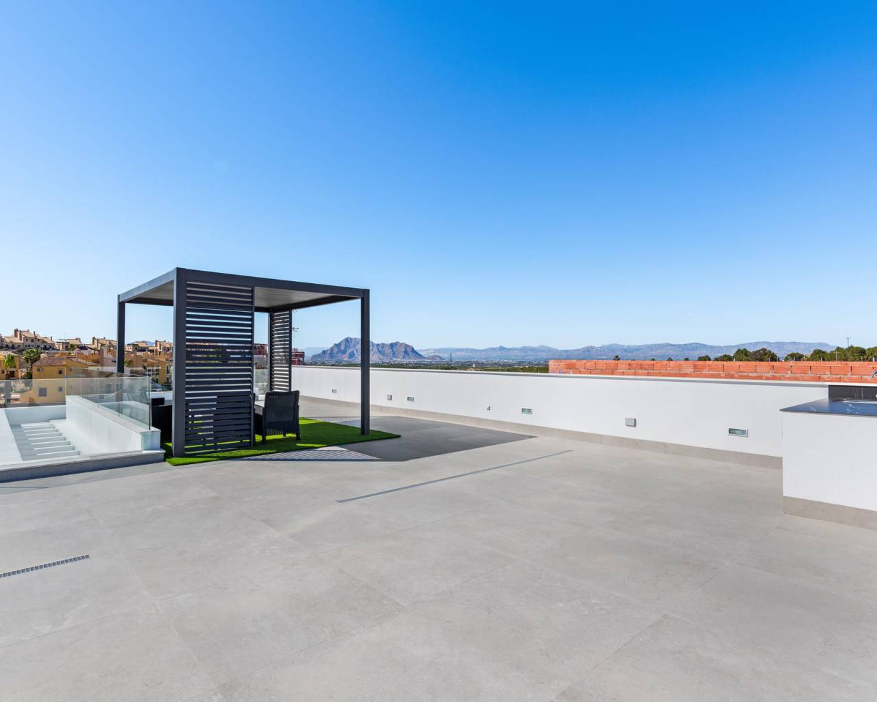 Gelegen in de prestigieuze omgeving van La Finca Golf, biedt dit exclusieve ensemble van 11 onafhankelijke woningen een unieke levensstijl. Elke woning is ontworpen om maximaal comfort en privacy te bieden, met een indeling die drie slaapkamers en twee badkamers omvat. De nabijheid van de luchthaven, op slechts 13 km afstand, voegt extra waarde toe aan deze woningen en vergemakkelijkt de toegang voor frequente reizigers. De locatie in La Finca Golf zorgt voor een rustige en veilige omgeving, ideaal om te genieten van het leven in een bevoorrechte natuurlijke omgeving. BUITENRUIMTES De woningen beschikken over een reeks buitenkenmerken die opvallen door hun elegantie en functionaliteit. Elke woning heeft een privézwembad, perfect om te genieten van het mediterrane klimaat. Daarnaast bieden terrassen en solariums ideale ruimtes voor buitenrecreatie, waardoor u kunt genieten van het uitzicht en de natuurlijke omgeving. De aanwezigheid van pergola's voegt een vleugje onderscheid toe en biedt schaduw op zonnige dagen, waardoor een uitnodigende sfeer ontstaat voor familiebijeenkomsten of ontmoetingen met vrienden. BINNENRUIMTES Het interieur van deze onafhankelijke woningen is ontworpen om maximaal comfort en functionaliteit te bieden. De vloeren van porseleinen tegels geven een moderne uitstraling en zijn gemakkelijk te onderhouden. De keuken is uitgerust met apparatuur, wat het dagelijks leven vanaf dag één vergemakkelijkt. Elektrische rolluiken en de video-intercom voegen een extra niveau van comfort en veiligheid toe. Ingebouwde kasten in de slaapkamers optimaliseren de ruimte, terwijl de voorinstallatie van airconditioning het hele jaar door een aangename omgeving garandeert. Bovendien beschikt elke woning over een garage, die een veilige parkeerplaats biedt.