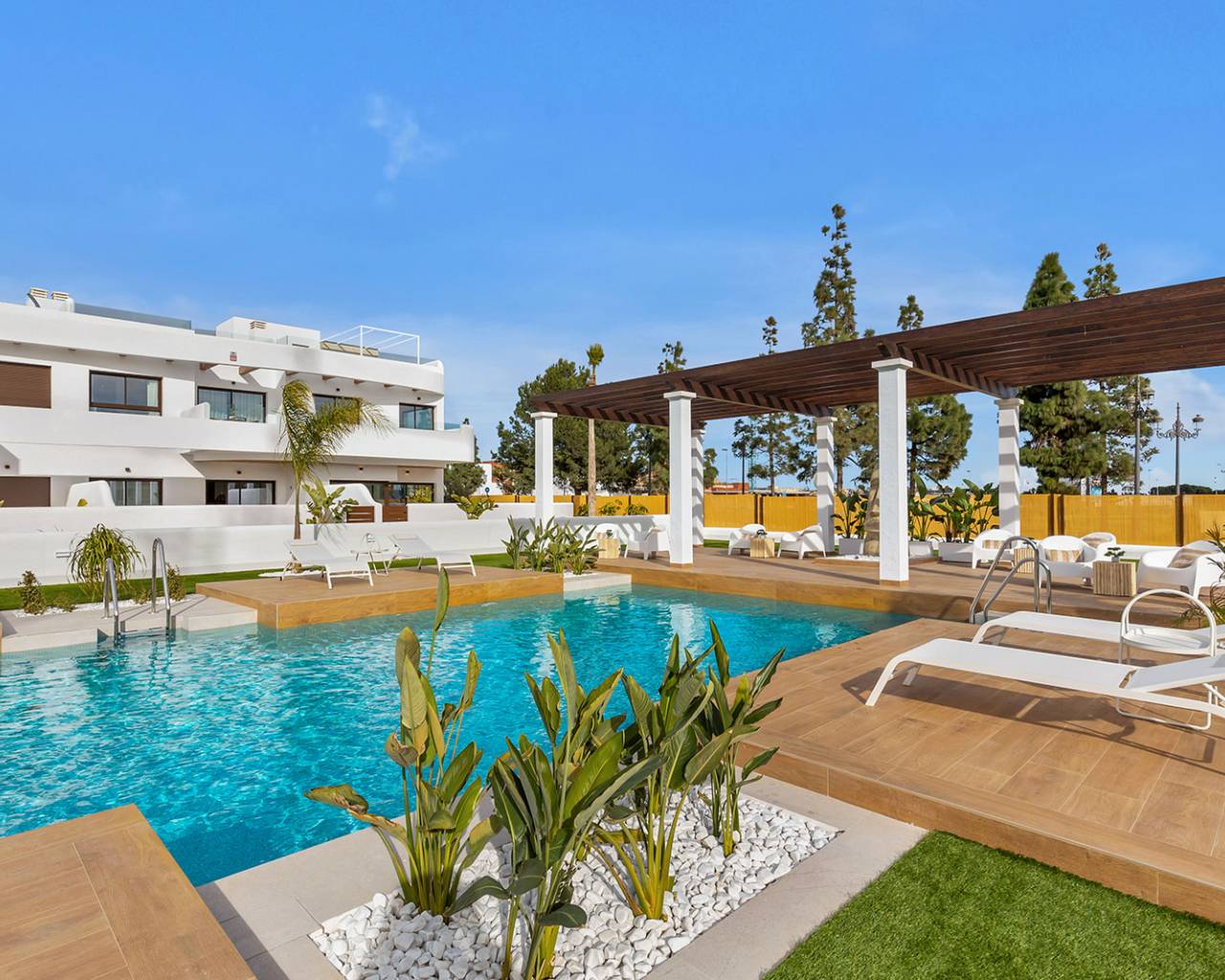Gelegen in de charmante stad Los Alcázares, biedt dit wooncomplex een selectie van 22 woningen, waaronder appartementen en penthouses. Ontworpen voor degenen die op zoek zijn naar een comfortabele en moderne levensstijl, is elke woning zorgvuldig gepland om comfort en functionaliteit te maximaliseren. Los Alcázares staat bekend om zijn nabijheid tot de zee, met het strand op slechts 1 km afstand, wat indrukwekkende uitzichten en snelle toegang tot de kust mogelijk maakt. Bovendien vinden golfliefhebbers een golfbaan op dezelfde afstand, wat deze locatie ideaal maakt voor sportliefhebbers. De dichtstbijzijnde luchthaven ligt op 44 km afstand, wat internationale verbindingen vergemakkelijkt. BUITENRUIMTES De buitenruimtes van dit wooncomplex zijn ontworpen om de natuurlijke omgeving van Los Alcázares aan te vullen. De woningen beschikken over privéterrassen, perfect om te genieten van het mediterrane klimaat en het uitzicht op de omgeving. Bovendien bieden sommige woningen de optie van een solarium, dat extra buitenruimte biedt om te ontspannen of te socialiseren. De gemeenschappelijke tuinen zijn zorgvuldig onderhouden en bieden een groene ruimte waar bewoners kunnen genieten van de rust en schoonheid van het landschap. De nabijheid van de zee, op slechts 1 km, maakt kustwandelingen en watersportactiviteiten mogelijk. BINNENRUIMTES Binnen zijn de woningen uitgerust met moderne kenmerken die comfort en stijl garanderen. De appartementen en penthouses bieden opties met 2 of 3 slaapkamers en 2 of 3 badkamers, aangepast aan verschillende gezinsbehoeften. De porseleinen tegelvloeren geven een vleugje elegantie en zijn gemakkelijk te onderhouden. De keukens zijn uitgerust met apparaten die het dagelijks leven vergemakkelijken. Ingebouwde kasten bieden efficiënte opslag, terwijl de voorinstallatie van airconditioning het hele jaar door een aangename omgeving garandeert. Bovendien is er de mogelijkheid om een garage aan te schaffen, wat comfort en veiligheid toevoegt. GEMEENSCHAPPELIJKE RUIMTES De gemeenschappelijke ruimtes van het wooncomplex zijn ontworpen om een gevoel van gemeenschap te bevorderen en recreatieve en ontspanningsruimtes te bieden. Bewoners kunnen genieten van een gemeenschappelijk zwembad, ideaal om af te koelen tijdens warme zomerdagen. De gemeenschappelijke tuinen bieden een groene en serene omgeving, perfect voor wandelingen of gewoon om buiten te ontspannen.