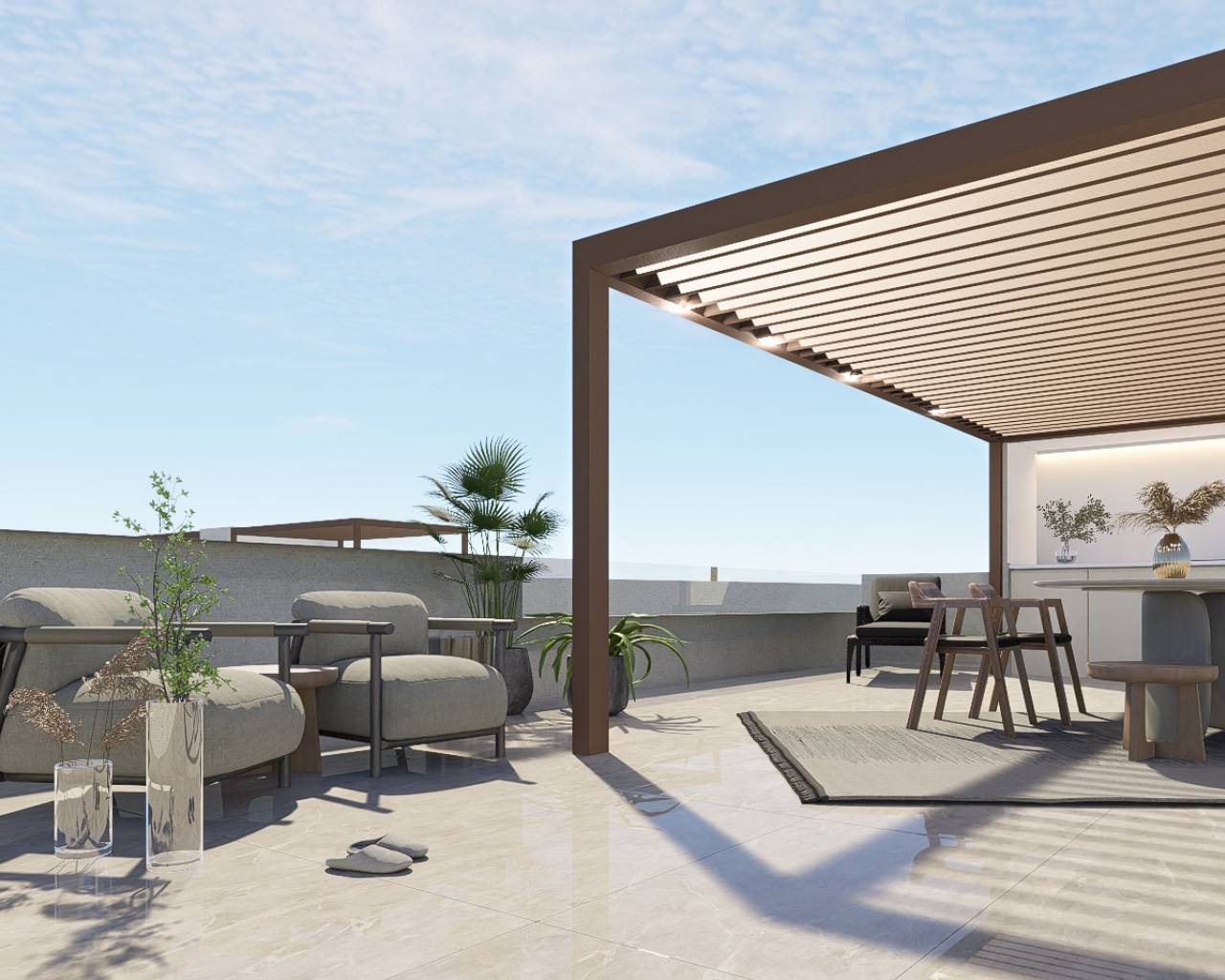 De buitenruimtes van deze woningen zijn ontworpen om optimaal te genieten van het mediterrane klimaat. Elke bungalow heeft een privéterras, ideaal om buiten te ontspannen of te genieten van maaltijden in de open lucht. Daarnaast hebben de bewoners toegang tot een solarium, dat extra ruimte biedt om te zonnebaden of gewoon van het uitzicht te genieten. De aanwezigheid van een privétuin bij elke woning voegt een vleugje natuur en privacy toe, waardoor bewoners hun eigen persoonlijke oase kunnen creëren. De toevoeging van een pergola biedt schaduw en comfort, waardoor de buitenruimtes het hele jaar door een gezellige plek zijn.