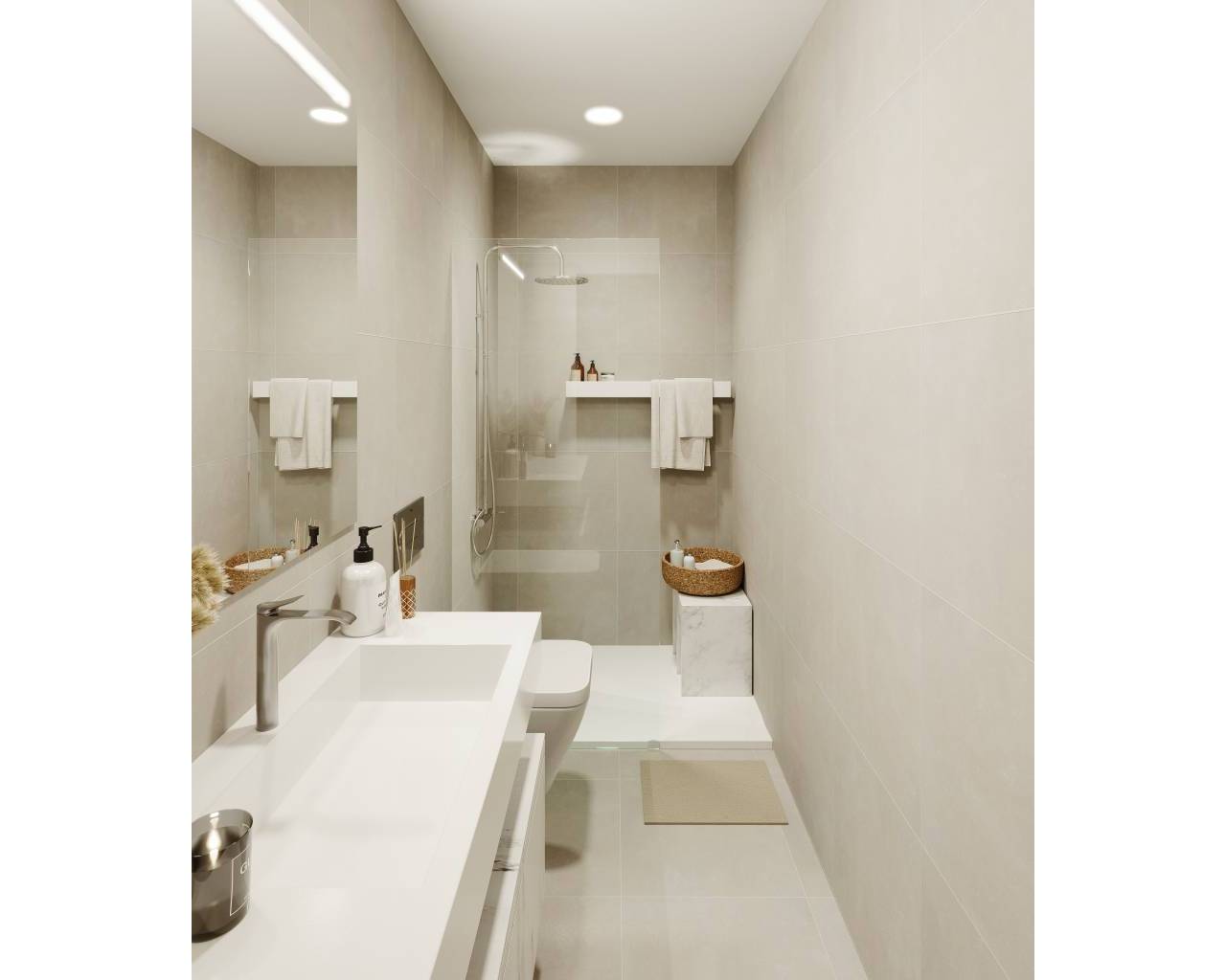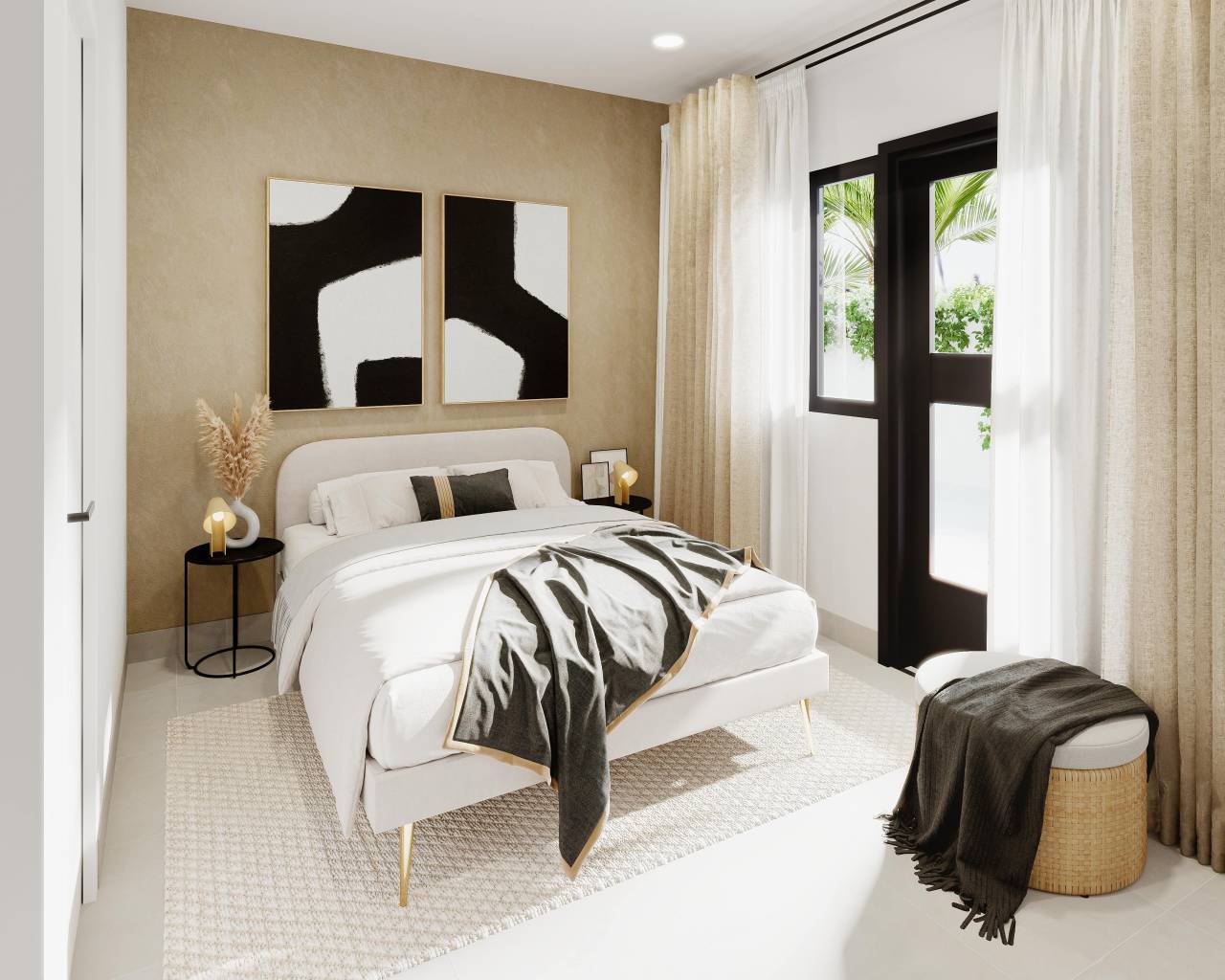 Het interieur van de bungalows is ontworpen met een focus op kwaliteit en comfort. De vloeren van porseleinen tegels geven een vleugje elegantie en duurzaamheid, terwijl elektrische rolluiken een extra niveau van comfort bieden. Ingebouwde kasten zorgen voor efficiënte opslag, waardoor de ruimtes netjes en functioneel blijven. De voorinstallatie van airconditioning zorgt ervoor dat het binnenklimaat altijd aangenaam is, ongeacht het seizoen. Elke bungalow beschikt over twee slaapkamers en twee badkamers, wat voldoende ruimte biedt voor gezinnen of koppels die op zoek zijn naar een gezellig huis. De indeling omvat ook een garage, die comfort en veiligheid voor de voertuigen garandeert.