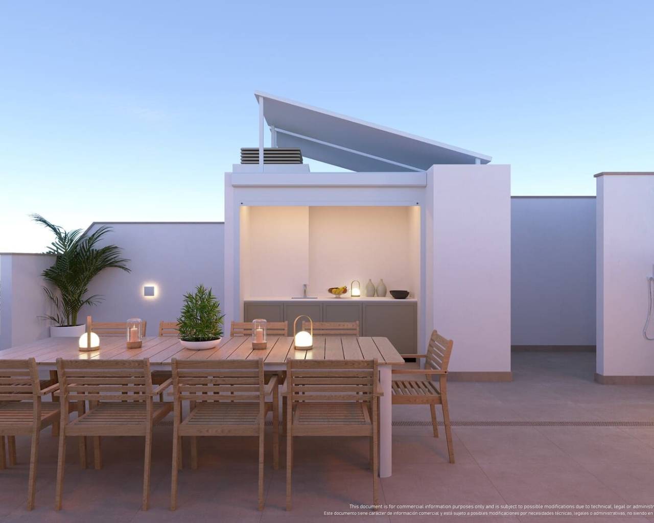 De buitenruimtes van deze woningen zijn ontworpen om optimaal te genieten van het mediterrane klimaat. Elke woning beschikt over een privéterras, ideaal om buiten te ontspannen of te genieten van maaltijden in de open lucht. Sommige typen hebben een solarium, wat extra ruimte biedt om te zonnebaden of van het uitzicht te genieten. Bovendien voegt de optie van een privétuin een vleugje natuur en privacy toe. Voor degenen die op zoek zijn naar een vleugje luxe, bieden sommige woningen een privézwembad, perfect om af te koelen op warme dagen. De aanwezigheid van een garage zorgt voor comfort en veiligheid voor het parkeren van voertuigen.