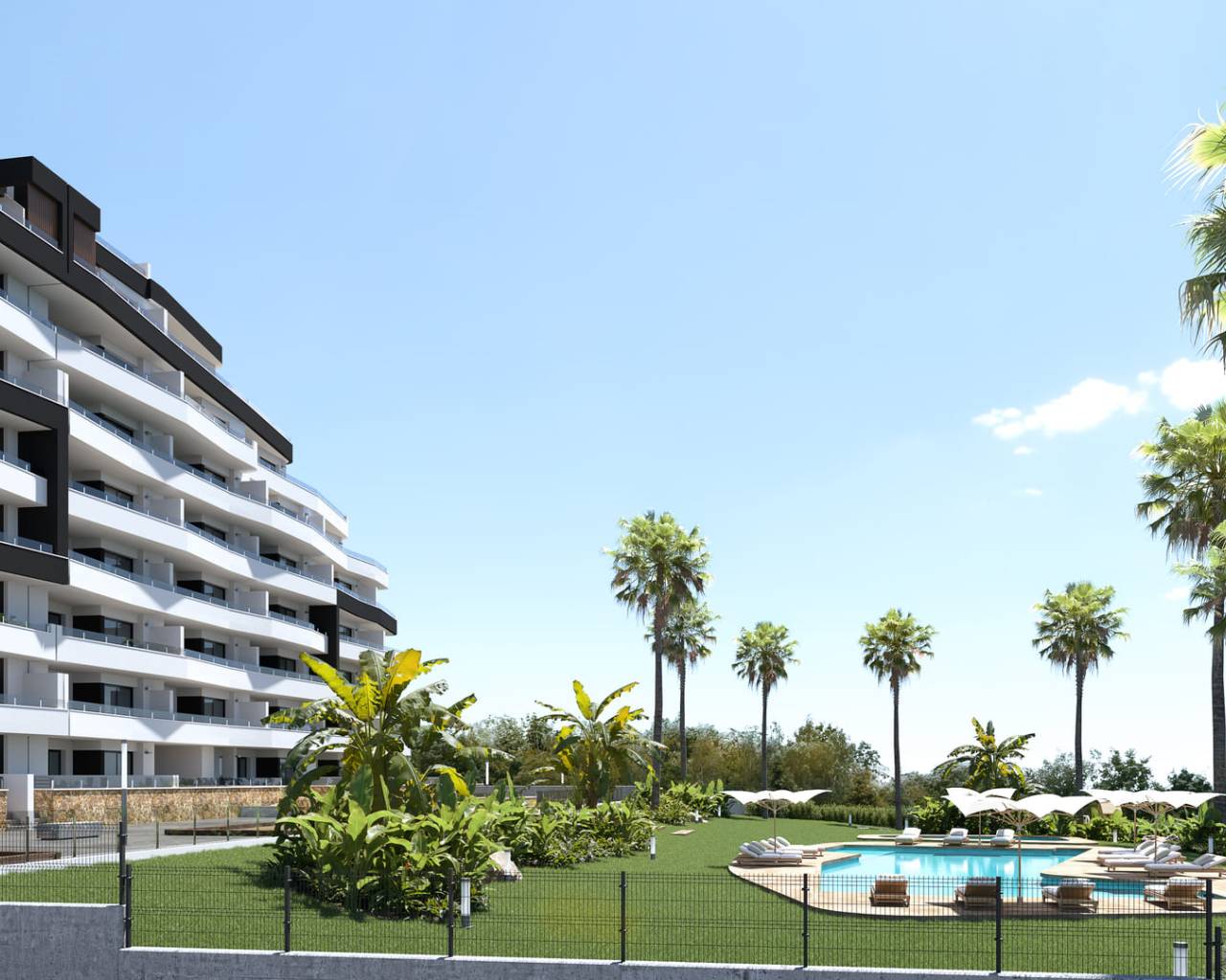 De buitenruimtes van deze residentie zijn ontworpen om optimaal te genieten van het mediterrane klimaat. De woningen beschikken over privéterrassen, perfect om buiten te ontspannen en te genieten van het uitzicht op de omgeving. Daarnaast hebben de bewoners toegang tot ruime tuinen, die een groene en serene ruimte bieden om te wandelen of te ontspannen. De aanwezigheid van een solarium in sommige typen maakt het mogelijk om in een privé en exclusieve omgeving van de zon te genieten. De gemeenschap beschikt ook over een gemeenschappelijk zwembad, ideaal om af te koelen tijdens de warme zomerdagen, en een kinderspeelplaats, die een veilige en leuke ruimte biedt voor de kleintjes.