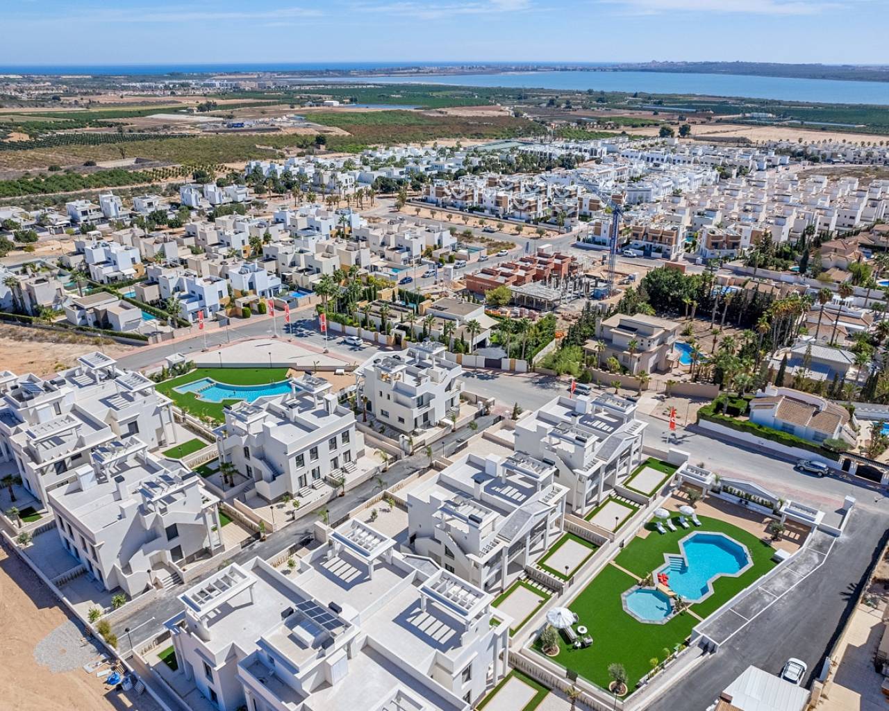 Het exterieurontwerp van dit wooncomplex in Rojales is bedoeld om een luxe en comfortabele omgeving te bieden. De vrijstaande woningen hebben een privézwembad, dat een persoonlijke oase biedt om van de zon en de rust te genieten. De nabijheid van de zee, op slechts 5 km afstand, stelt bewoners in staat om op elk moment te genieten van kustwandelingen en watersportactiviteiten. De buitenruimtes zijn ontworpen om zich harmonieus te integreren met de natuurlijke omgeving en bieden panoramische uitzichten die de schoonheid van het omliggende landschap benadrukken. De moderne en elegante architectuur van de eigendommen wordt aangevuld met zorgvuldig geselecteerde details die een exclusieve levensstijl weerspiegelen. De privé tuinen, waar van toepassing, bieden extra groene ruimte voor persoonlijk genot, terwijl de solariums een perfecte plek bieden om te ontspannen en te genieten van het uitzicht op de zee en de natuurlijke omgeving.