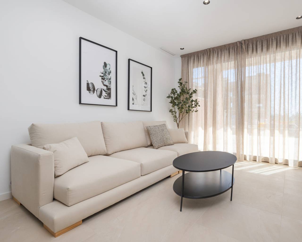 Het interieur van de woningen is ontworpen om maximaal comfort en functionaliteit te bieden. De indelingsopties omvatten woningen met 2 en 3 slaapkamers, allemaal met 2 badkamers, wat voldoende ruimte biedt voor gezinnen van verschillende groottes. De keukens zijn uitgerust met moderne apparatuur en het airconditioningsysteem, samen met de extra voorinstallatie, zorgt het hele jaar door voor een aangename sfeer. Elektrische rolluiken en de video-intercom voegen een vleugje moderniteit en veiligheid toe. Ingebouwde kasten bieden efficiënte opslagoplossingen, waardoor de ruimtes netjes en rommelvrij blijven.