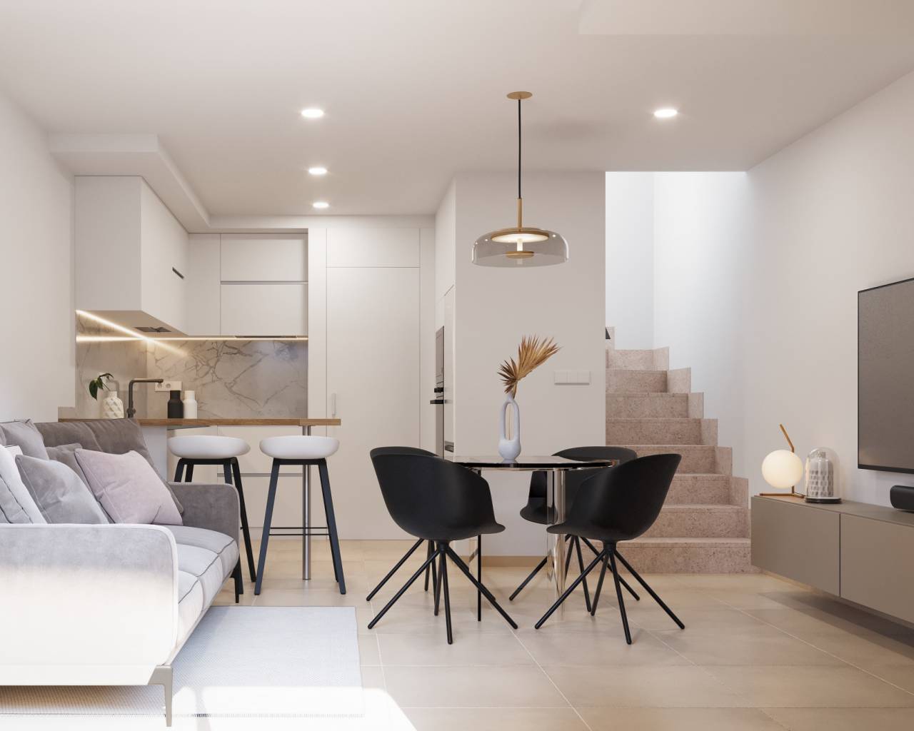 Het interieur van elk rijtjeshuis is ontworpen om maximaal comfort en functionaliteit te bieden. De woningen zijn beschikbaar in configuraties met twee of drie slaapkamers, allemaal met twee badkamers, wat voldoende ruimte voor het hele gezin garandeert. De vloeren van porseleinen tegels voegen een vleugje elegantie en duurzaamheid toe. De keukens zijn uitgerust met moderne apparatuur, en de ingebouwde kasten in de slaapkamers bieden efficiënte opslag. Bovendien is er een pre-installatie voor airconditioning, wat het hele jaar door een aangename omgeving garandeert. Elke woning heeft een garage, wat gemak en veiligheid biedt voor parkeren.
