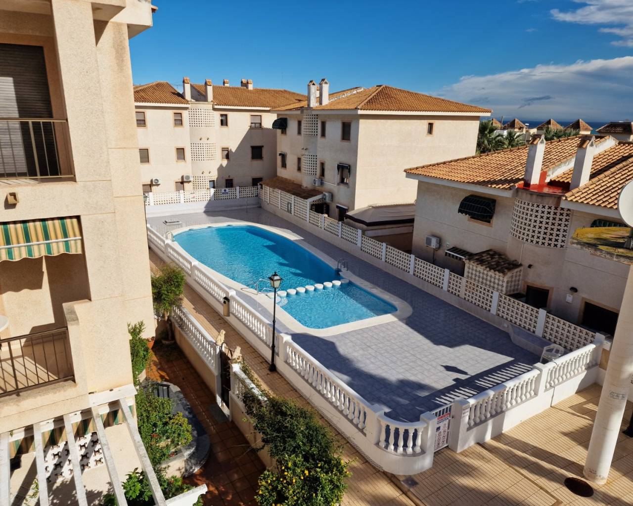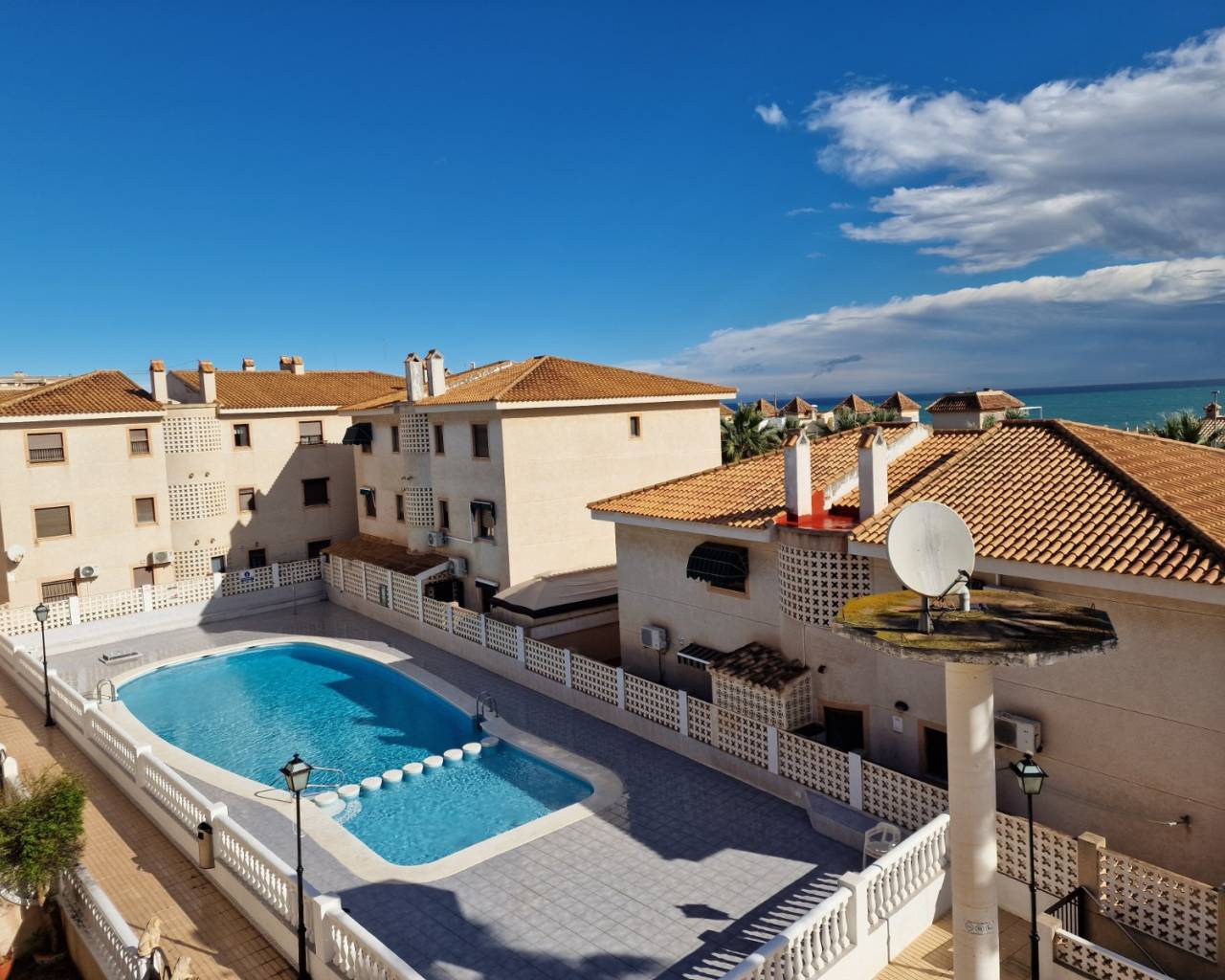 Set across two levels, the apartment features three double bedrooms, two bathrooms, and a bright living-dining area that opens onto a large terrace. From here, you can soak up views of the landscaped communal pool and enjoy the region’s famous sunshine. The property is in excellent condition, move-in ready, and benefits from air conditioning and heating, ensuring comfort in every season.