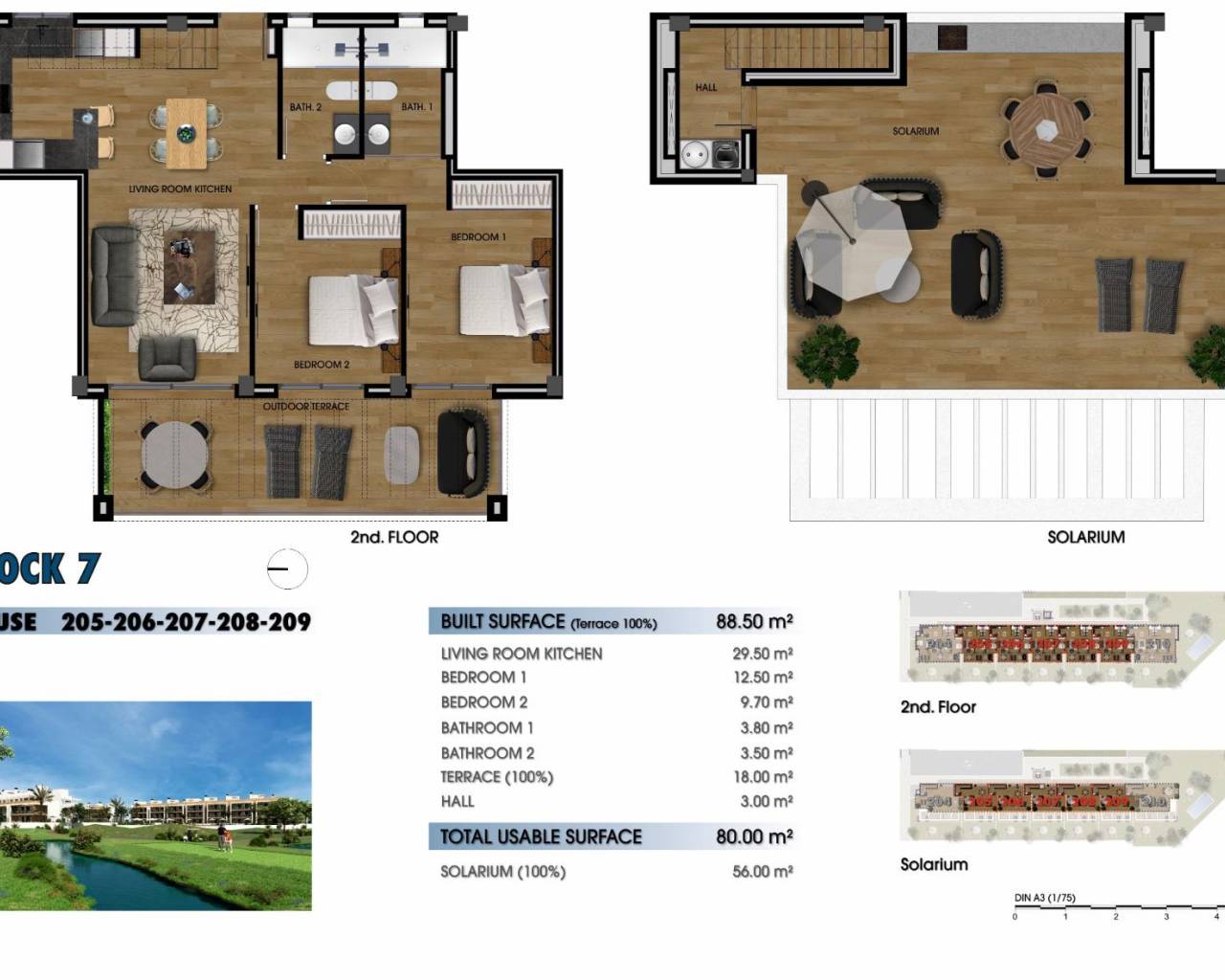 NEW BUILD RESIDENTIAL COMPLEX NEAR LA SERENA GOLF, LOS ALCAZARES This amazing complex will be formed by 244 apartments with 2 and 3 bedrooms, divided in 8 blocks and 20 private Villas. Modern apartments in 3 floors (ground floor plus 2), ground floor with nice gardens, and some of them with private swimming pool and second floor with nice terraces and private solariums. Corner apartments (4 per floor) and top floor apartments has 3 bedrooms and the rest 2 bedrooms. East facing properties looking to the communal areas and West facing with wonderfull golf course views. Complex with the communal pool and the communal areas. Every apartment have their own parking space and private storage on the basement, included on the price. Residential located in a frontline of the prestigious golf course “La Serena Golf”. This golf course is well renowned for its lakes and vegetation that interweave with the golf course. The water and lakes are present in 16 of the 18 holes, but all the course is designed to offer the golfer different strategies in each hole. Another aspect that makes this golf course unique is that it’s connected by walking to the city centre, something impossible to find in other golf locations that allow us to enjoy the calm and the beauty of the area without refusing the access to the services that Los Alcázares offers. Los Alcázares an exceptional area on the Costa Cálida at only 25 minutes from Murcia airport and 55 min from Alicante airport. The area is connected through highway with the cities of Cartagena, Murcia and Alicante and the rest of the beaches of the Costa Cálida and the Costa Blanca.