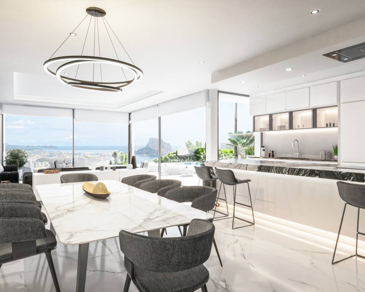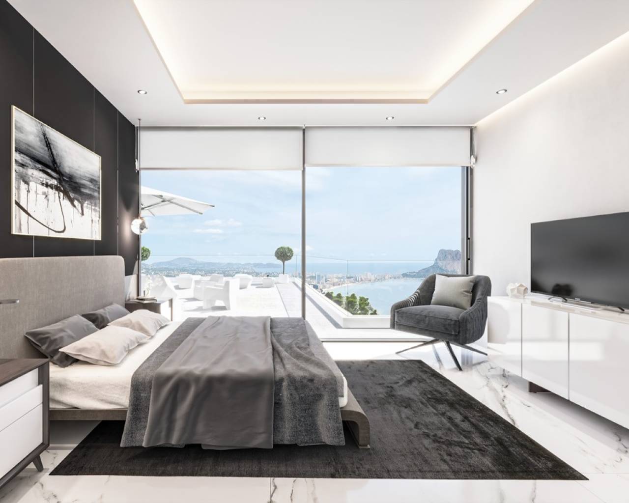 New build villa for sale with sea views in Calpe, located in a quiet residential area 2 km from Puerto Blanco and the beach. On the ground floor there is a spacious living room with an open kitchen that gives access to the terrace, the infinity pool and the BBQ area. There is also a double bedroom with an en-suite and a dressing room and a guest toilet. On the first floor there are 3 double bedrooms, all with dressing room, en-suite and terrace. In the basement, which is connected by elevator to the rest of the house, there is a large double garage, an entrance hall, a multifunctional room of 60m2, a storage room, a utility room and a bathroom. The villa is built with only high quality materials, more information available on request.