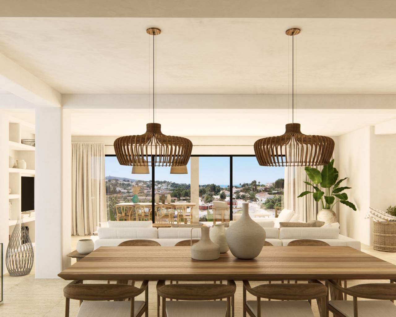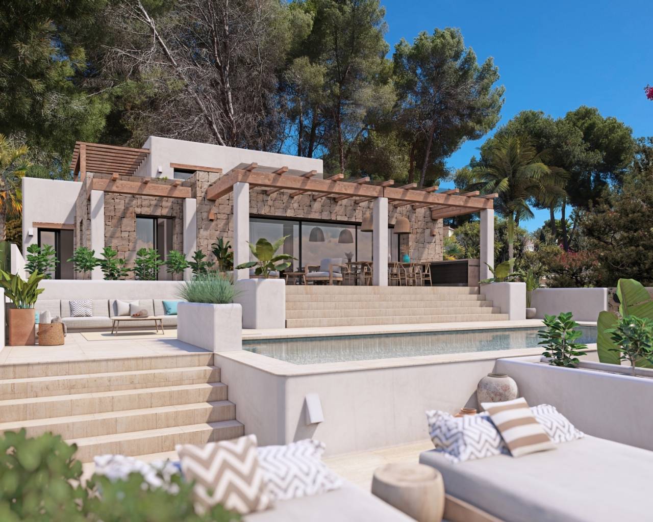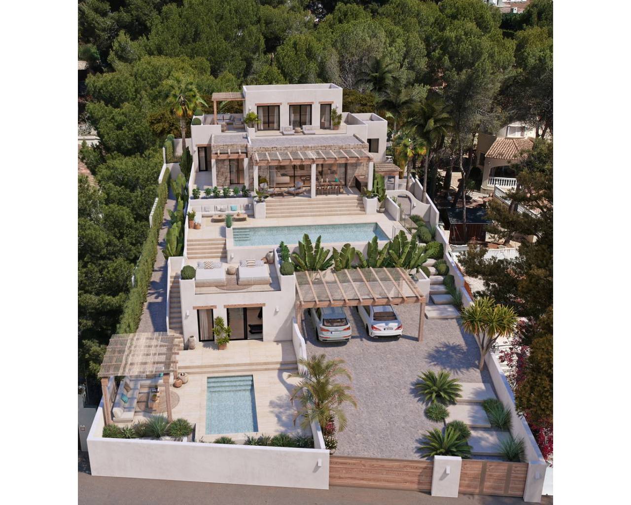 Ibizan chalet under construction. Completion date 2025. Luxury Ibizan villa with beautiful views of the mountains and the sea. The house has 400m2 on a plot of 950m2. It is distributed in 4 bedrooms, 4 bathrooms, 1 guest toilet, open kitchen, laundry room, large living room with porch, large terrace and pool, gym and wine cellar. There is a guest appartment with living room,open kitchen,1 bedroom, bathroom and its own pool. The entire house has air conditioning and heating.