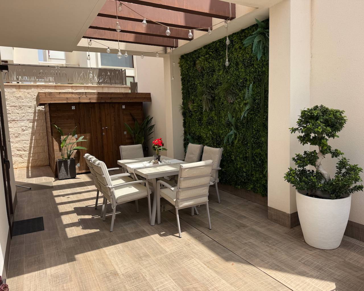 This villa is designed for relaxed Mediterranean outdoor living. The south-facing garden features a private swimming pool, jacuzzi, and landscaped spaces, complemented by a spacious terrace perfect for sunbathing or alfresco dining. A garden shed adds storage convenience, while the rooftop solarium offers panoramic views and a tranquil space to unwind.