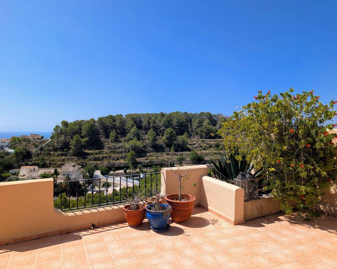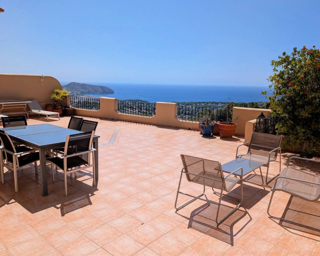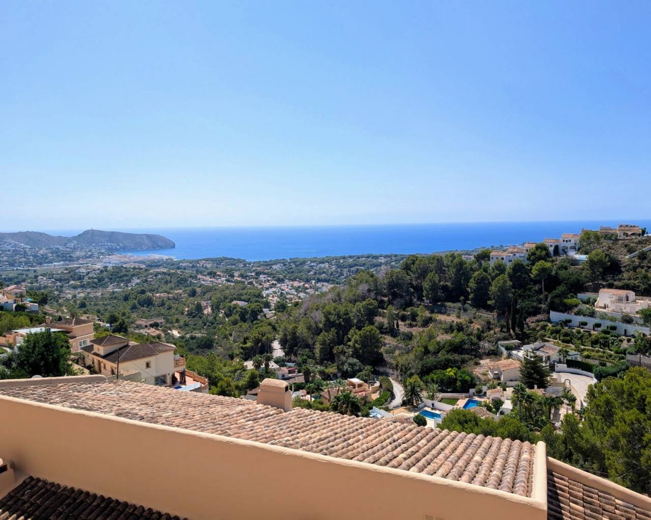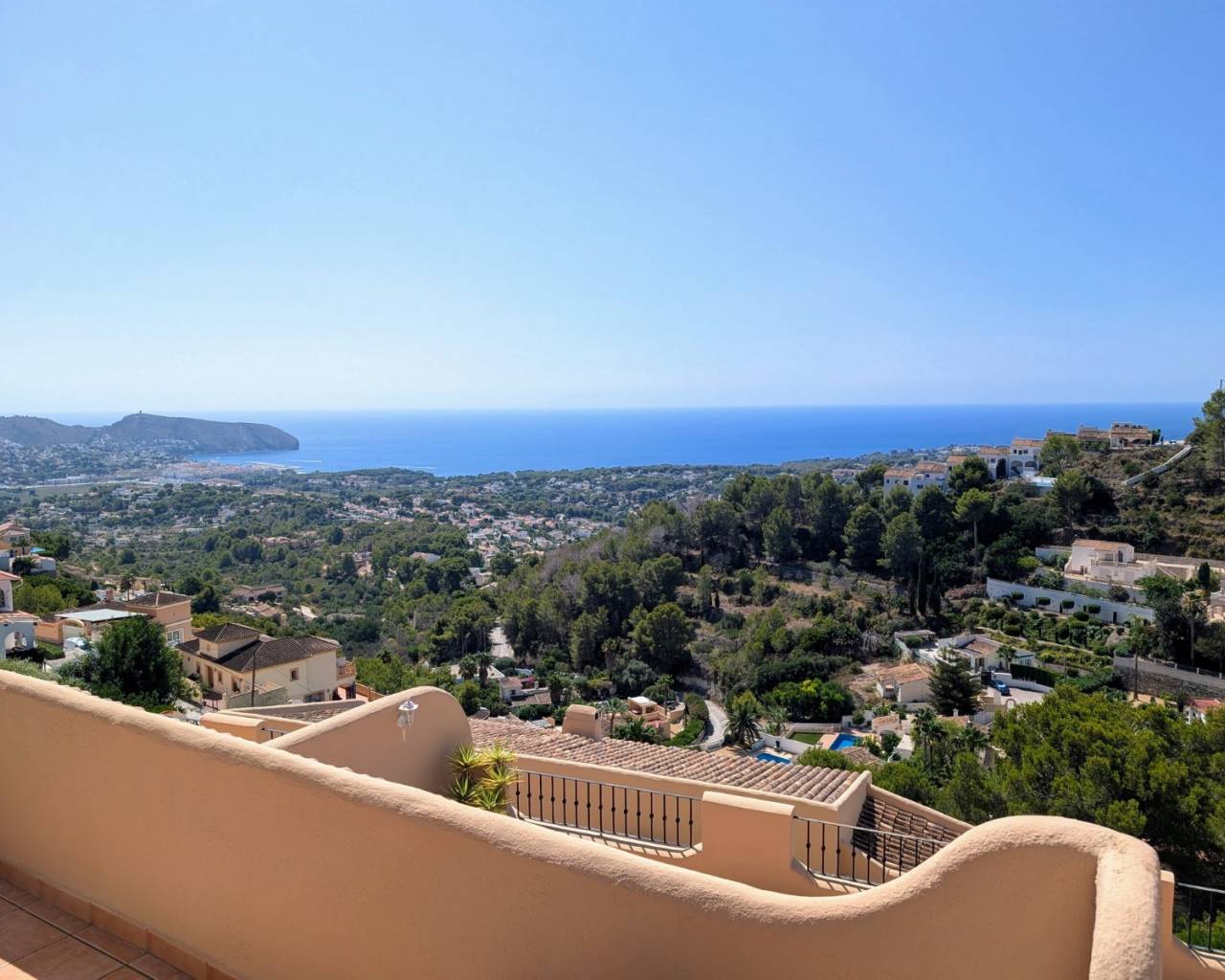 This spacious and luminous property offers remarkable views and sun all day. The property is distributed over two floors and is only a short walk to the superb community pool and a short drive to the supermarkets, beach and town centre. The principal entrance is only a short flat walk from the allocated parking space. You enter into a bright hallway and then straight into the spaciious living area, to the left is a modern, open kitchen with gloss white units and Baltic Brown granite worktops which includes all of the appliances necessary. To the right is a spacious living area which leads directly to a glazed naya with amazing views that is used as a dining room. Outside the naya there is an open terrace with awnings big enough to relax, barbecue and dine alfresco. To the right in the entrance hall you will find the master bedroom, a spacious room with built-in wardrobes, glazed doors leading out to the terrace and an en-suite bathroom including bath with shower attachment and a vanity unit. Down the well lit staircase in the hallway you reach the lower floor and a hallway leading to the outside terrace. On the right is a double bedroom with built-in wardrobes and on the left is a house shower room, a linen cupboard and another double bedroom with built-in wardrobes. Further into the back of the villa you find a large multi-purpose room, perfect for kids or for adults! Off this room is a small hallway including a laundry area, a spacious shower room and a large bedroom with two dressing rooms. Outside the lower floor is a huge (96m2 +/-) open terrace with an open naya and wonderful views over Moraira and to the sea.- Key points:- Built 1992- Present owner since 2021- Remarkable sea and mountain views that cannot be spoiled- Quiet area- Secure complex- Well run community- A short walk to the community pool which was recently renovated- Air conditioning- Double glazed windows with mosquito screens- Offered furnished and ready to move in- Community fees 1160€ per year- Annual taxes 839€ (property tax and rubbish tax)- Fibre internet available- Distances:- International supermarket and a large choice of restaurants 3.4km- Beach 3.4km- Town centre 5.2km- Golf 2.6km- Motorway access in Benissa 5.9km- Do not miss this chance to own this lovely villa