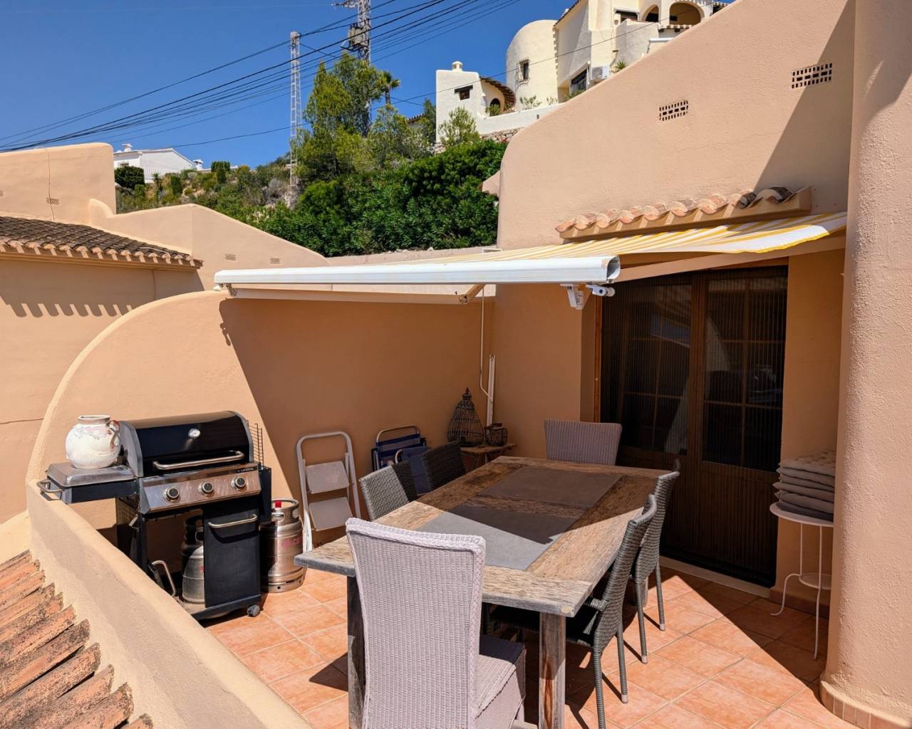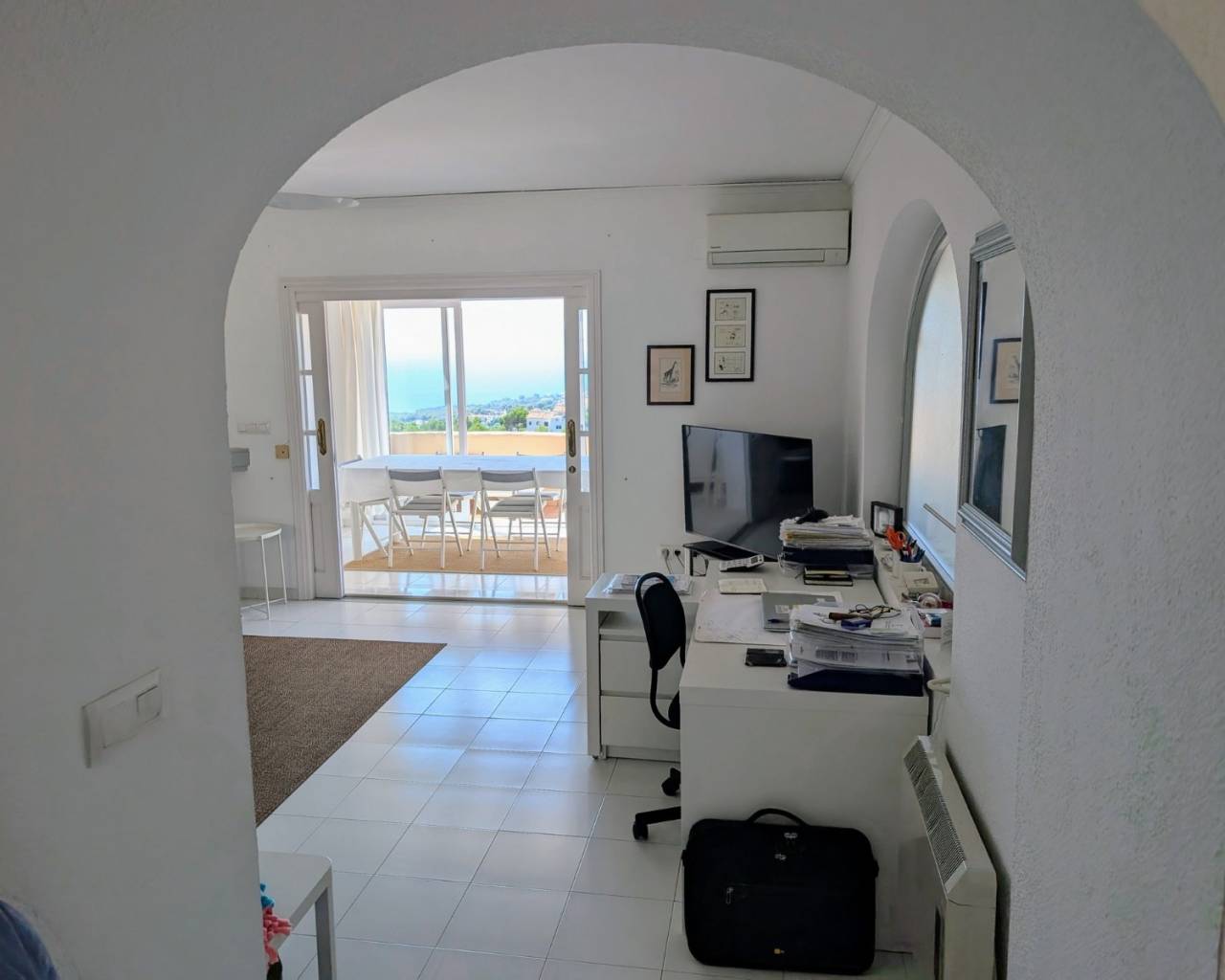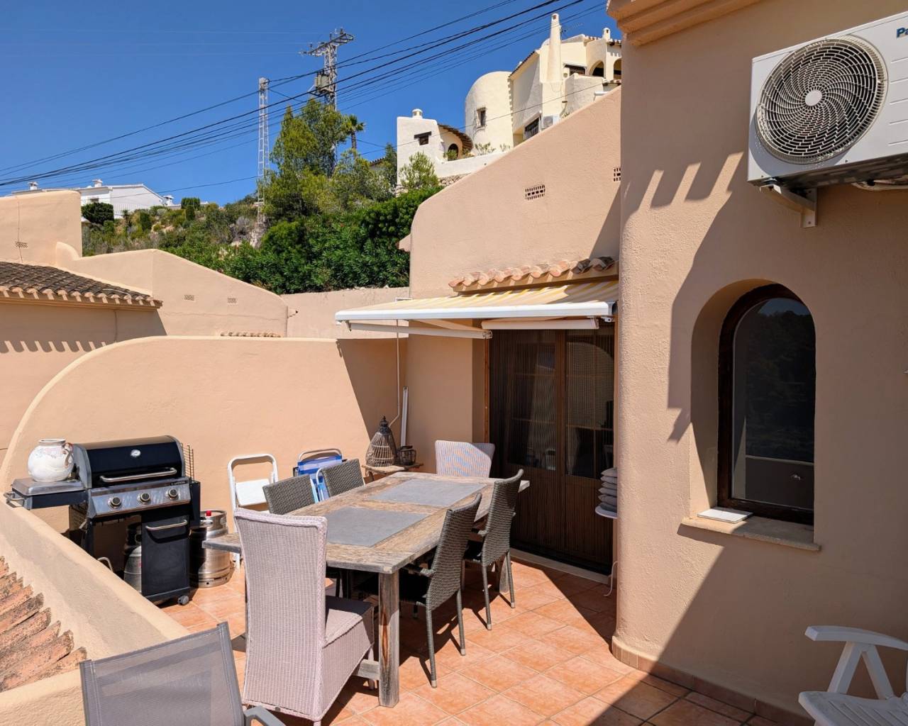 This spacious and luminous property offers remarkable views and sun all day. The property is distributed over two floors and is only a short walk to the superb community pool and a short drive to the supermarkets, beach and town centre. The principal entrance is only a short flat walk from the allocated parking space. You enter into a bright hallway and then straight into the spaciious living area, to the left is a modern, open kitchen with gloss white units and Baltic Brown granite worktops which includes all of the appliances necessary. To the right is a spacious living area which leads directly to a glazed naya with amazing views that is used as a dining room. Outside the naya there is an open terrace with awnings big enough to relax, barbecue and dine alfresco. To the right in the entrance hall you will find the master bedroom, a spacious room with built-in wardrobes, glazed doors leading out to the terrace and an en-suite bathroom including bath with shower attachment and a vanity unit. Down the well lit staircase in the hallway you reach the lower floor and a hallway leading to the outside terrace. On the right is a double bedroom with built-in wardrobes and on the left is a house shower room, a linen cupboard and another double bedroom with built-in wardrobes. Further into the back of the villa you find a large multi-purpose room, perfect for kids or for adults! Off this room is a small hallway including a laundry area, a spacious shower room and a large bedroom with two dressing rooms. Outside the lower floor is a huge (96m2 +/-) open terrace with an open naya and wonderful views over Moraira and to the sea.- Key points:- Built 1992- Present owner since 2021- Remarkable sea and mountain views that cannot be spoiled- Quiet area- Secure complex- Well run community- A short walk to the community pool which was recently renovated- Air conditioning- Double glazed windows with mosquito screens- Offered furnished and ready to move in- Community fees 1160€ per year- Annual taxes 839€ (property tax and rubbish tax)- Fibre internet available- Distances:- International supermarket and a large choice of restaurants 3.4km- Beach 3.4km- Town centre 5.2km- Golf 2.6km- Motorway access in Benissa 5.9km- Do not miss this chance to own this lovely villa