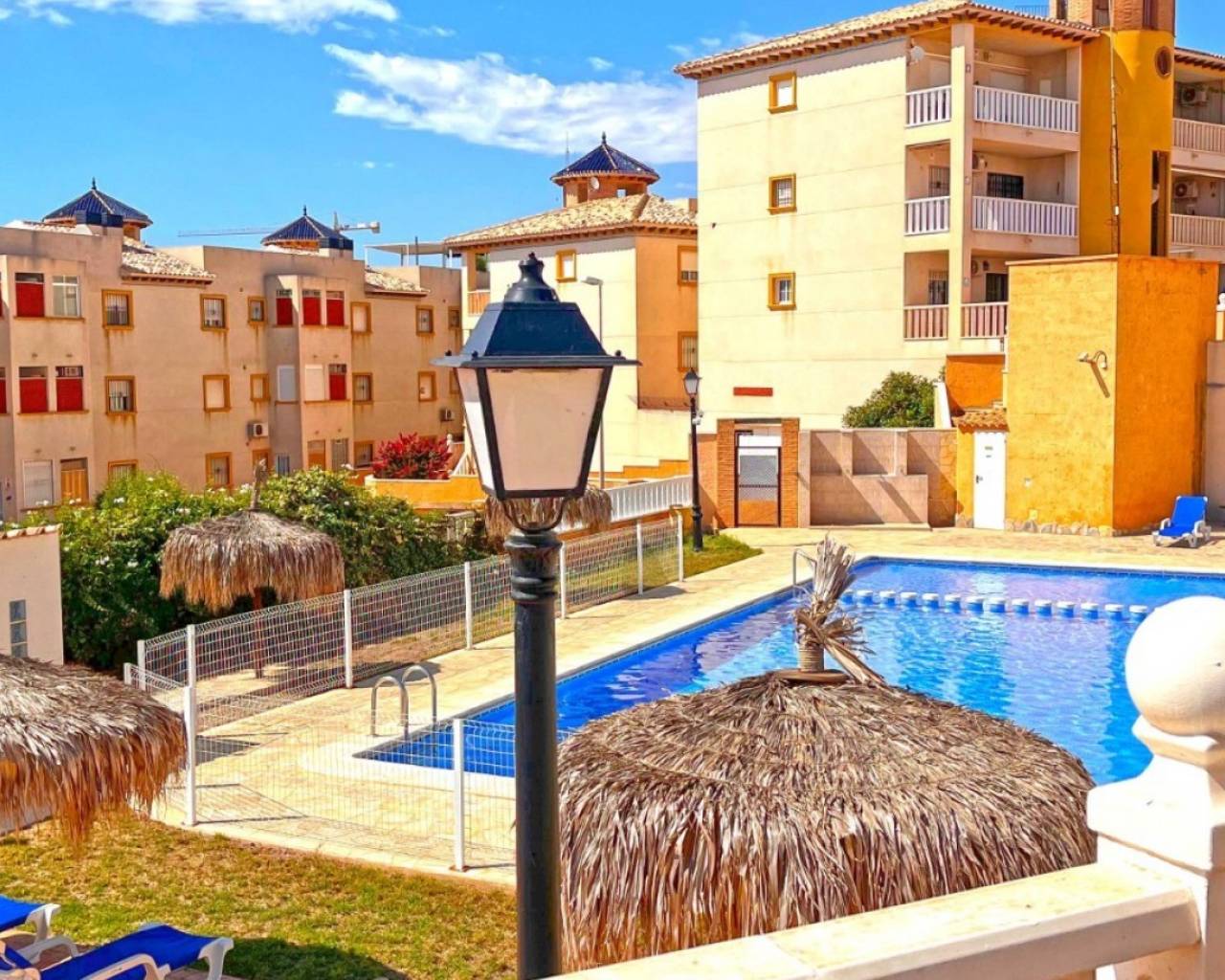 We are delighted to present this charming ground floor apartment located in the sought-after area of Lomas de Cabo Roig, just a short distance from the beaches and golf courses of Orihuela Costa. The property offers 2 bedrooms, 1 bathroom, a well-equipped independent kitchen, and a bright living and dining area. The home stands out for its generous outdoor spaces: a large front terrace with open views of the surrounding nature, perfect for enjoying the Mediterranean climate, and a spacious rear patio ideal for relaxing or entertaining. Situated in good condition and filled with natural light throughout, the apartment provides both comfort and convenience. Residents can also enjoy access to a well-maintained communal pool, making it an excellent choice for holidays, permanent living, or as a rental investment. All essential services—including shops, restaurants, and supermarkets—are within walking distance, ensuring a relaxed and practical lifestyle. Key Features: Ground floor apartment in Lomas de Cabo Roig 2 bedrooms & 1 bathroom Independent, fully equipped kitchen Bright living spaces Large terrace with open nature views Spacious rear patio Communal pool Good condition throughout Walking distance to all services