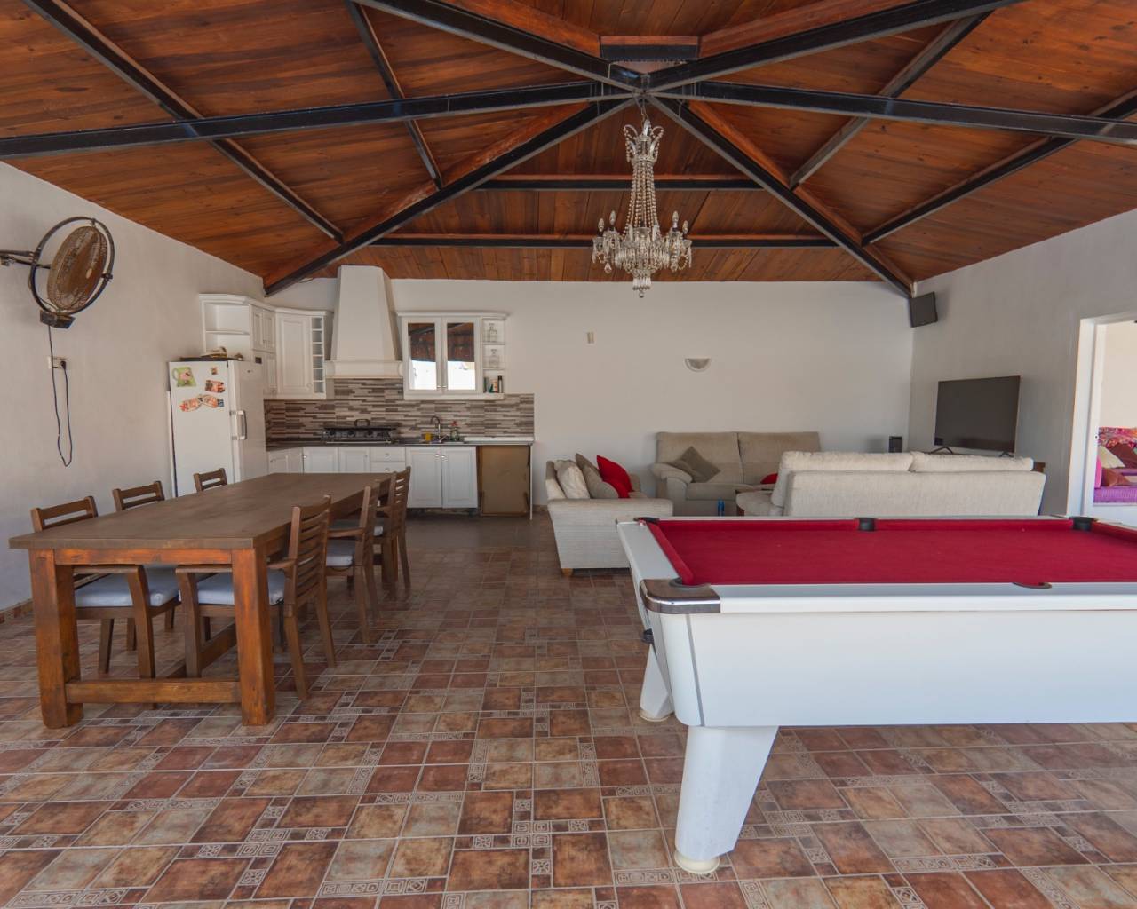 The main villa offers four bedrooms and three bathrooms plus a cloakroom. The master suite includes a walk-in wardrobe and a luxurious en suite bathroom with both bath and shower. Two further bedrooms also benefit from private en suites, while another room is currently fitted as a golf simulator but could easily serve as a fifth bedroom. A country-style modern kitchen opens to the dining area with direct access to the terrace, providing wonderful views across the pool and gardens.