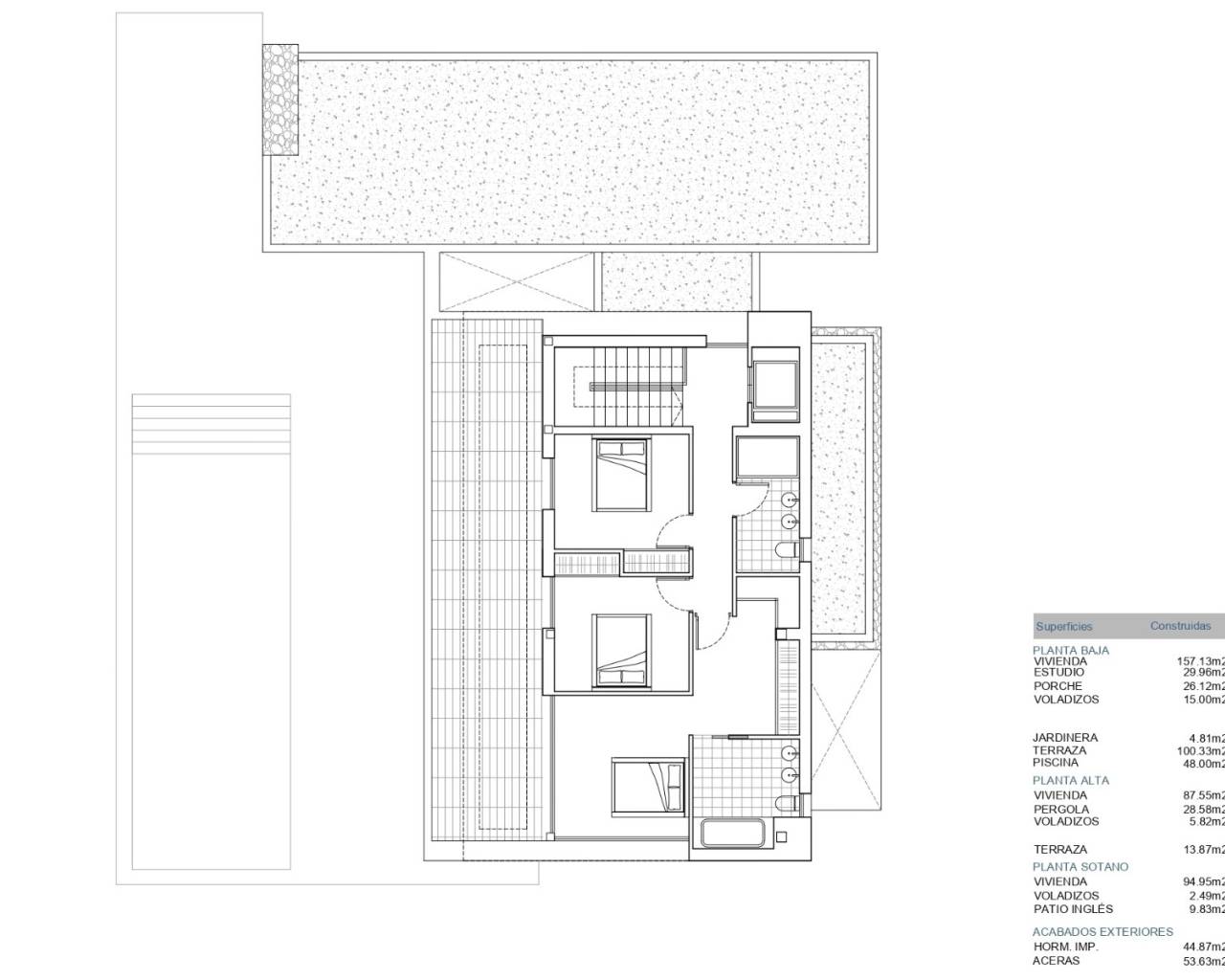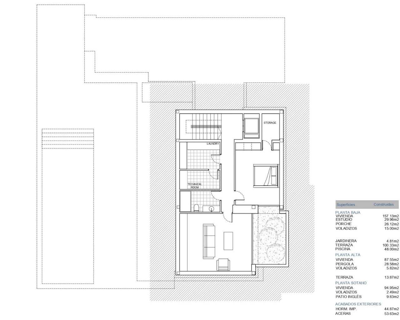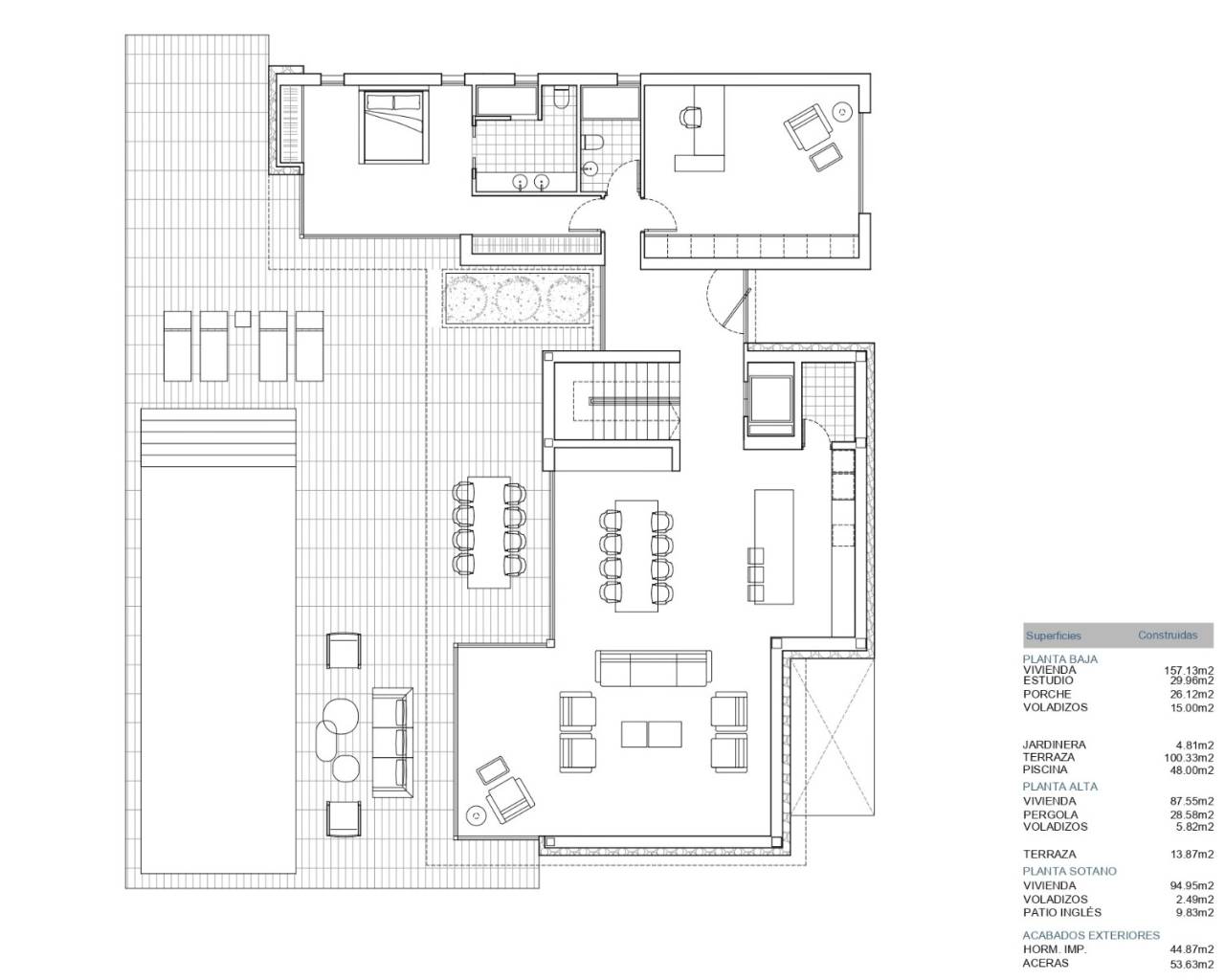 This stunning villa is to be built in the Benimeit area of Moraira, just a 7 minute drive to the beach and town centre. The villa will be distibuted over 3 floors with the main living level having direct access to the pool terrace. The main living level consists of a spacious open plan living area including a open kitchen with pantry and island, a double bedroom with en-suite bathroom, a guest toilet and a spacious office which could be a 5th bedroom. The first floor consists of a double bedroom with en-suite bathroom and dressing area, two further double bedrooms and a shared bathroom. The 94m2 basement consists of a large room which could be used as a wellness room/gym, a bathroom, laundry, technical room and an English patio. For your convenience the three floors have a connecting staircase and a lift, The spacious pool terrace has a covered area for shade and a luxury 12 x 4m pool with pool shower.- Key points:- Top quality tiles, inside and outside- Lacquered aluminium doors and windows, clients choice of colour- Double glazed security windows with Climalit, electric blinds in the bedrooms- 2.3m high internal doors finish to be selected- Luxury kitchen to be chosed by client- Railings inside and outside to be glass- Bathrooms to be chosen by client- Underfloor heating by heatpump- Air conditioning in living room and bedrooms- Pool to be supplied with steps, 2 LED lights and a pool shower hot/cold- For further information about this project please do not hesitate to contact us- Distances- Small shopping centre 1.1km- Town centre, beach and marina 2.9km- Golf 3.9km- Motorway access in Benissa 6.9km
