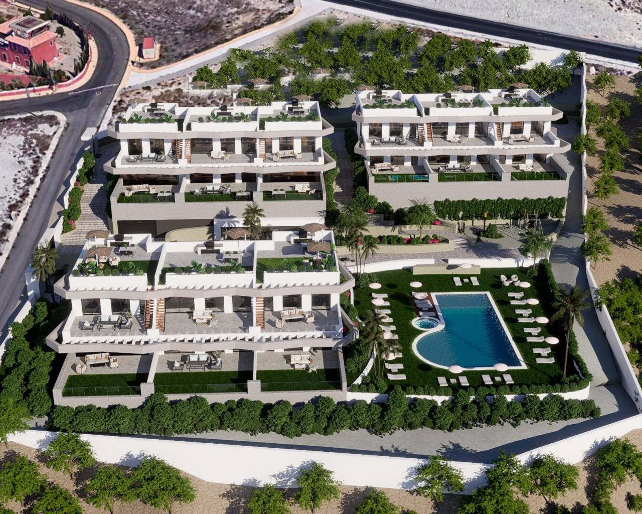 NEW BUILD RESIDENTIAL COMPLEX IN FINESTRAT New Build unique and exclusive high standing residential complex in Balcon de Finestrat. This complex of modern bungalows with 2 and 3 bedrooms, all with 2 bathrooms, open plan kitchen with the living and dining room. Top floor bungalows with private solarium and ground floor bungalows with private garden and possibility of private pool at an extra cost. Properties has loads of natural light and designer island in the kitchen. Lift in all homes. Sustainable construction with energy certificate A. Each property has private parking. Indoor Fitness Gym. Bio-healthy area for sports. Communal swimming pool. Indoor and outdoor LED lighting pack. High quality materials and brands. The properties have access to a large swimming pool and enjoy one of the best locations on the Costa Blanca. It is a great opportunity and privilege to be able to live with this environment of golf and beach, close to all amenities of all services considered one of the best places to invest. Finestrat located in the Marina Baixa region of the Costa Blanca. Benidorm is just a five-minute drive from the properties and offers all the services you would need including shops, bars, restaurants, supermarkets, banks, pharmacies and several private international schools. Close to the beaches of Levante, Poniente and Cala de Finestrat, with more than 6km in length that are among the best in Europe awarded by the European Union with Blue Flags. All leisure services such as the theme parks of Aqua Natura, Terra Mítica, Terra Natura, Aqualandia and Mundomar, Sierra Cortina and Villaitana Golf courses, hiking and climbing in Puig Campana an incomparable natural setting or enjoy of nautical sports. Distance to the sea 4 km, to the airport 26 km and to the golf 1km. Complex located 40 minutes from Alicante airport.