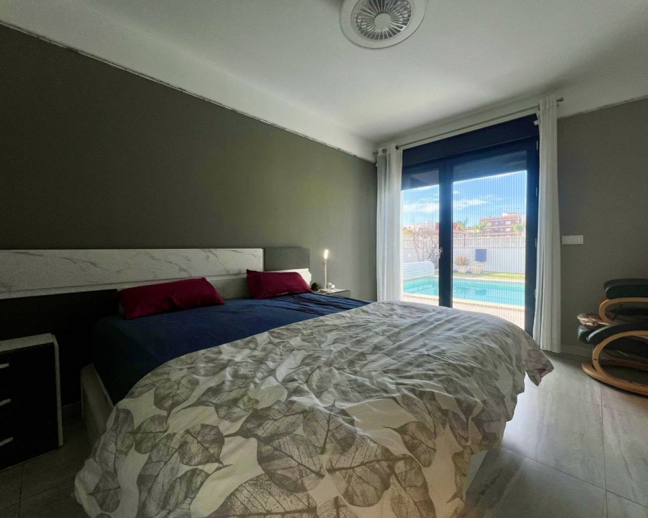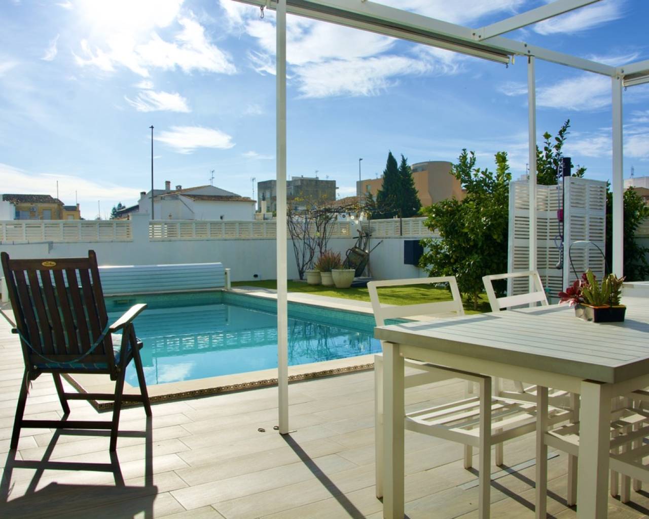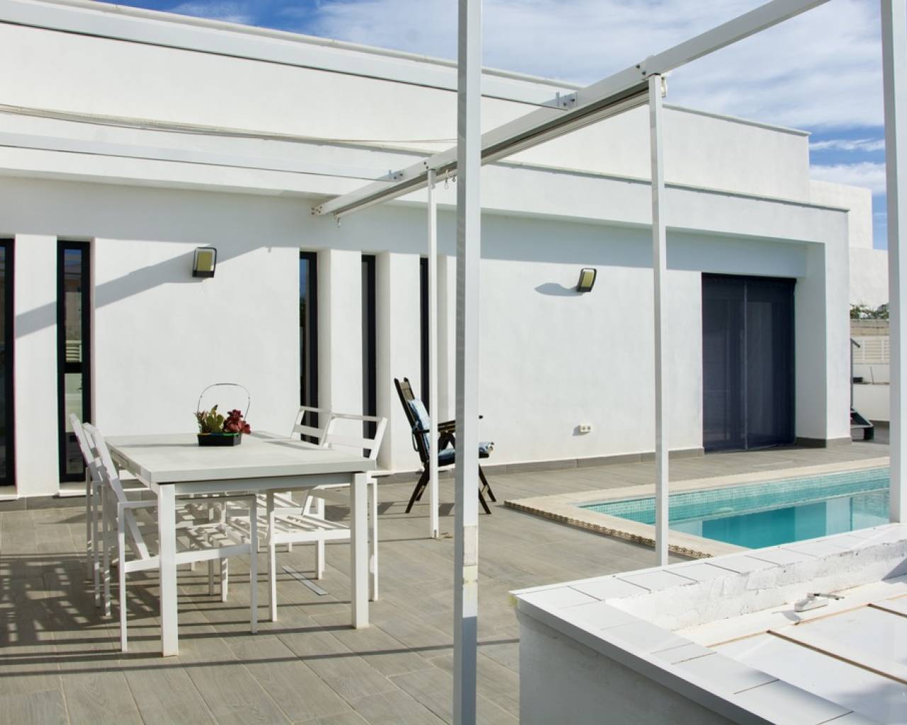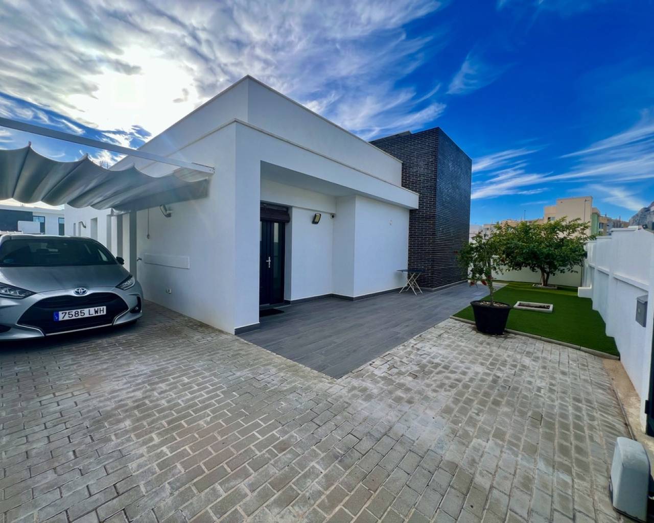This magnificent modern villa, built in 2019 with high-quality materials, combines contemporary design, energy efficiency, and an unbeatable location. Situated just steps from the town center and all amenities, in a very quiet residential area, it offers the convenience of living close to everything without sacrificing peace and quiet. The property features a spacious and bright open-plan living and dining room with a fully equipped kitchen, three bedrooms (one currently used as an office), and two bathrooms with showers. The master bedroom has an en-suite bathroom and direct access to the terrace, as does the living room. Thanks to its large windows, the house enjoys excellent natural light throughout the year. Outside, a well-maintained garden with lush vegetation and fruit trees surrounds the property, offering several storage spaces ideal for use as utility rooms or storage areas. The villa also boasts an upper terrace with views of the surrounding mountains, where the solar panels and hot water system are located. Its sustainable design guarantees minimal energy consumption: it has an A energy rating, a solar panel system, a 3,600 liter rainwater reserve for irrigation and underfloor heating throughout the house with 100 liter water heating. The outdoor area includes a beautiful 8x4 meter swimming pool, perfect for enjoying the Mediterranean climate. The property is sold fully furnished and ready to move into. A home to enjoy year-round, combining style, comfort, and sustainability.