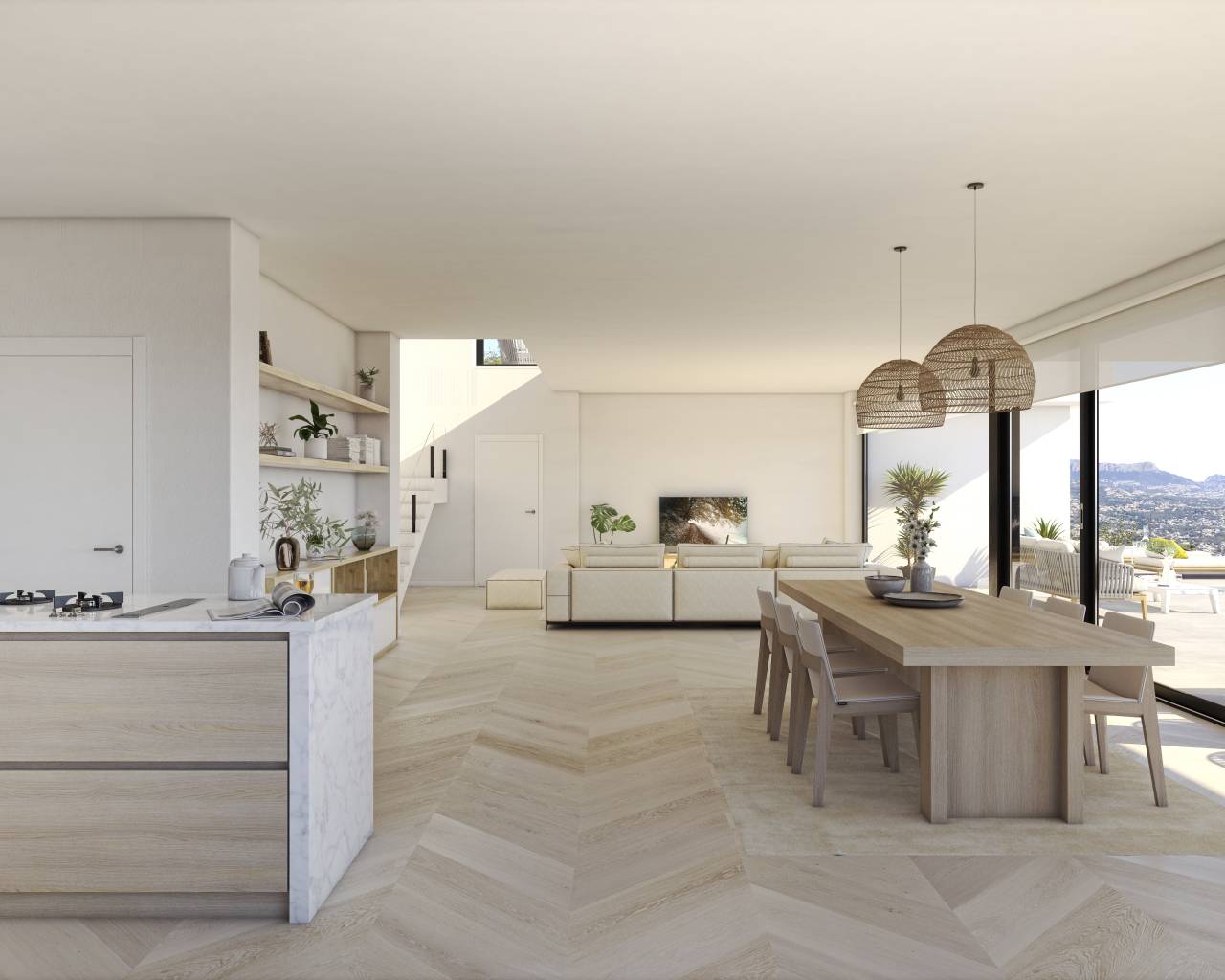 Villa La Isla is situated on an exclusive plot within the residencial Jazmines estate in Cumbre del Sol. It is a house that combines contemporary luxury, functional design and a fabulous location facing the Mediterranean. Its name evokes isolation in the best sense: a secluded place, quiet and connected to the beauty of the landscape. Its modern architecture, with straight lines and noble materials, adapts to the uneven terrain seamlessly and multiplies the views with large windows and terraces that face the horizon. The interior spaces are designed to flow naturally. The main floor features an open and bright daytime area, where the kitchen, dining room, and living room are seamlessly integrated. The four bedrooms, three of which are located on the top floor and the master bedroom, located on the middle floor, offer privacy and open sea views. This house features a large porch on the ground floor, which can be used for different purposes, such as a gym, office, a chill-out space or for whatever its future owner wishes. The house is equipped with advanced energy efficiency and comfort systems, including aerothermal heating, underfloor heating, ventilation with heat recovery, solar panel installation, and home automation. It is designed to achieve a sustainable and intelligent living experience in harmony with its surroundings. You can gaze at the blue sea from any point of Villa La Isla. The architecture does not compete with the landscape; it frames it. And every sunset becomes a spectacle from the peace and quiet of this elegant home, designed for limitless enjoyment of the light and silence of the Mediterranean.