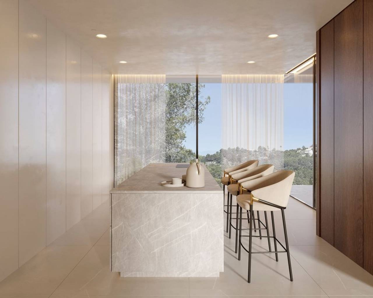 Located in Teulada Moraira, on the beautiful coast of Alicante, this modern home offering a stunning sea view. Built on a 1,601 m² plot, it features 350 m² of living space and 205 m² of terraces. The villa is spread over three floors connected by a private elevator. It includes four bedrooms, four bathrooms, a 51 m² garage, and a 71 m² private pool. Large windows fill the spaces with natural light and open the house to the outdoors. The modern kitchen is fully equipped with high-end finishes. The villa also features 6 kW solar panels for better energy efficiency. Every detail has been designed for comfort and relaxation in a quiet setting close to the sea. The spacious terraces offer beautiful views of the Mediterranean, perfect for enjoying the mild climate all year round. Can't wait to view this property in Moraira? Please feel free to contact us.