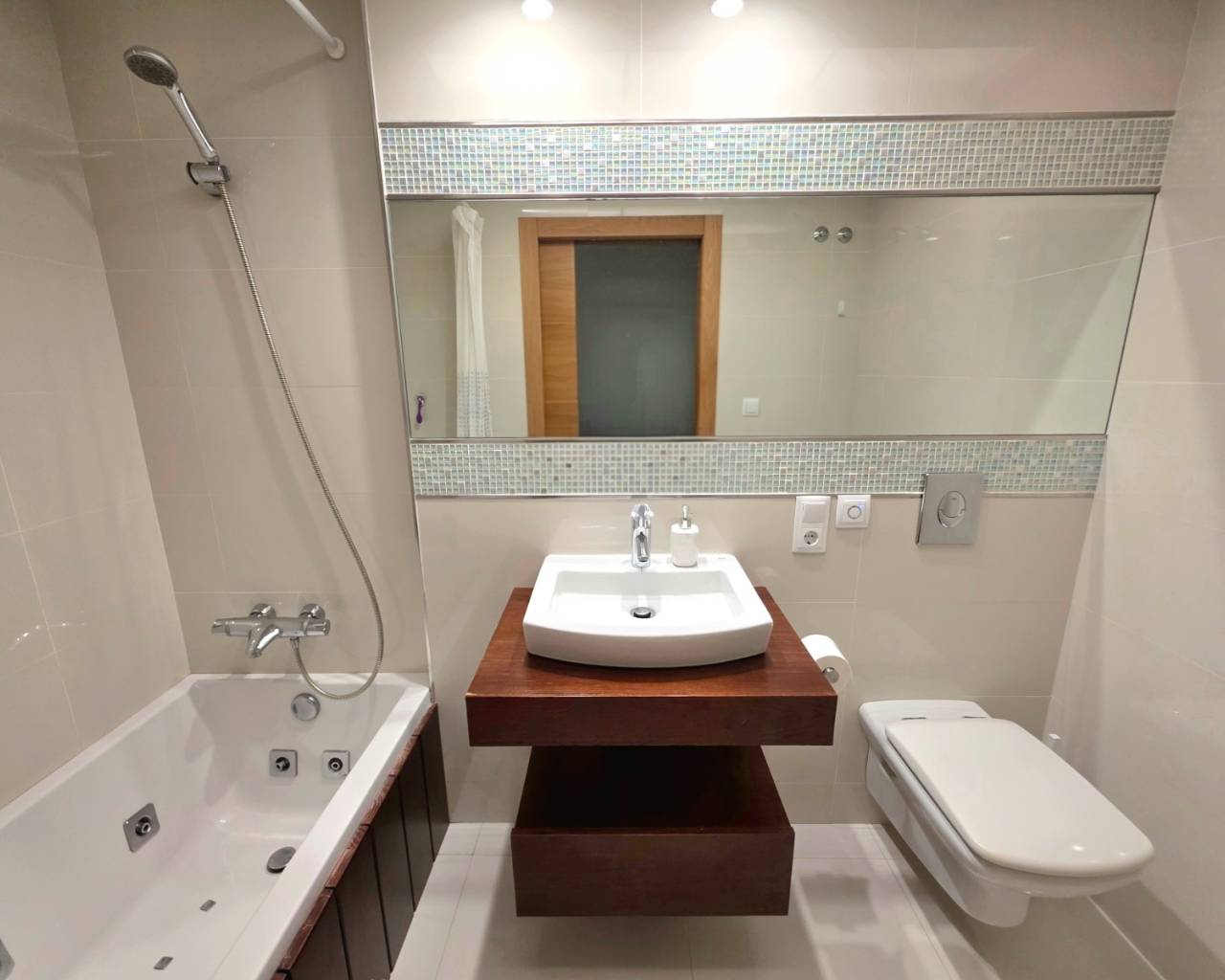 The fully equipped kitchen is practical and well-sized, ideal for both everyday living and entertaining. The apartment is sold in excellent condition, ready to move into with no immediate work required.
