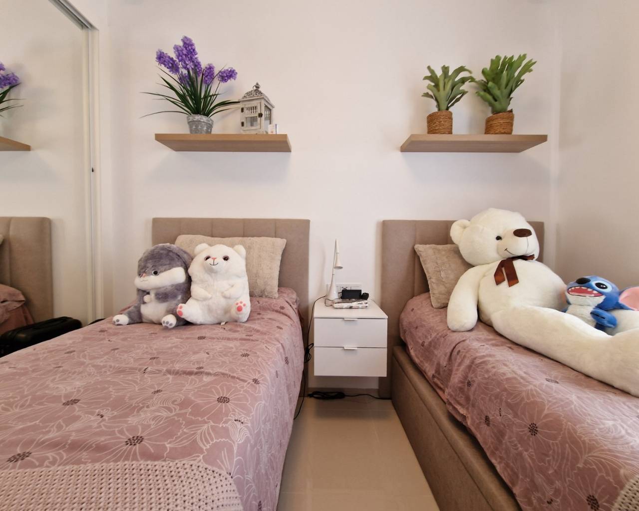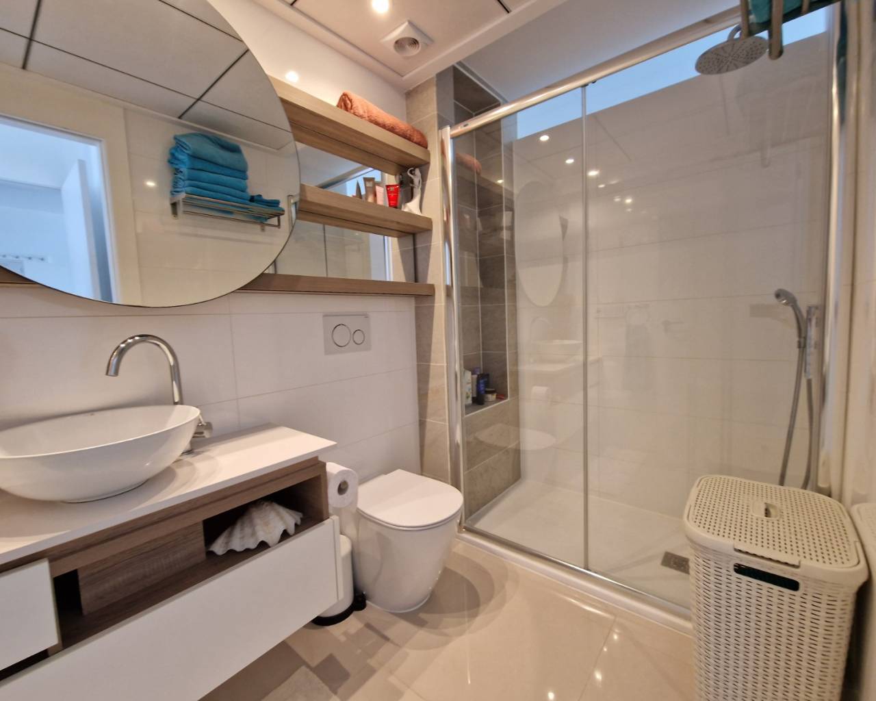 The property includes two double bedrooms with fitted wardrobes and two modern bathrooms finished to a high standard. Additional practical features include a separate laundry room equipped with washing machine and hot water tank, plus a second small storage room — ideal for bikes, golf clubs, or seasonal items.