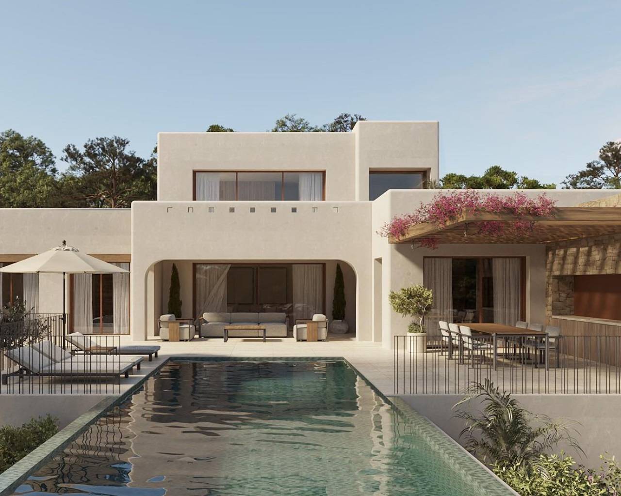 Luxury Ibizan Style Villa in La Fustera (Benissa Costa) Just 1 km from the Beach Mediterranean Retreat on the Northern Costa Blanca This exclusive collection of four single family villas is located in La Fustera, a prestigious residential area of Benissa on the Northern Costa Blanca. Blending the charm of Ibizan architecture with contemporary Mediterranean elegance, these homes offer privacy, sea views and a refined lifestyle in one of the most desirable coastal enclaves of the region. La Fustera is known for its crystal clear coves, natural surroundings and low density residential atmosphere. The villas are just 1 km from La Fustera Beach, allowing easy access to one of the most beautiful beaches in the area, with beachfront restaurants and scenic walking paths along the coastline. Prime Location Close to Calpe and Moraira The development enjoys a strategic position only 10 minutes by car from Calpe, Moraira and the center of Benissa, providing access to supermarkets, marinas, golf courses, international schools and medical services. The area combines tranquility with excellent connectivity to the main destinations of the Costa Blanca. Modern Layout with Sea Views and Infinity Pool This villa is distributed over two levels on a generous 876 m2 plot with double private parking. The ground floor features two bedrooms sharing a bathroom, a guest toilet with laundry area, and a bright living room with open plan kitchen. Large sliding doors connect the interior with a spacious terrace and private infinity pool overlooking the sea. On the upper floor, the master bedroom includes an en suite bathroom, dressing room and access to an impressive 54 m2 open terrace with panoramic sea views. Ibizan Design and High Quality Finishes Inspired by the clean lines and natural materials of Ibiza, the architecture combines cubic volumes, wood and stone to create warm and timeless spaces. Large windows maximize natural light and create a seamless flow between indoor and outdoor living. The villas are delivered with premium specifications including: Fully furnished kitchen with appliances Designer bathrooms with furniture Electric blinds Video intercom and alarm system Aerothermal system for hot water and underfloor heating Fully installed ducted air conditioning Distances to Key Points of Interest La Fustera Beach 1 km Calpe 7 km Moraira 8 km Ifach Golf Club 6 km Alicante Airport 80 km Valencia Airport 110 km Experience the Essence of Mediterranean Living If you are seeking a contemporary villa where design, comfort and nature come together in perfect harmony, this is your opportunity. Contact us today to receive more information or to arrange a private viewing of these exclusive villas in La Fustera, Benissa Costa. 456