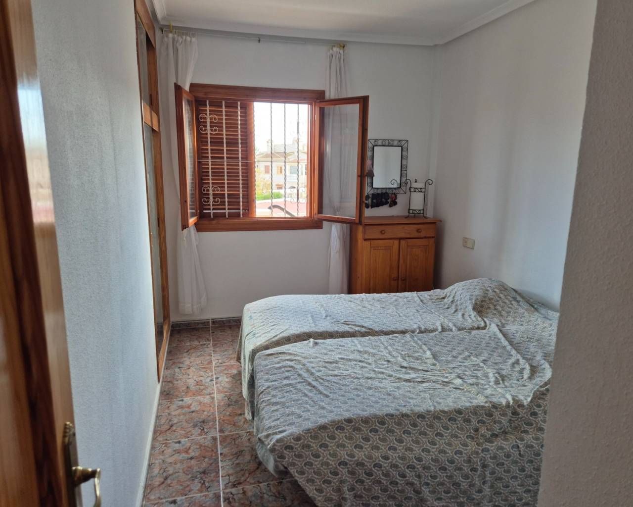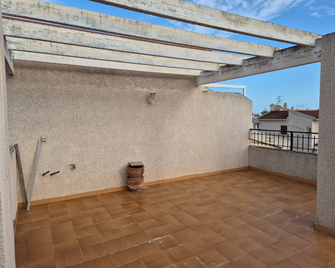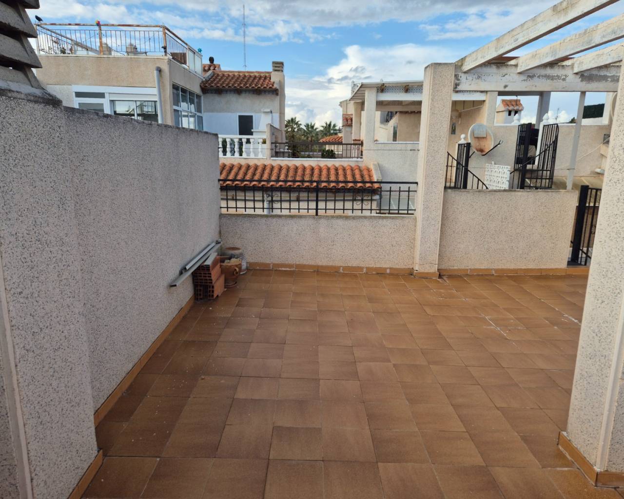 Top-Floor Bungalow with Private Solarium in a Peaceful Setting Discover this charming top-floor bungalow, perfectly located in a lovely and peaceful area. The property offers 2 comfortable bedrooms and a bright living space featuring a cozy fireplace—ideal for relaxing evenings at home. One of the highlights of this home is the private rooftop solarium, where you can enjoy open views and plenty of sunshine—perfect for outdoor dining, sunbathing, or simply unwinding in complete privacy. The property is part of a well-maintained community with access to two communal swimming pools, providing the perfect place to cool off and enjoy the Mediterranean lifestyle. A wonderful opportunity whether you’re looking for a holiday retreat, rental investment, or a tranquil place to call home.