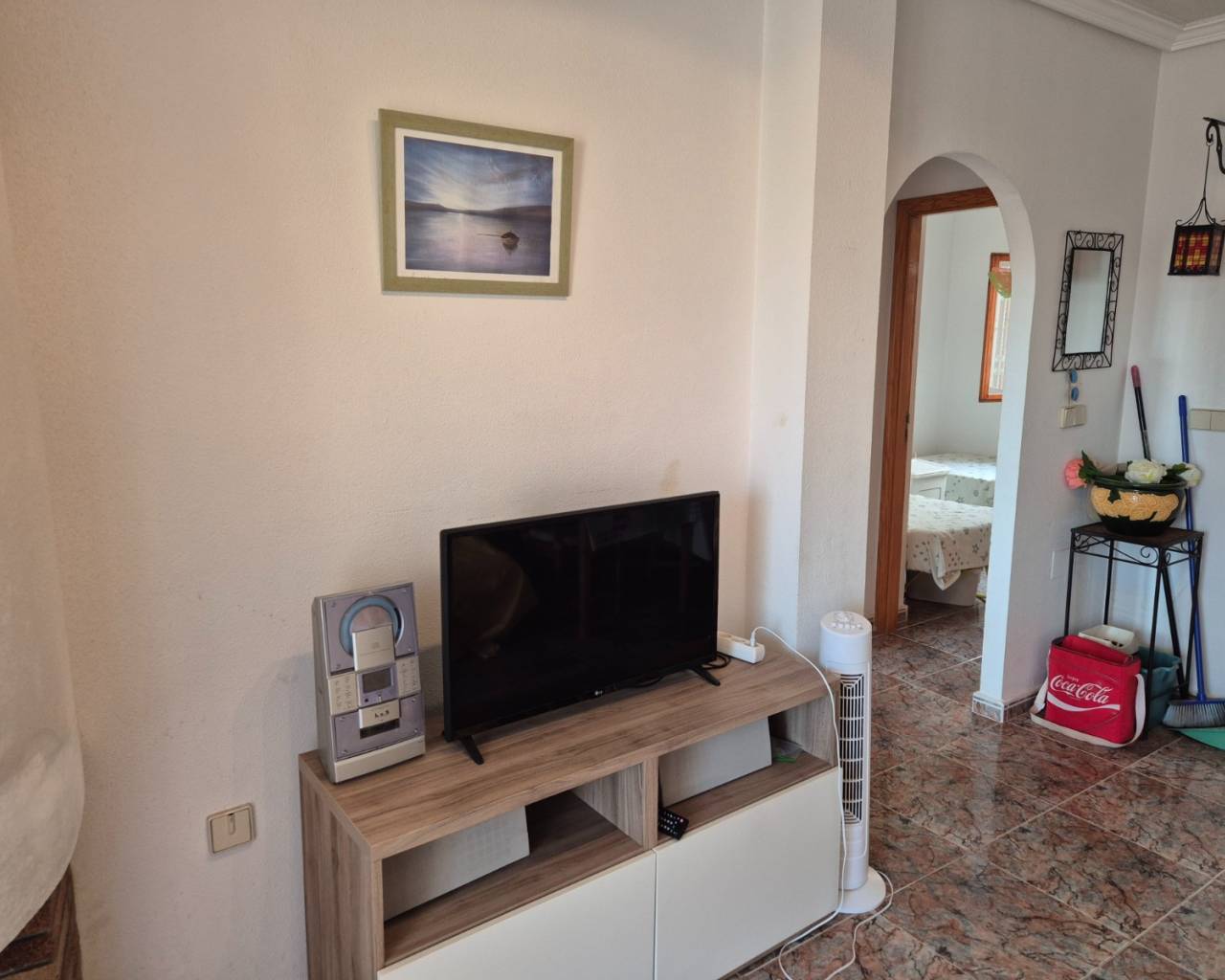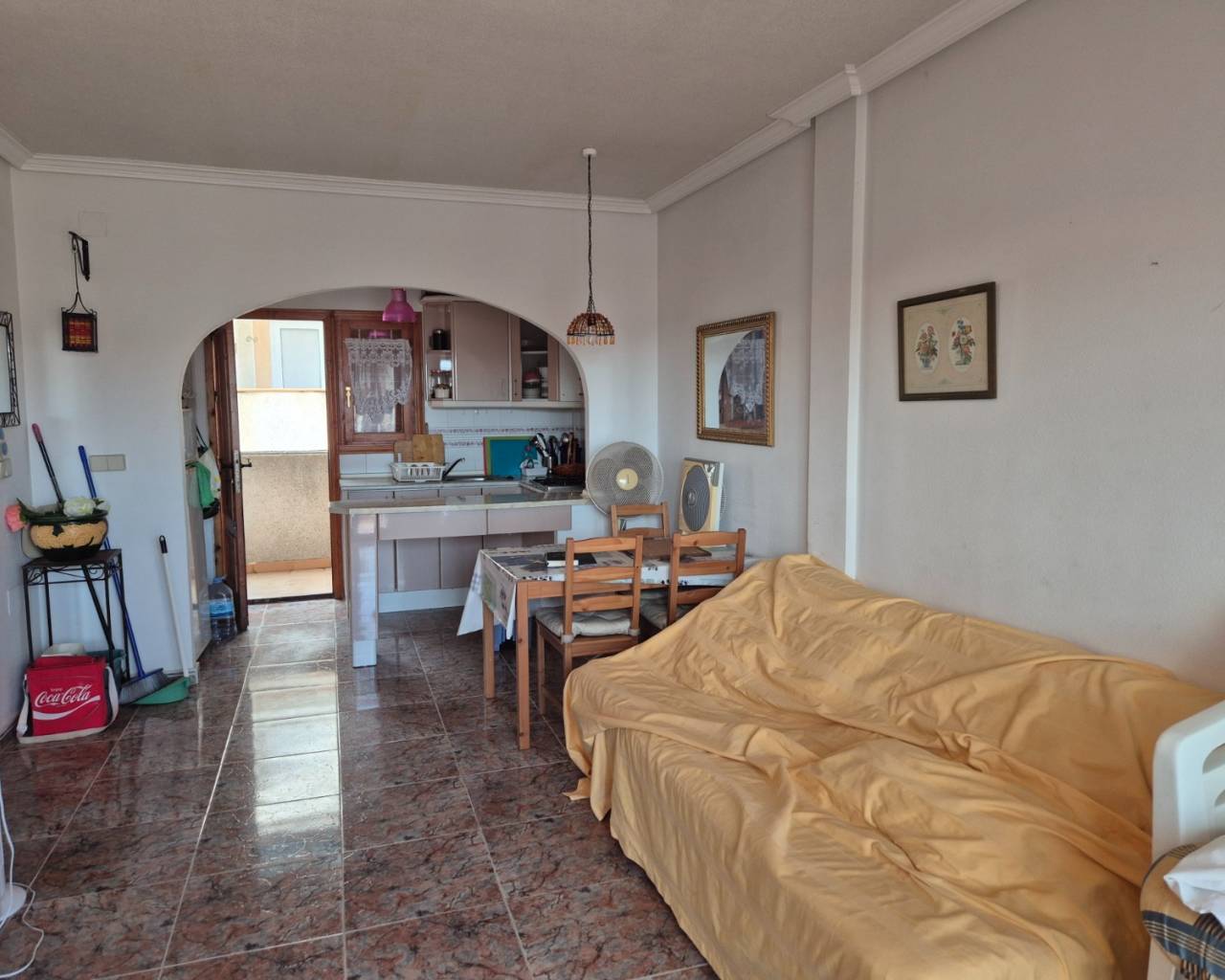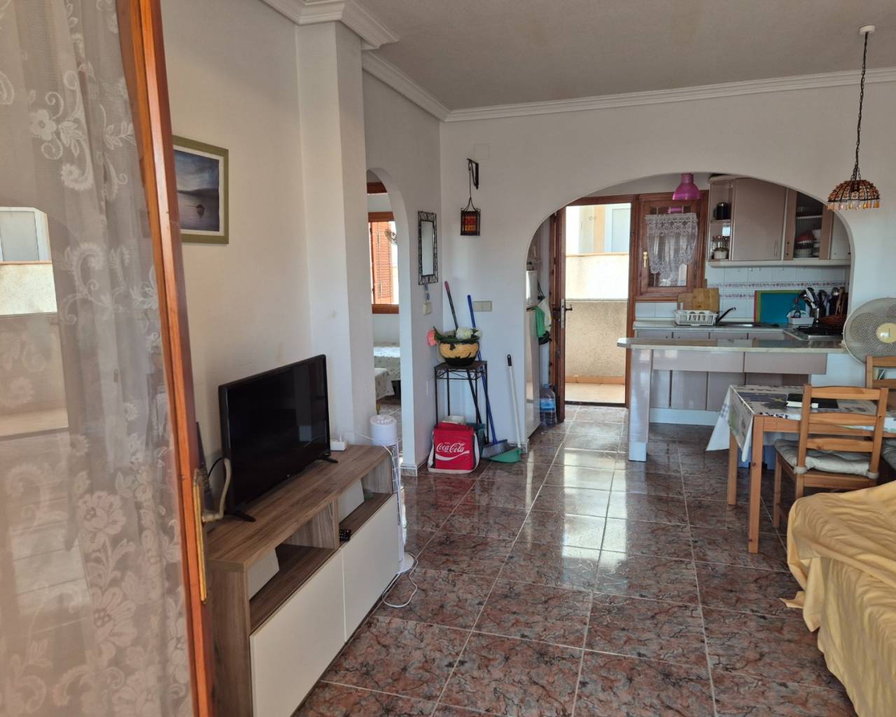 Top-Floor Bungalow with Private Solarium in a Peaceful Setting Discover this charming top-floor bungalow, perfectly located in a lovely and peaceful area. The property offers 2 comfortable bedrooms and a bright living space featuring a cozy fireplace—ideal for relaxing evenings at home. One of the highlights of this home is the private rooftop solarium, where you can enjoy open views and plenty of sunshine—perfect for outdoor dining, sunbathing, or simply unwinding in complete privacy. The property is part of a well-maintained community with access to two communal swimming pools, providing the perfect place to cool off and enjoy the Mediterranean lifestyle. A wonderful opportunity whether you’re looking for a holiday retreat, rental investment, or a tranquil place to call home.