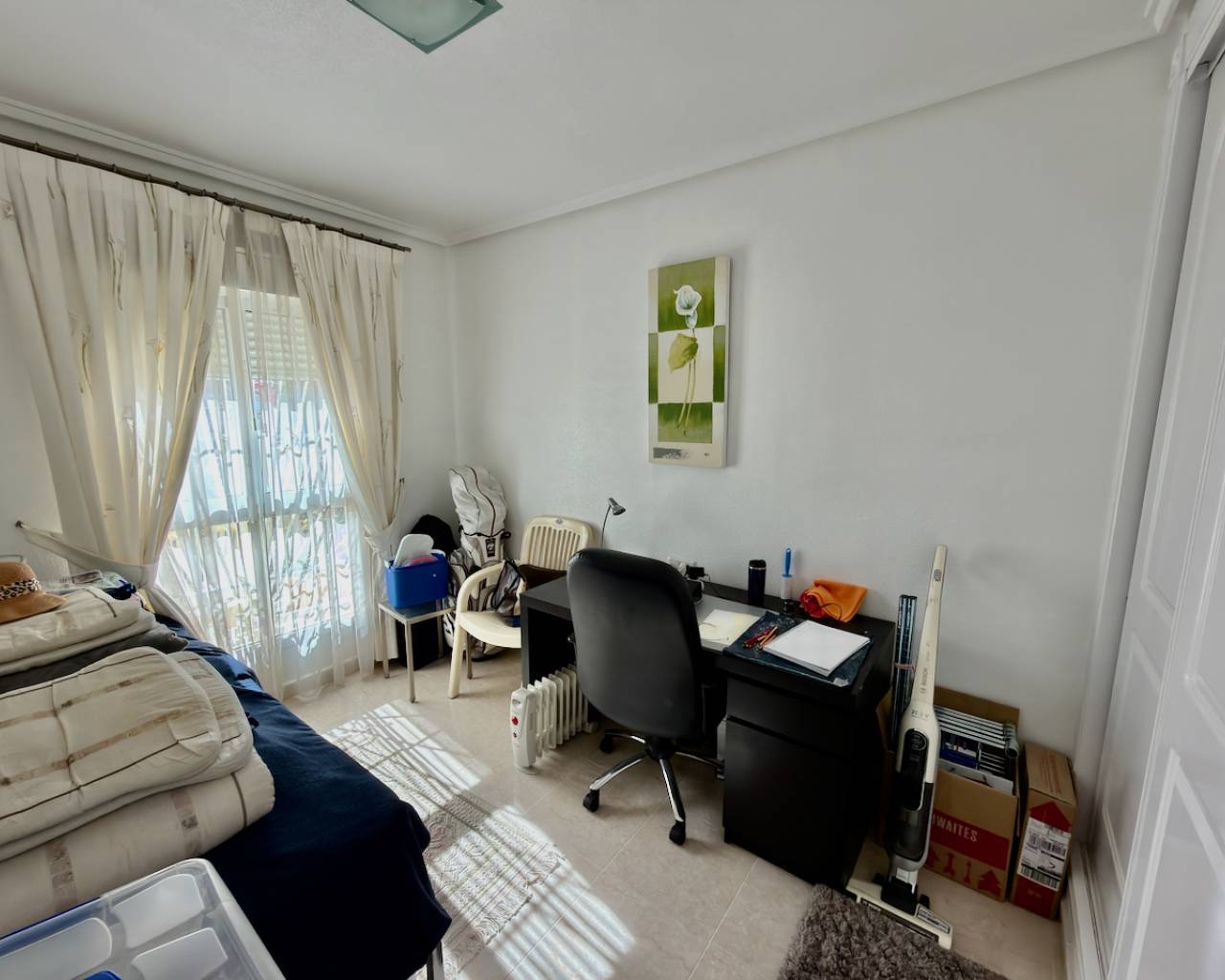 Beautiful 3-Bedroom Detached Villa with Private Garden – Walking Distance to Town This charming three-bedroom detached villa offers comfort, convenience, and excellent outdoor living. Situated in a secure gated complex, the property enjoys a south-facing orientation, allowing plenty of natural sunlight throughout the day. The villa features three spacious double bedrooms with built-in wardrobes and two bathrooms, including a private en-suite. The renovated American-style kitchen is modern and functional and connects to a useful separate utility room. Outside, the property boasts a pretty private garden, perfect for relaxing, sunbathing, or enjoying outdoor dining and barbecues. Residents also benefit from access to a communal swimming pool within the complex. One of the standout features of this villa is its fantastic location—just a short 2–3 minute walk to the town centre and local amenities, making shops, restaurants, and services easily accessible. Additional features include air conditioning, ceiling fans, white goods, off-road parking, gated entry, and street views, making this property ideal as a permanent residence, holiday home, or investment opportunity. Property Details: Bedrooms: 3Bathrooms: 2Built Area: 120 m²Plot Size: 200 m²Kitchen: 1 (American Style)Built-in Wardrobes: 3Orientation: SouthPool: Communal Distances: Beach: 10 minutesAirport: 30 minutesAmenities: 3 minutesGolf: 15 minutes