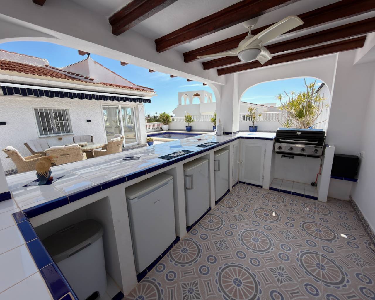 The villa’s south-facing orientation guarantees sun throughout the day, illuminating the private 10x5m swimming pool and landscaped gardens. Entertain friends and family in the fully equipped outdoor kitchen and BBQ area, complete with a bar, outdoor shower, and toilet, or unwind on the private solarium while enjoying uninterrupted views over the pool and gardens. This property captures the essence of outdoor Mediterranean living with ample space for relaxation, dining, and social gatherings.