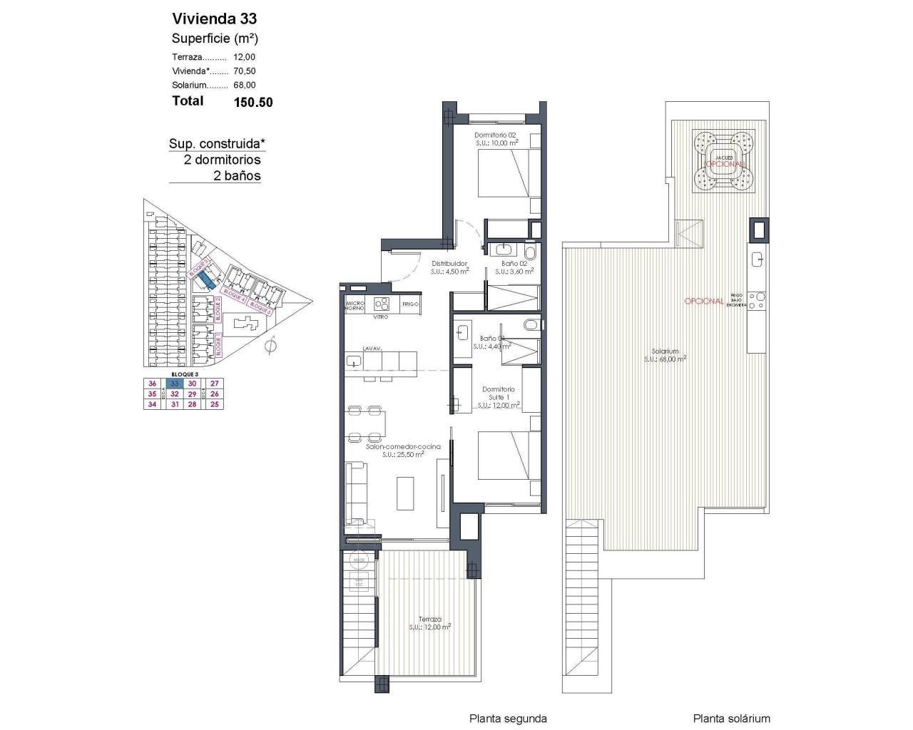 New Build Resort Apartments at La Serena Golf-Los Alcazares Near the Beach Modern Golf Front Living on the Costa Calida Discover this exclusive new build residential resort located at La Serena Golf in Los Alcazares. This contemporary development features 66 stylish apartments with 2 or 3 bedrooms and 2 bathrooms, one of them en suite, designed to offer comfort, elegance and an exceptional Mediterranean lifestyle just 300 meters from the Mar Menor. Los Alcazares is a charming coastal town known for its relaxed atmosphere, sandy beaches and long seaside promenade. With more than 300 days of sunshine per year, the area offers a perfect environment for outdoor living, water sports and golf. The town also provides a wide selection of restaurants, shops, marinas and sports facilities, making it a highly desirable destination for both permanent residence and holiday homes. Apartments with Terraces, Gardens and Private Solariums The residential complex offers several property types to suit different lifestyles. Buyers can choose between ground floor apartments with private gardens, middle floor homes with spacious terraces or penthouses with terraces and large rooftop solariums. The solariums include an outdoor shower and offer the option to add a summer kitchen and private jacuzzi, creating an ideal space for relaxation and entertaining while enjoying open views of the golf course and surrounding landscape. Each home has been designed with bright interiors and open plan living spaces that connect seamlessly with the outdoor areas. Resort Style Amenities and Exceptional Communal Areas One of the most distinctive features of this development is its resort style concept. Residents can enjoy a spectacular lagoon style swimming pool of approximately 190 m2 with beach style access and relaxing areas with Balinese beds. Additional communal facilities include landscaped gardens, a spa area, gym and sauna located in the basement level. The complex also offers a children playground, two petanque courts and communal restrooms near the pool area, creating a welcoming environment for residents and guests. Quality Finishes and Modern Features The apartments are built with modern materials and high quality specifications designed for comfort and style. Fully equipped kitchen with white glass finish appliances Bathrooms with vanity units, shower screens and backlit mirrors Motorized window shutters Basic lighting package Fully installed ducted air conditioning Underground parking space for each property Underground bicycle parking and optional storage rooms Prime Location Close to Beach and Golf Mar Menor beach 0.3 km La Serena Golf next to the development Los Alcazares town center 2 km Cartagena 22 km Murcia 40 km Region de Murcia International Airport 30 km Alicante Elche Airport 90 km The calm and shallow waters of the Mar Menor are ideal for swimming, sailing and paddle surfing throughout the year. Secure Your Home at La Serena Golf Resort These modern apartments combine beachside living, golf views from most units and resort style amenities in one of the most attractive areas of the Costa Calida. Contact us today to receive more information or arrange a visit and secure your new home in La Serena Golf-Los Alcazares. 456